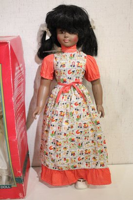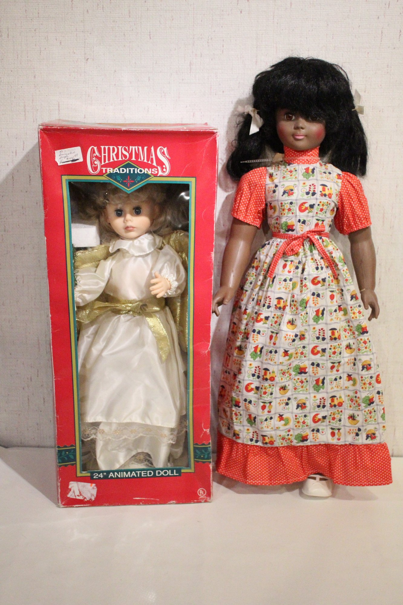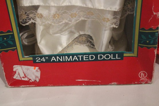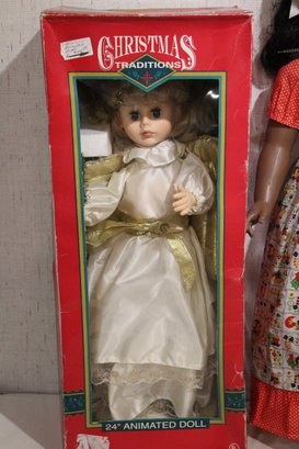 A vintage Telco Motionette animated Christmas angel figurine 24", and a large vintage doll, 30" tall. These items can be shipped.