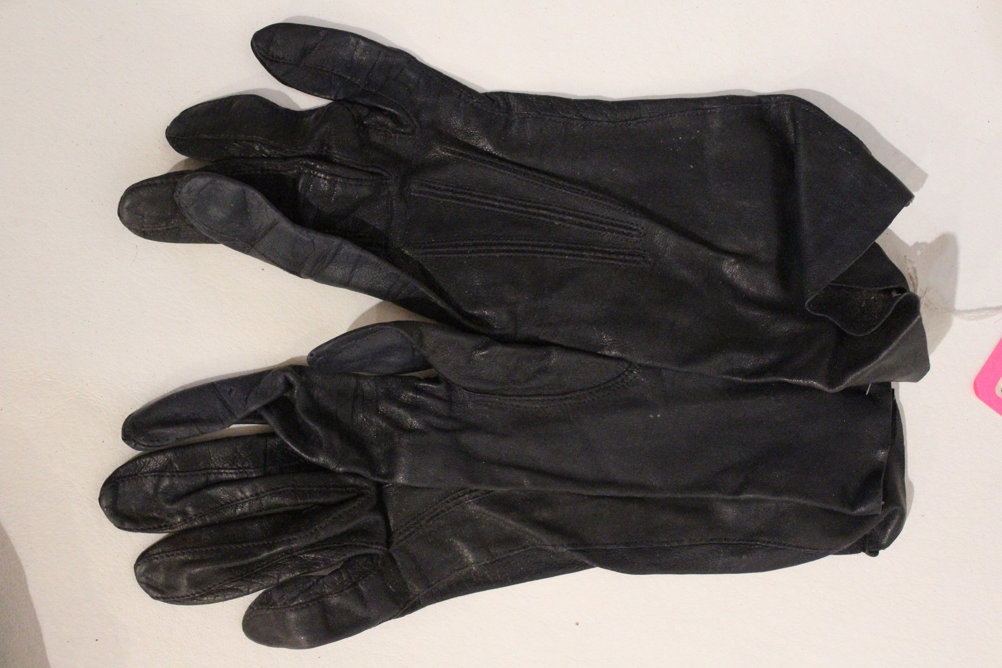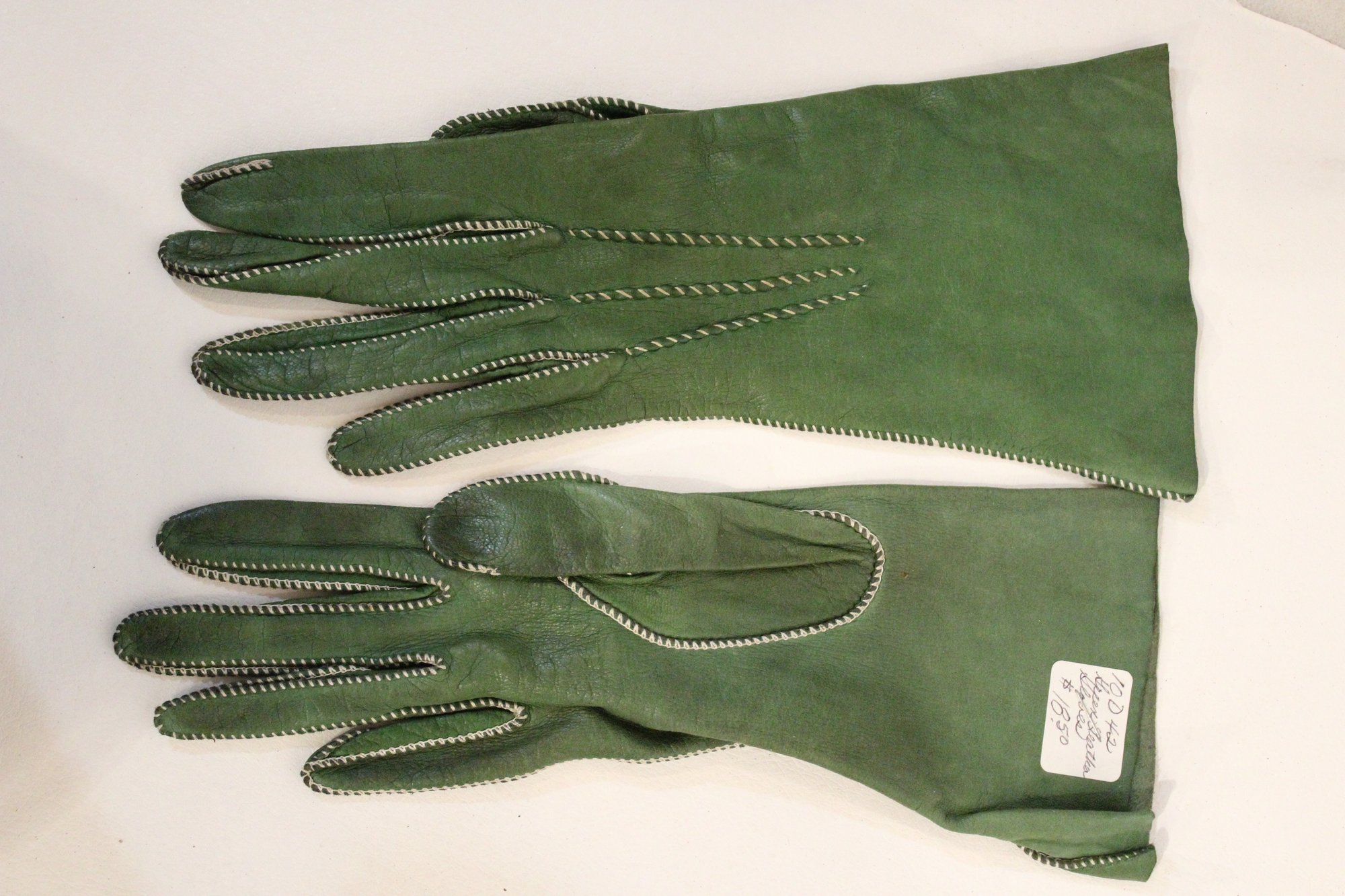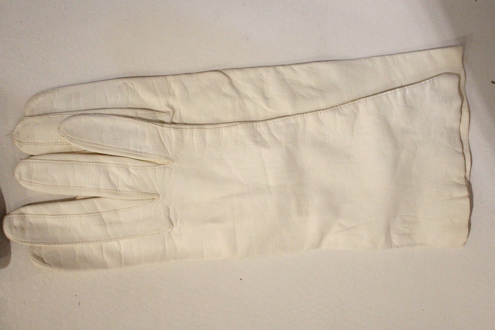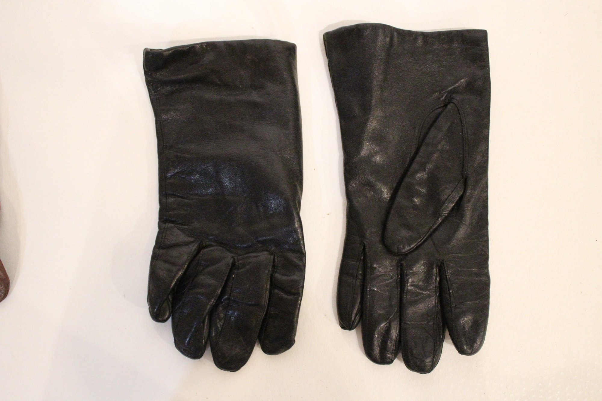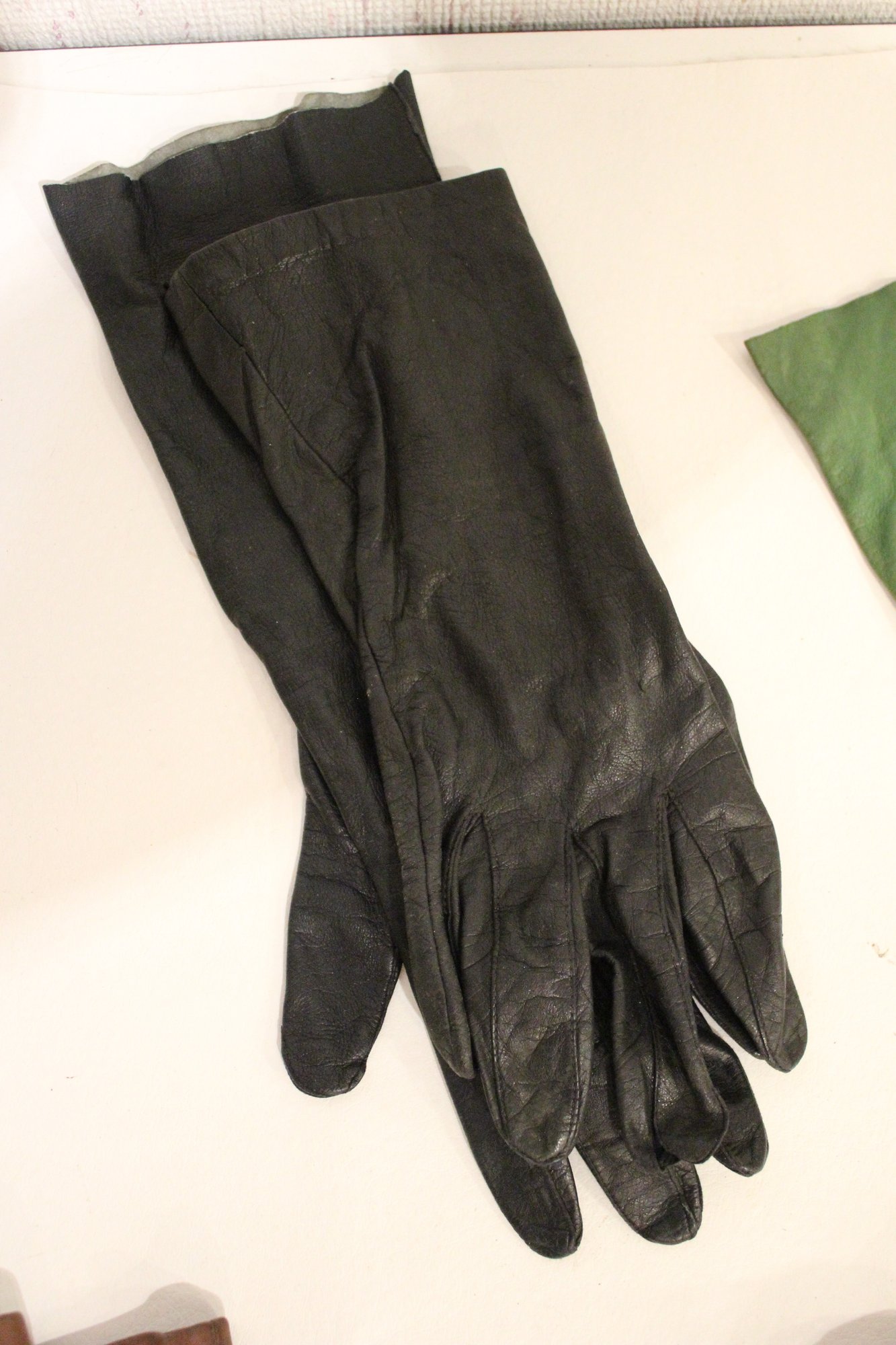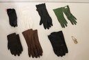 seven pairs of vintage women's faux leather, and leather gloves in various colors and lengths, as well as one small gold-toned hands accessory, size 6.5 to 7. These items can be shipped.