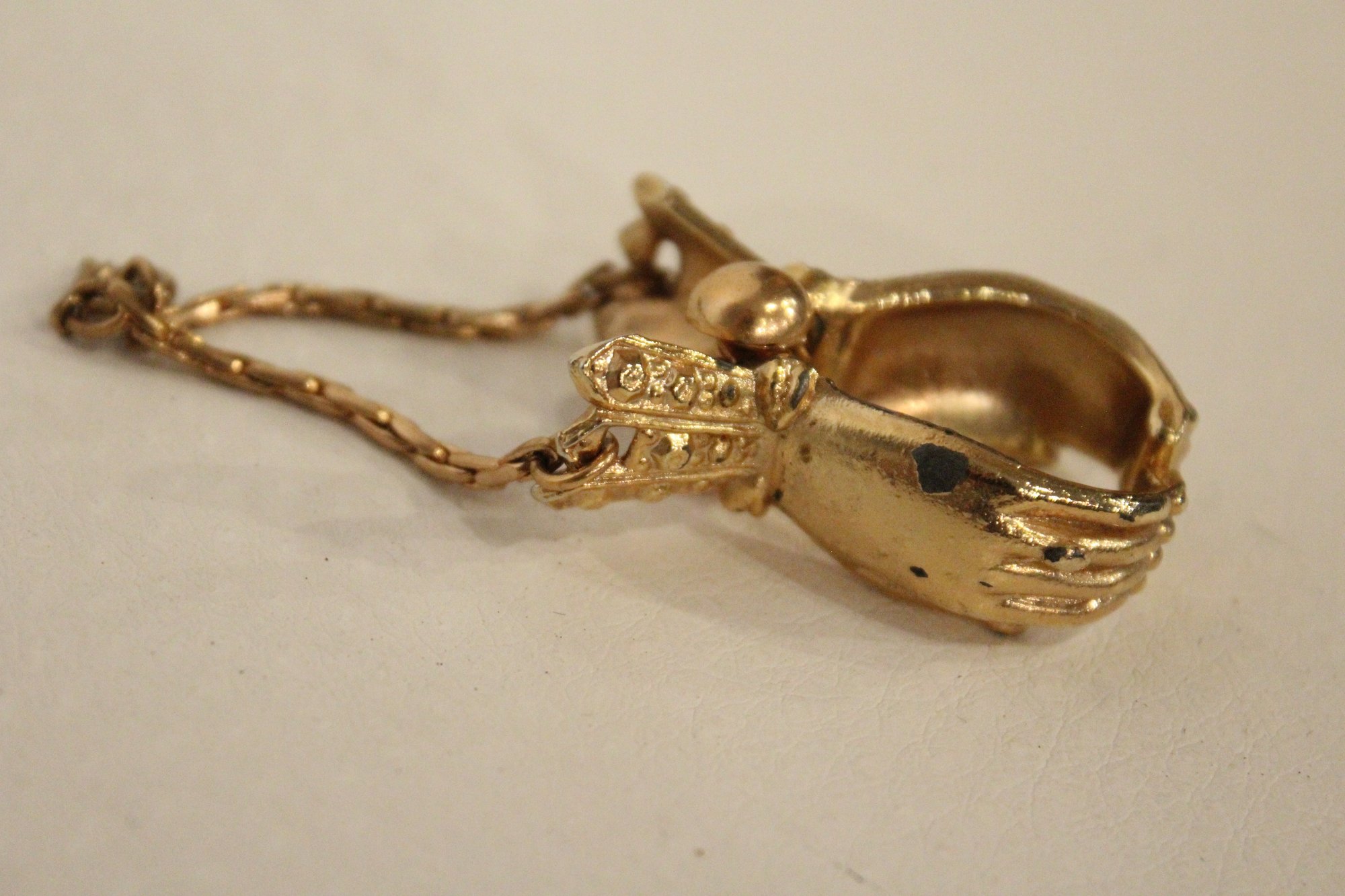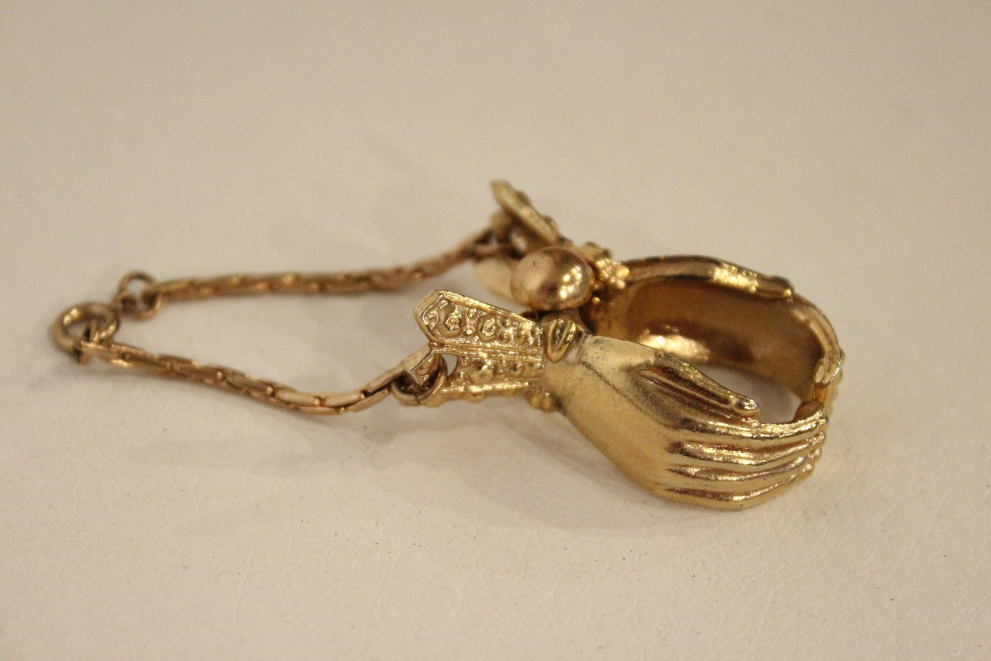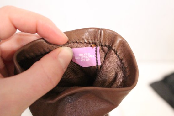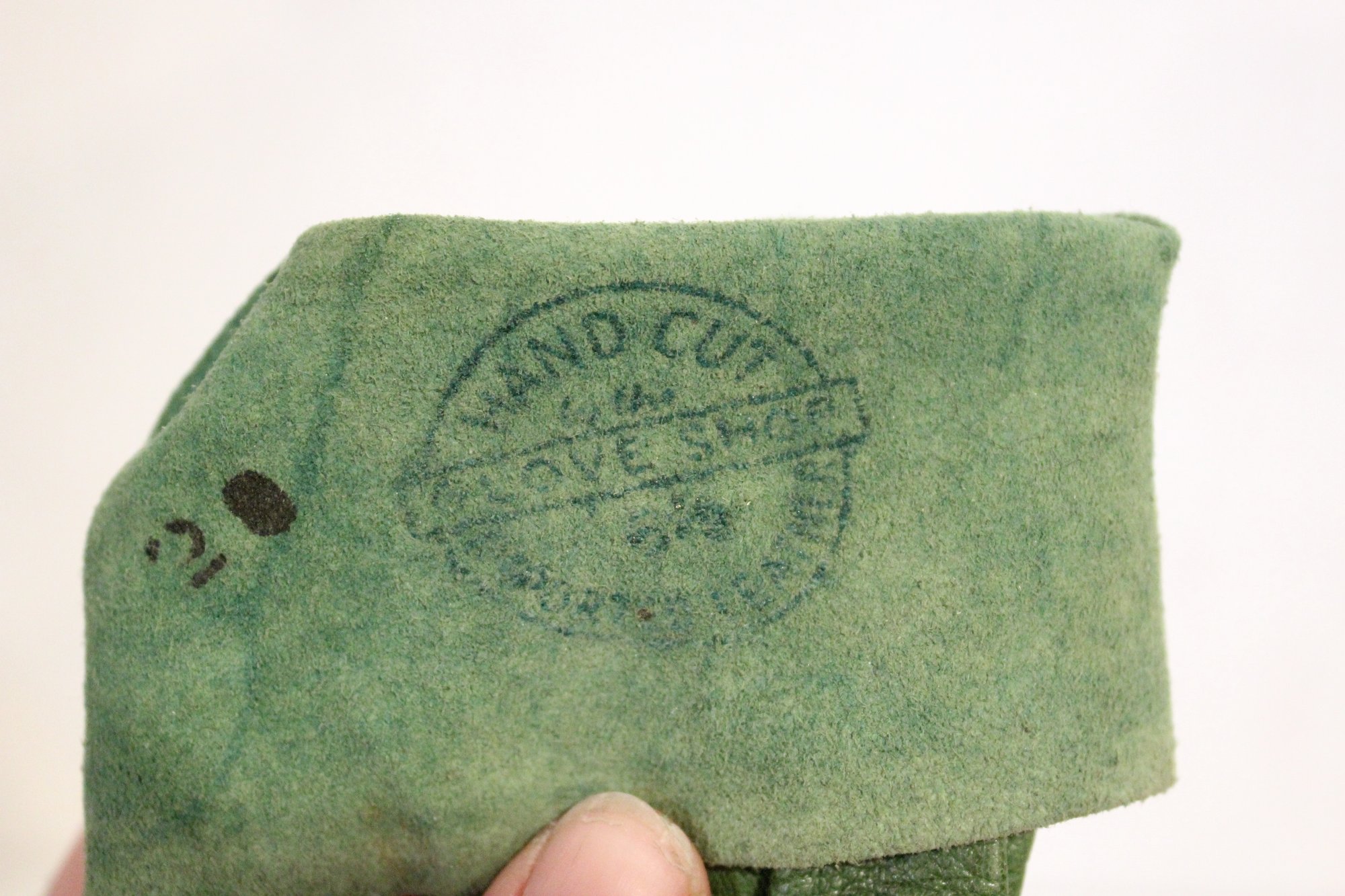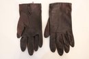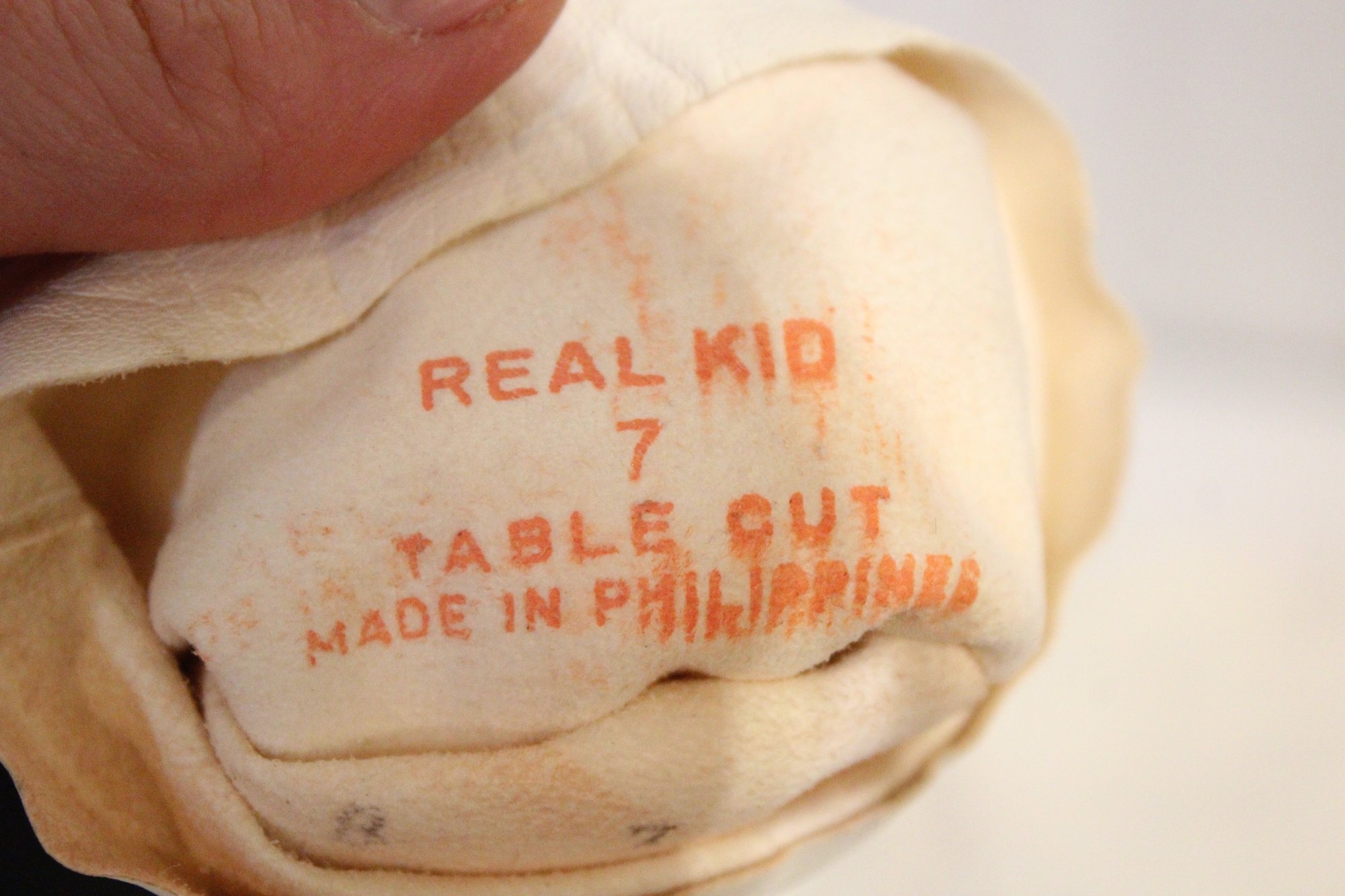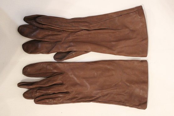 seven pairs of vintage women's faux leather, and leather gloves in various colors and lengths, as well as one small gold-toned hands accessory, size 6.5 to 7. These items can be shipped.