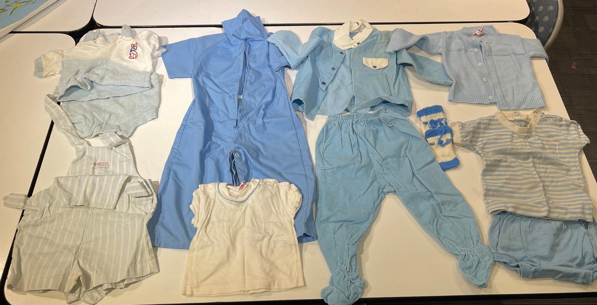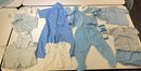 12 piece set of vintage baby lue clothes, various sizes.