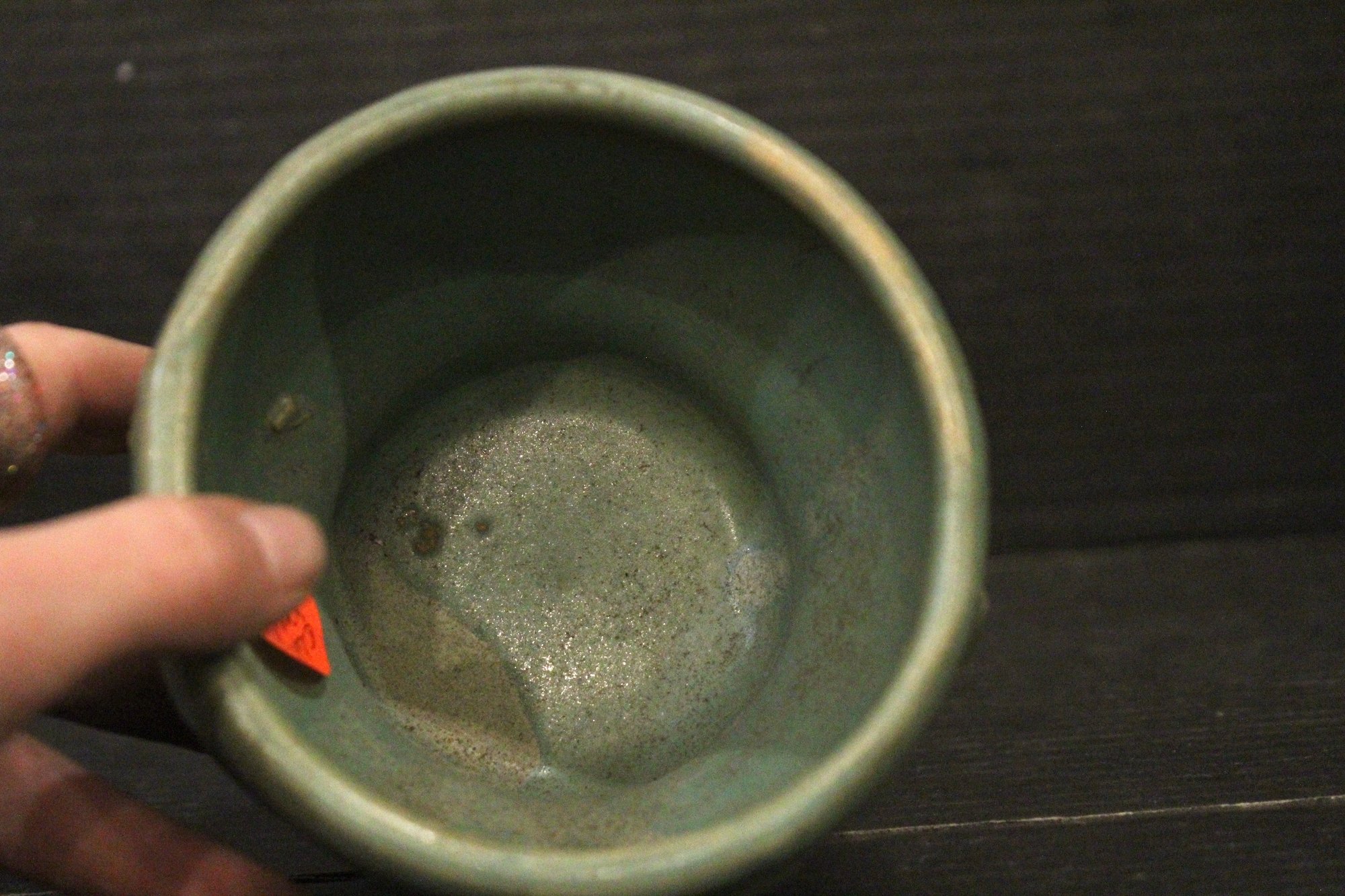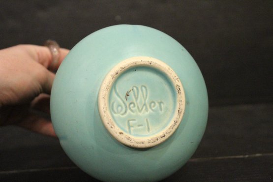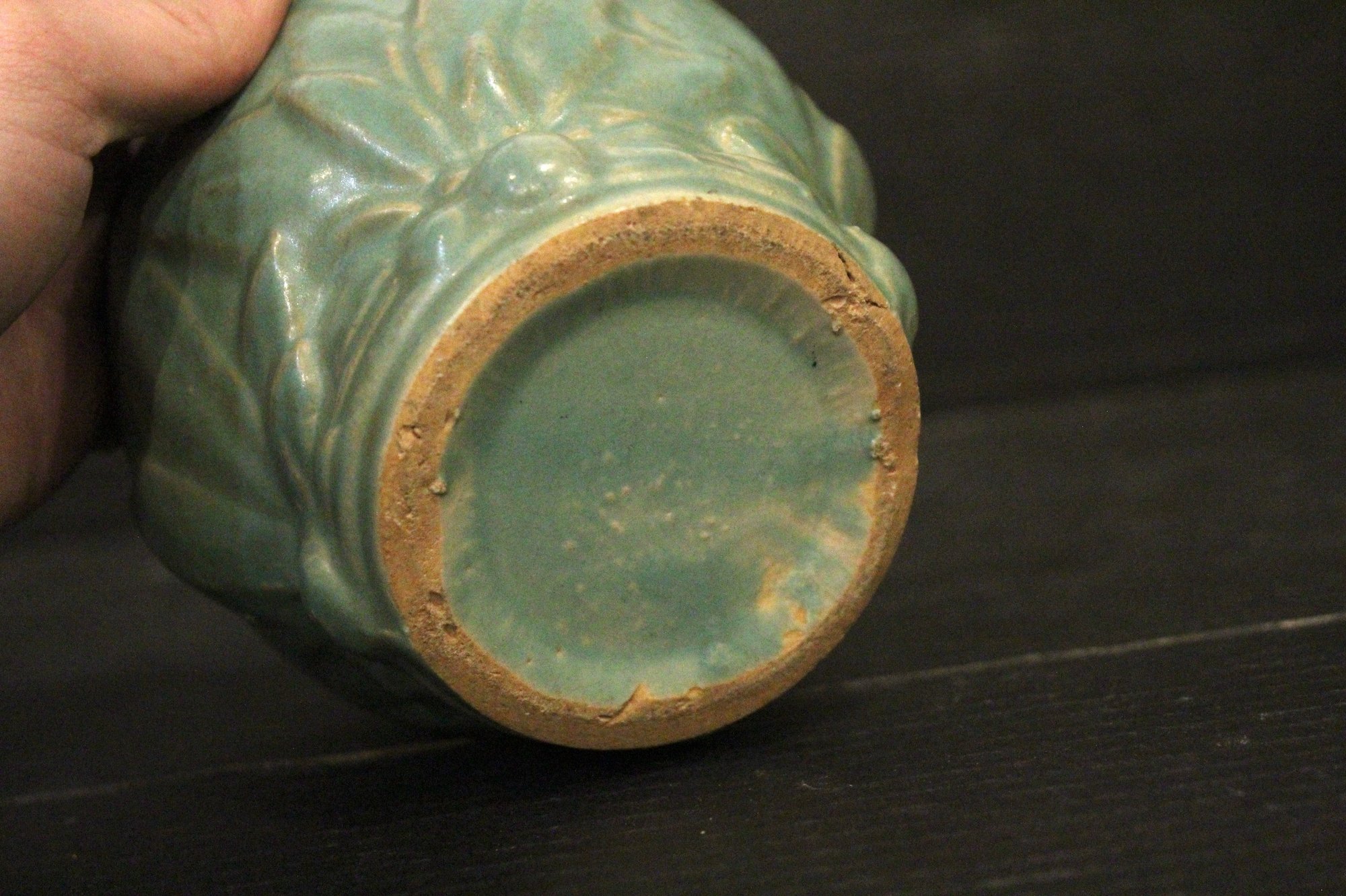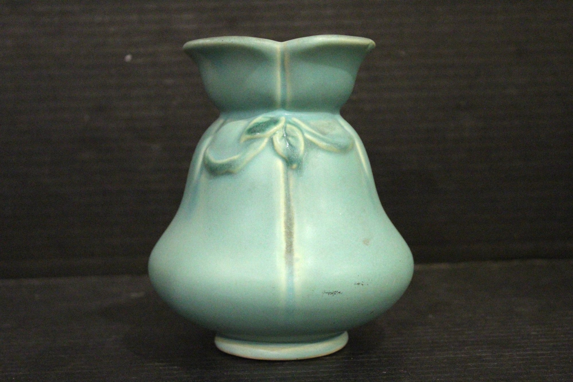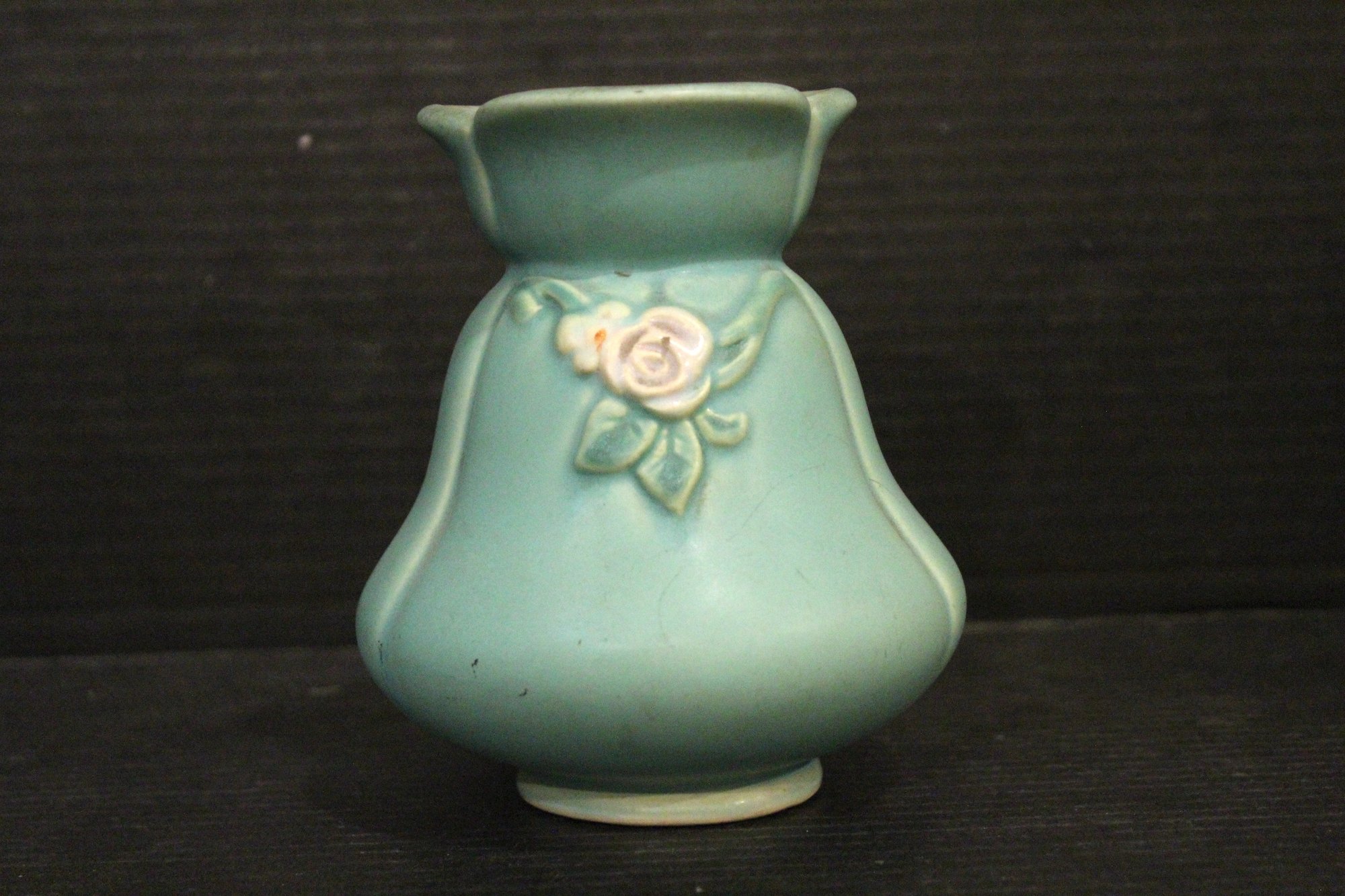 vintage Weller Pottery Green Floral Sweet Pea Vase F-1, 6" tall