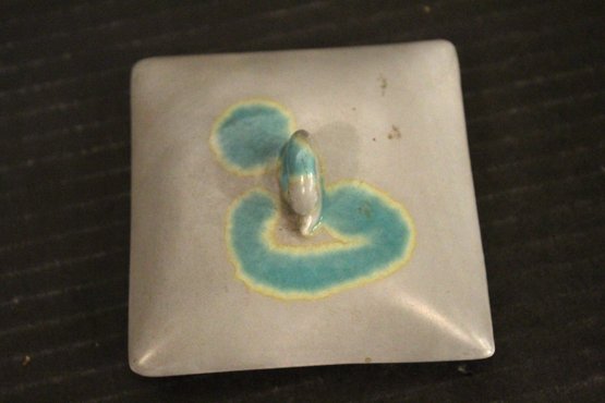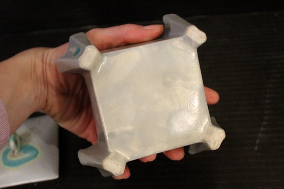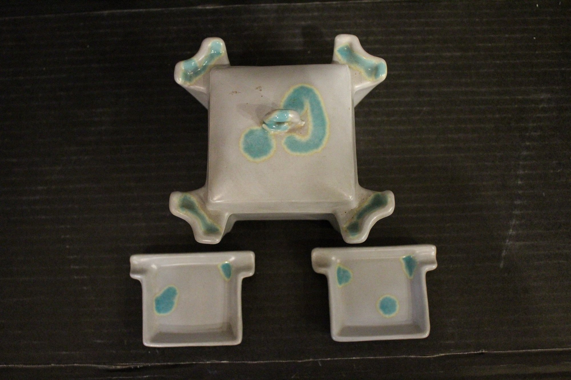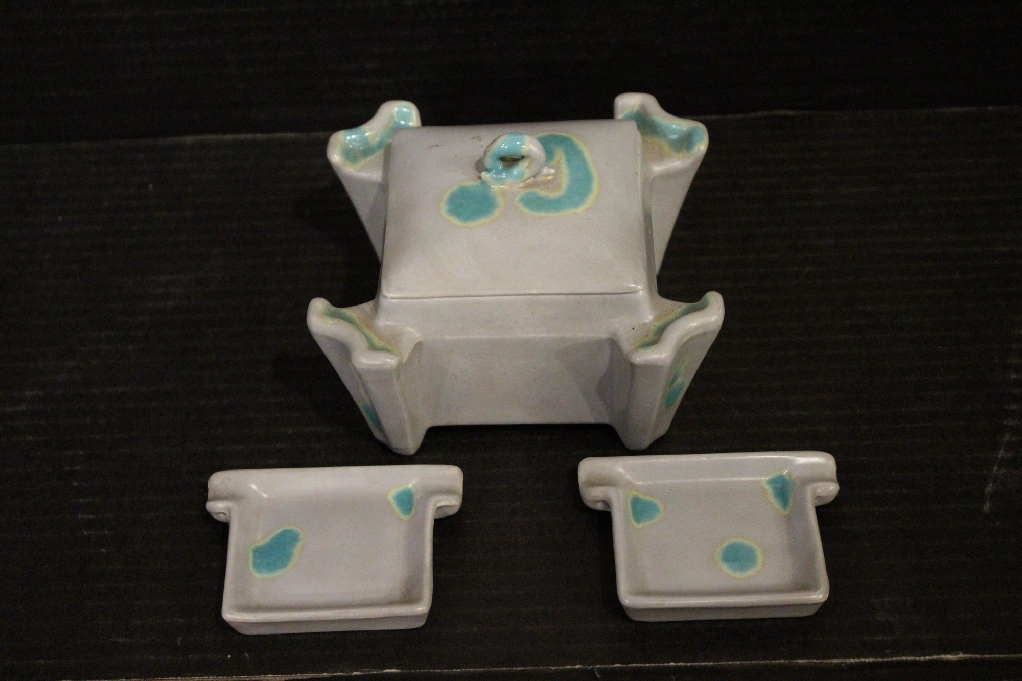 vintage McCoy Pottery planter set with a lid and two small trays, 5" x 3", and 2" x 3". These items can be shipped.
