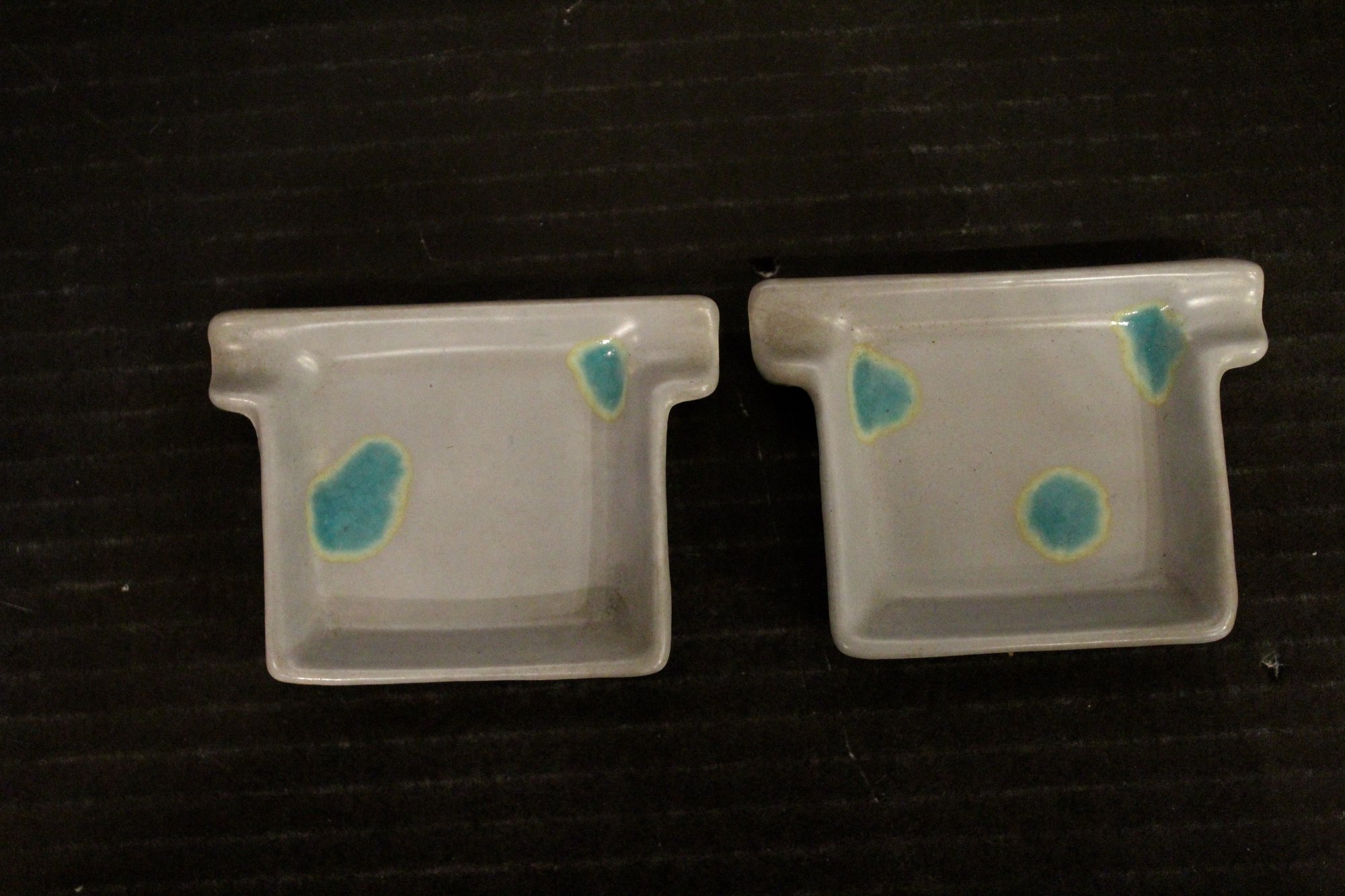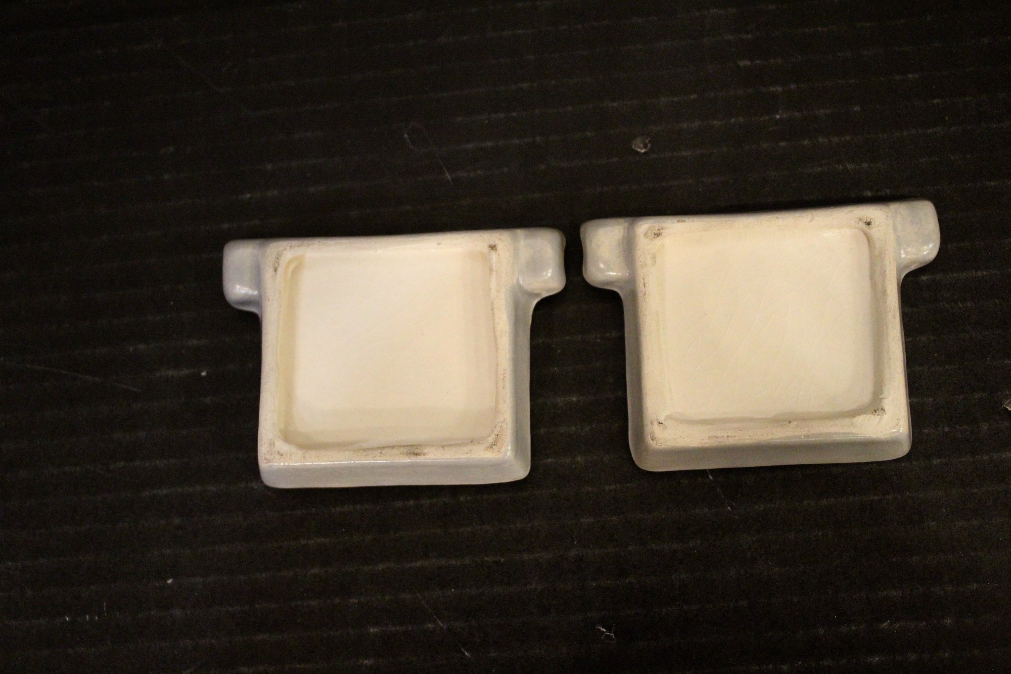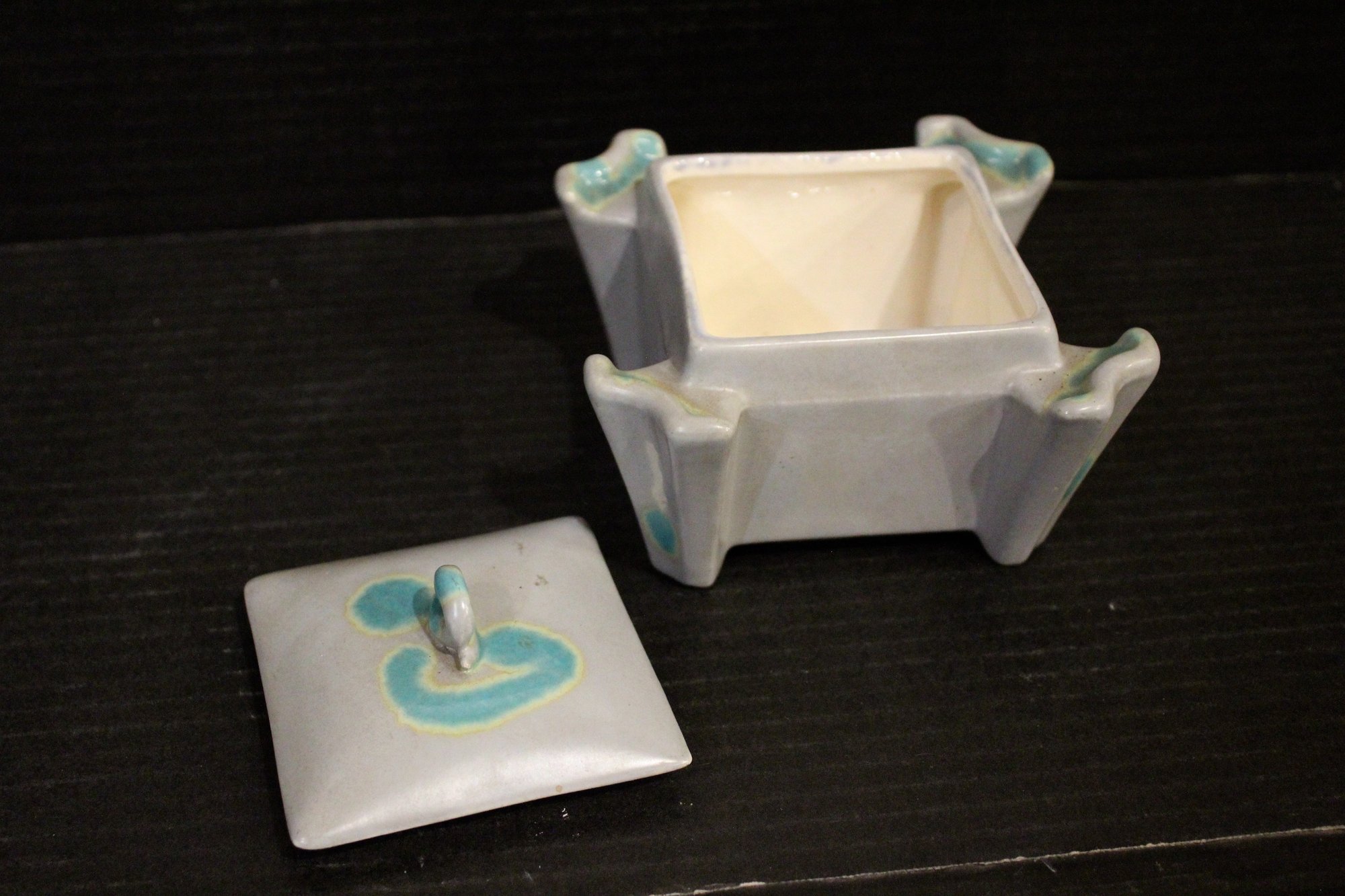 vintage McCoy Pottery planter set with a lid and two small trays, 5" x 3", and 2" x 3". These items can be shipped.