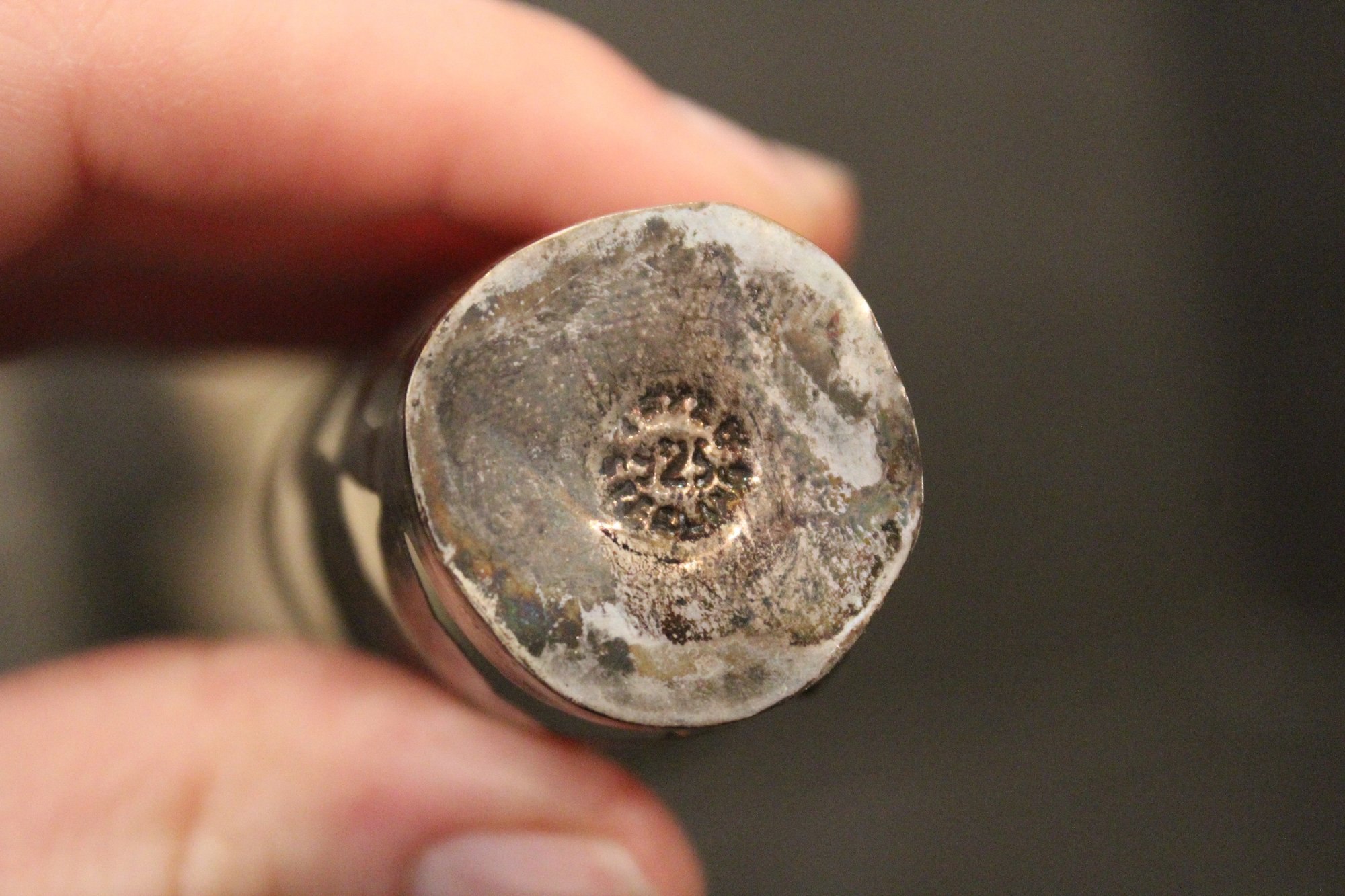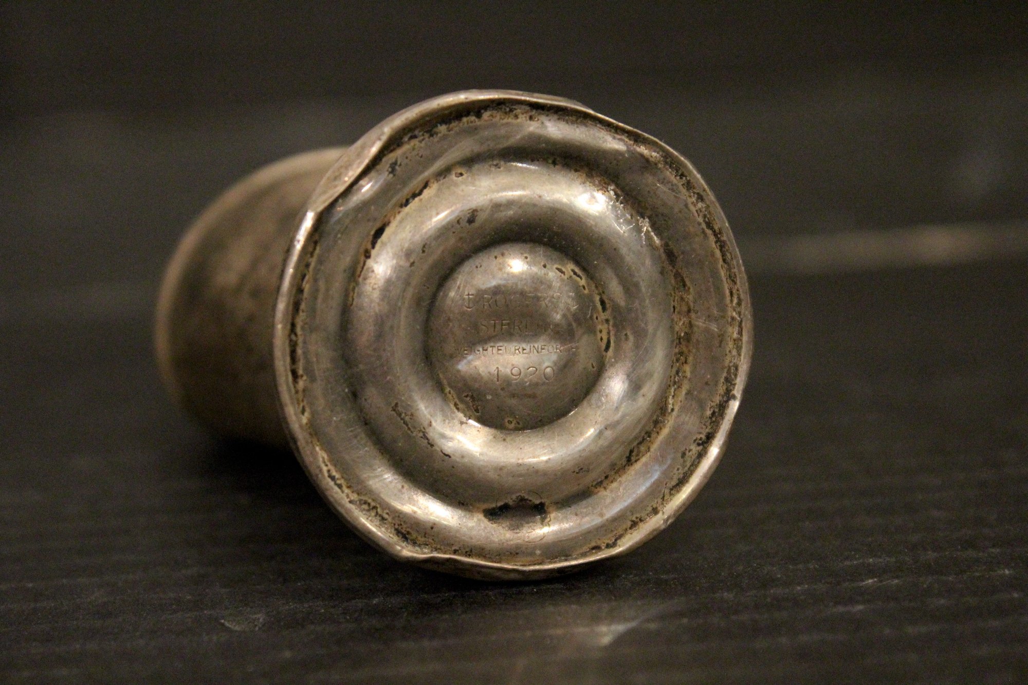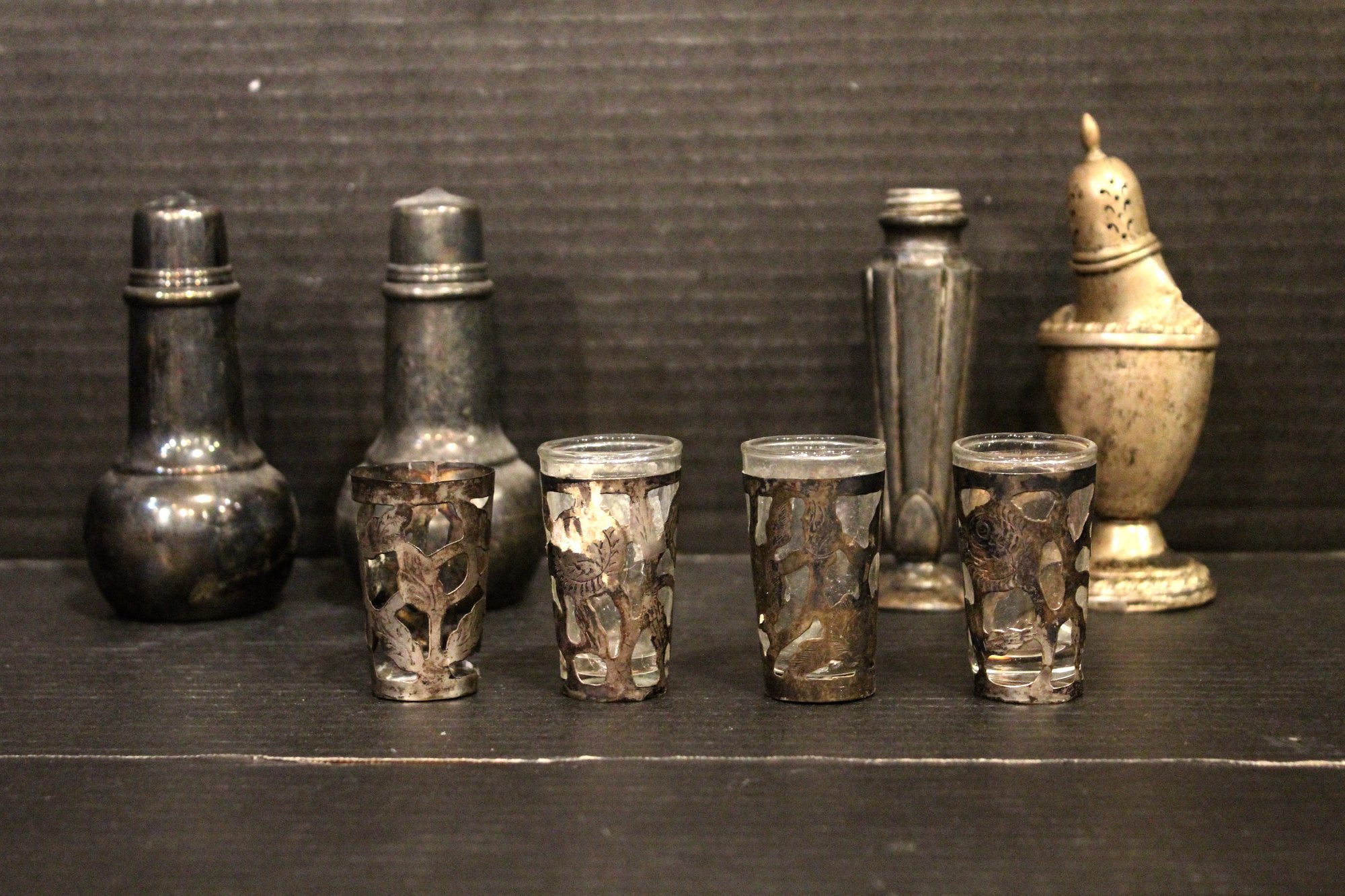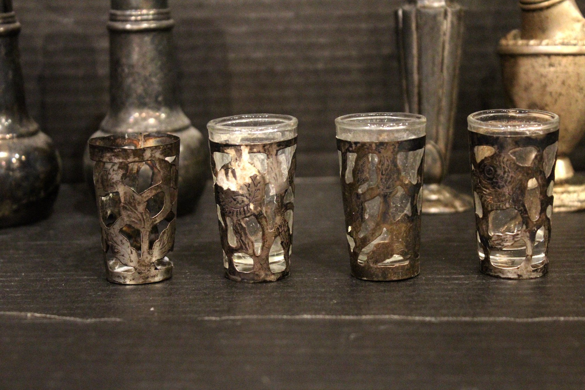 a set of 4 vintage Mexican 925 sterling silver overlay shot glasses 2", (the glass is missing in one cup) the small cups match the pitcher (lot number 351, Haig & Haig Pinch Dimple Whisky Bottle, Sterling Silver Overlay).