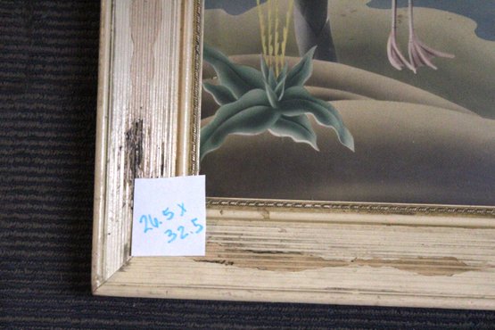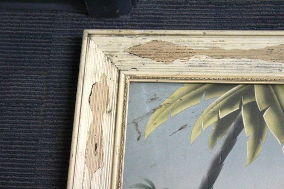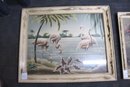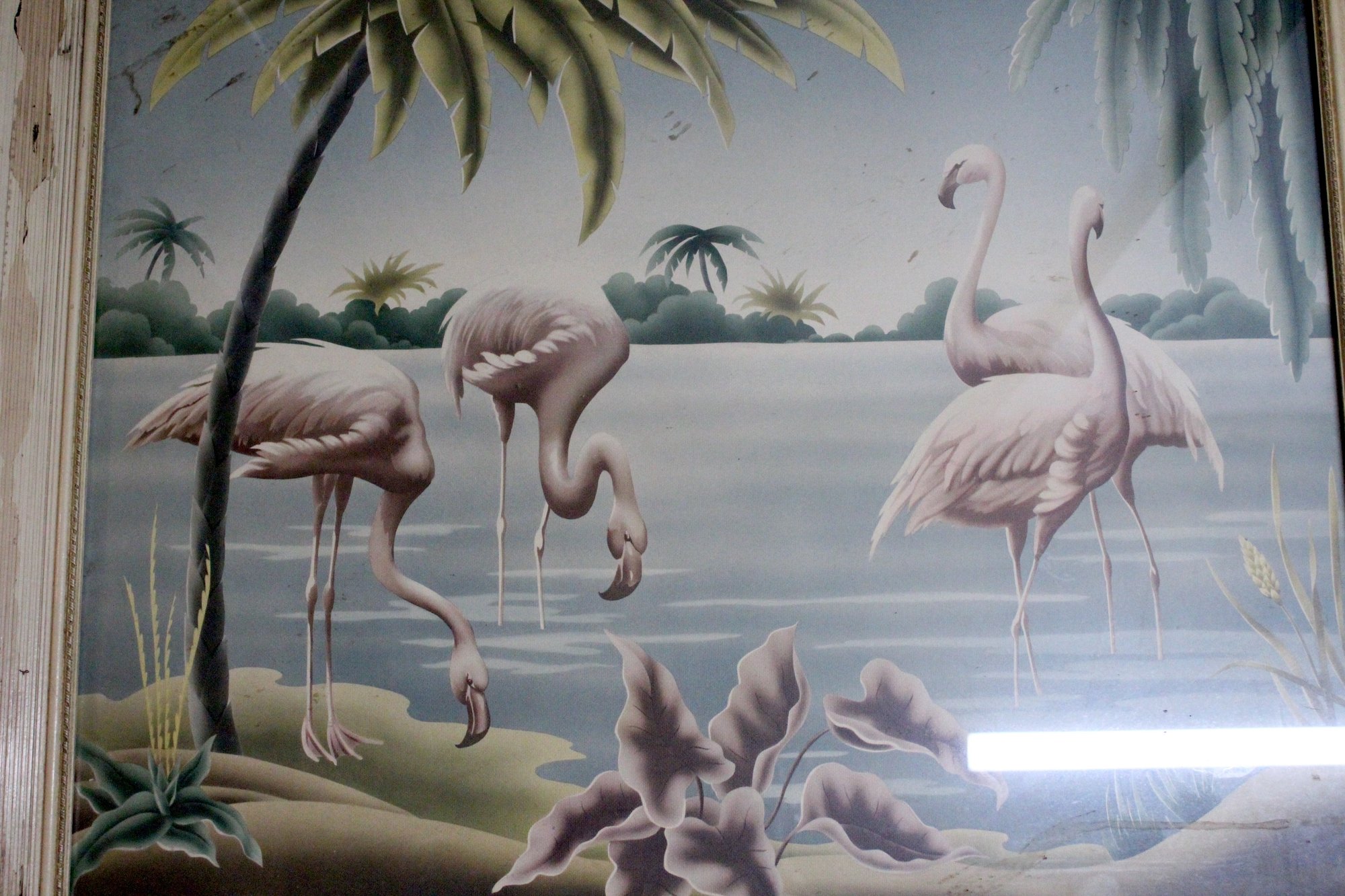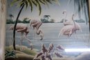 vintage mid-century Turner airbrushed flamingo print in a distressed wood frame, frame once had something glued on it.