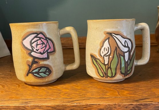 Mugs with floral design, mid- century vintage. One has a rose, the other has lilies on a beige background. Very small chips in rims.