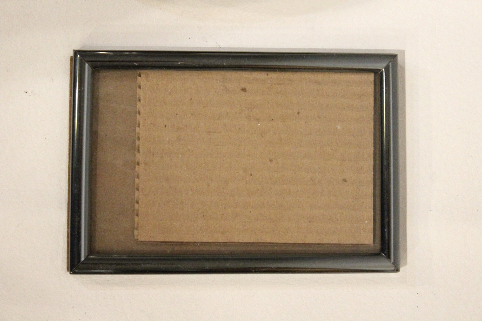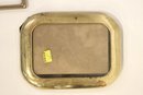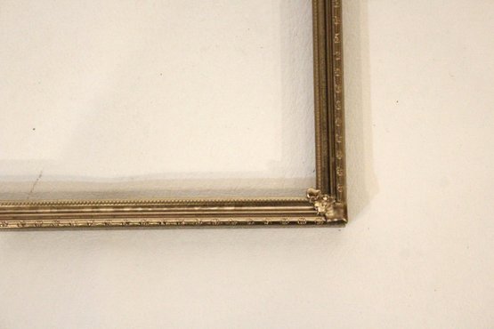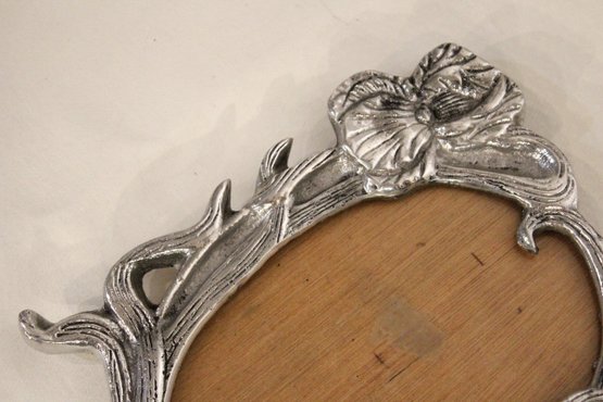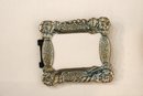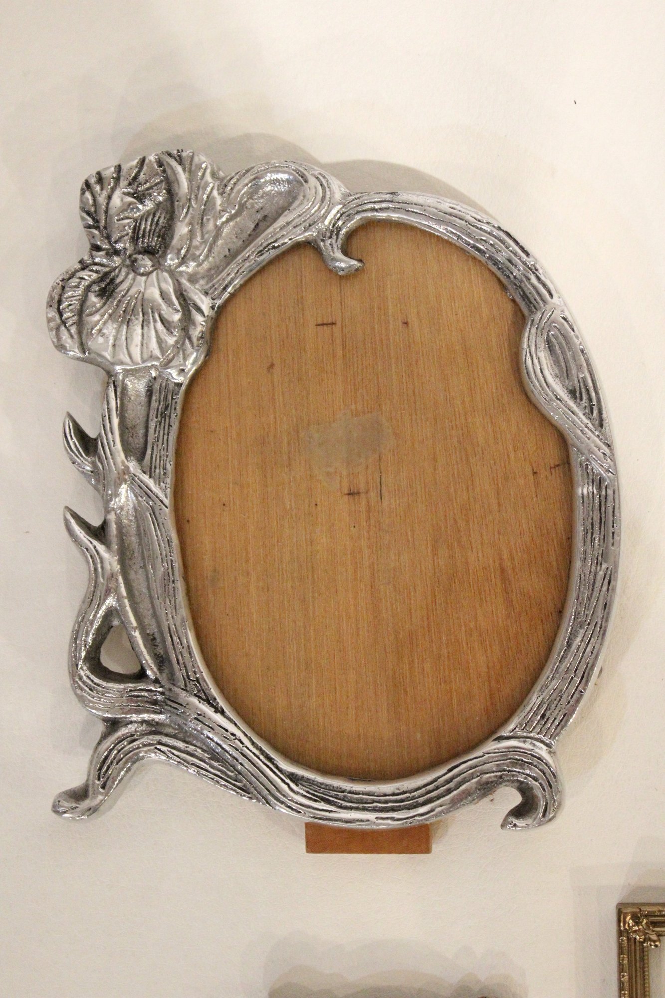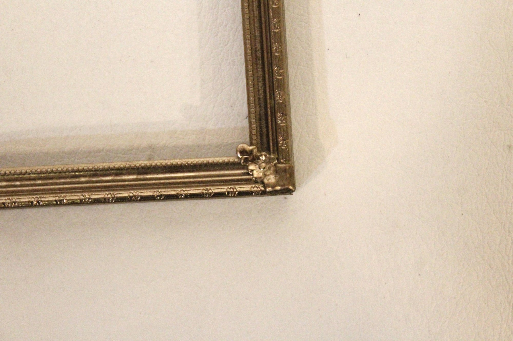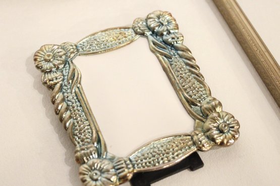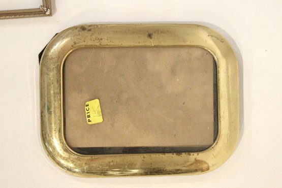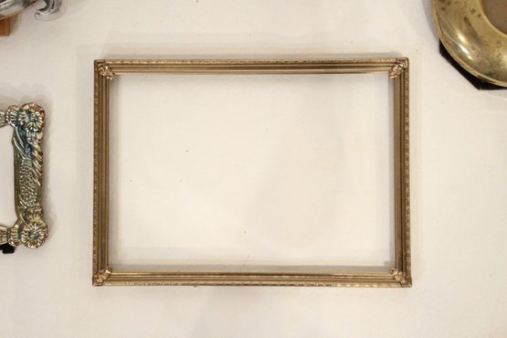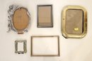 A collection of vintage picture frames, featuring various ornate gold toned and silver-toned metal designs. An ornate asymmetric metal frame 8" x 7", a simple black metal frame 6" x 4", a vintage MCM gold toned puffy picture frame 8.5" x 7", a baroque style silver toned picture frame 3.5" x 3", lastly a gold toned metal frame with a repeating floral design 5" x 7". These items can be shipped.