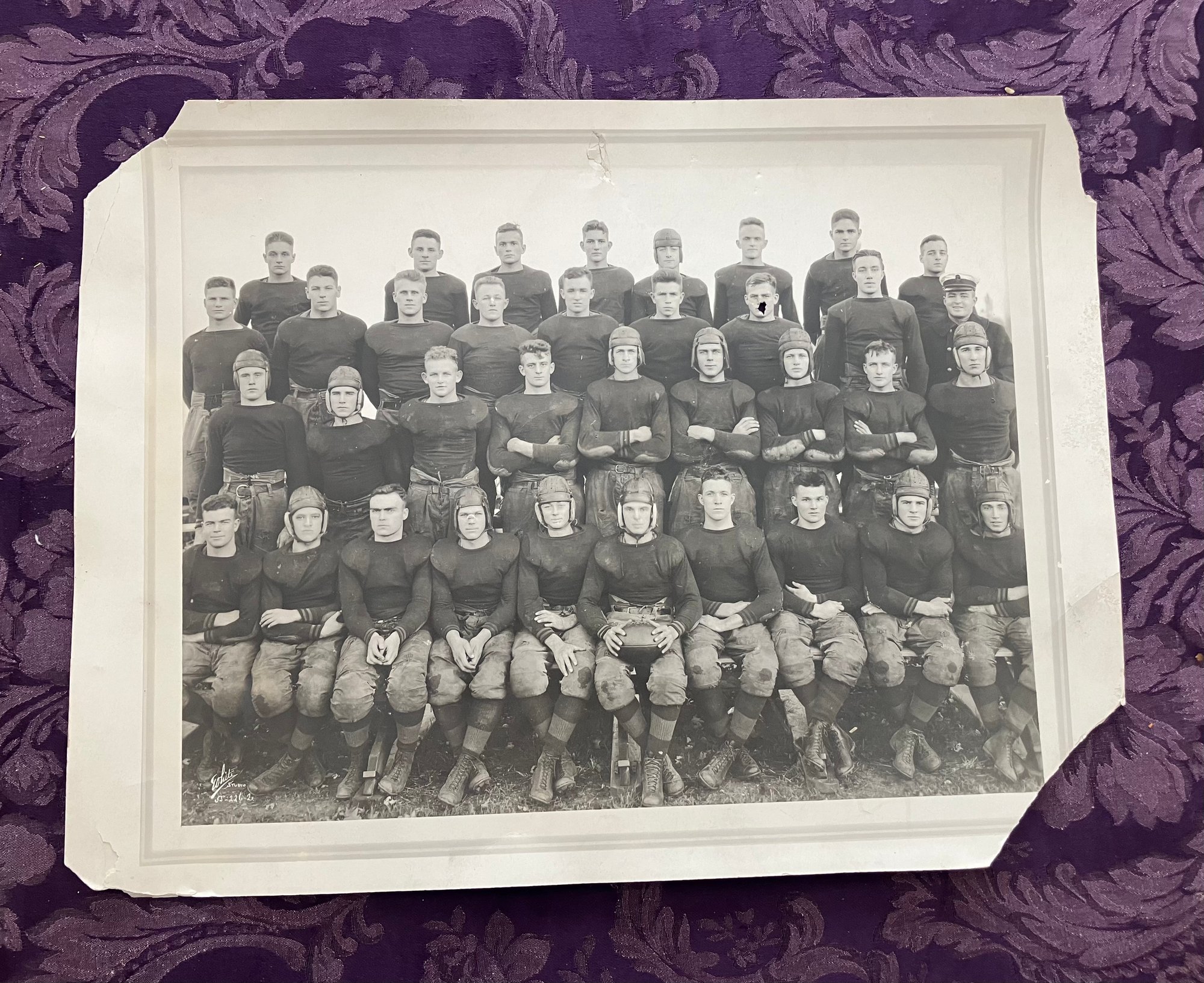 Vintage photo football team with Leather Helmets. There are some issues with the photo - torn corners, a hole on the top where it was hung and a hole in the face of one of the players. Photo measures 12 " x 16"