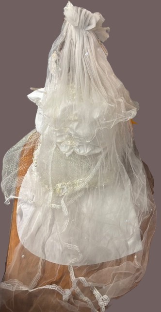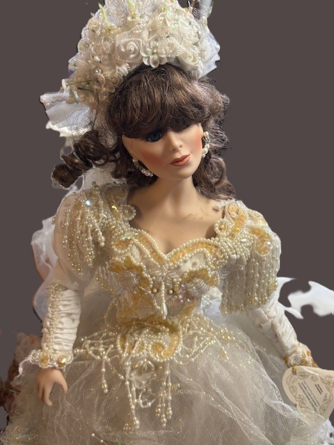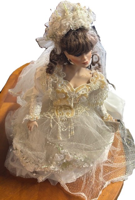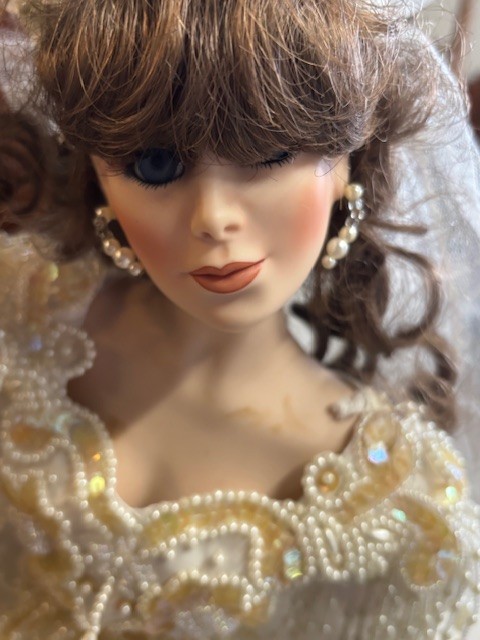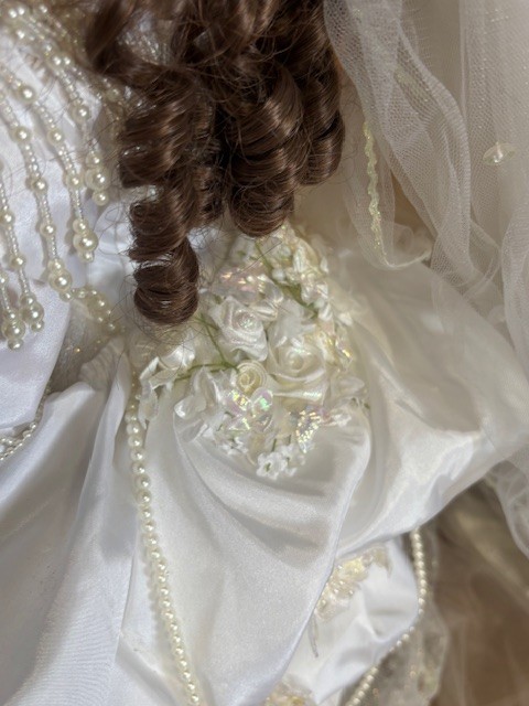 Vintage porcelain bride doll "Vanessa" by franklin Mint 23" - All garments intact, missing shoes comes with stand, long train and good hair and gown. No box body parts are all there to our knowledge. Shipping is available
