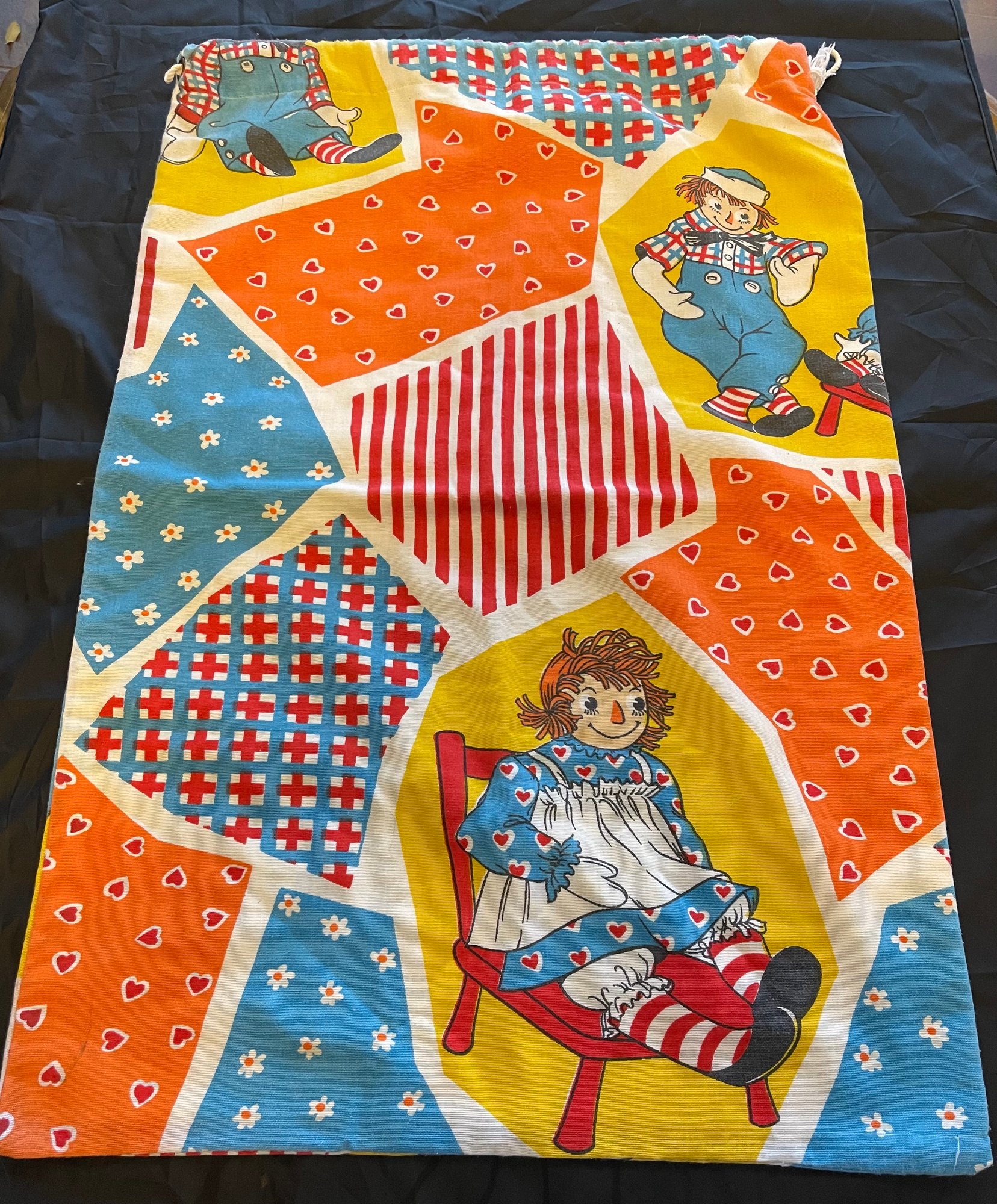 29 inches long, 20 inches wide drawstring laundry bag. subtle grey stain marks - see photo