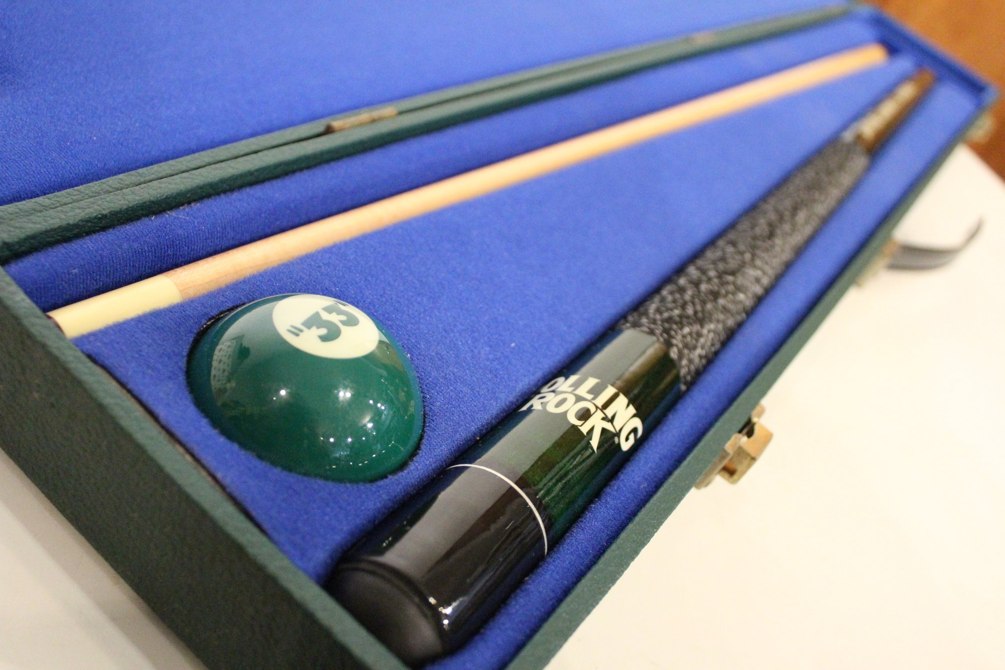 Vintage Rolling Rock Latrobe PA Brewing Co. Green and gold case with a green and black cue stick with black and white cord. The handle of the case is broken and missing the right attachment as can be seen in the 13th photo. This item can be shipped.