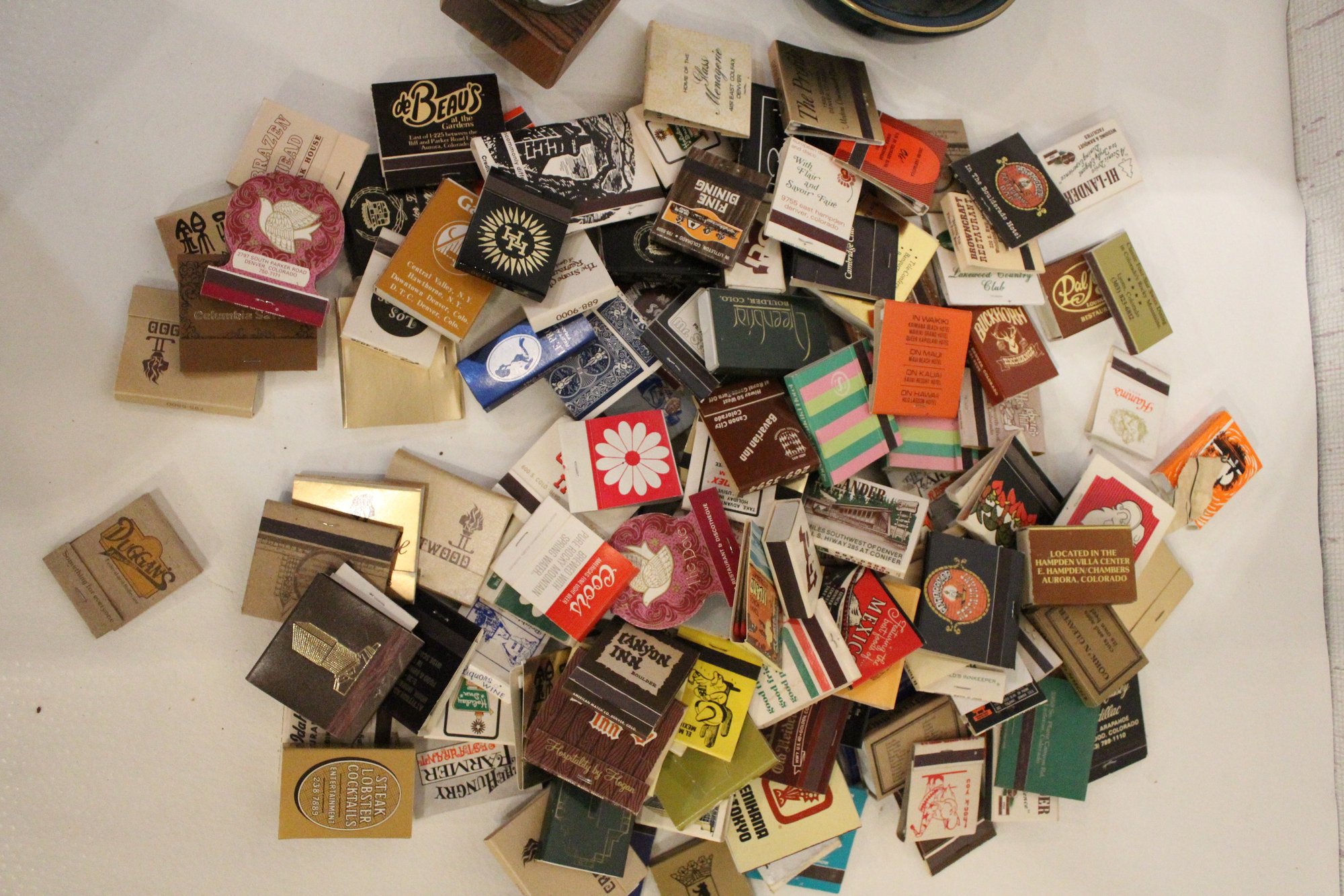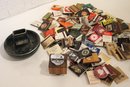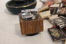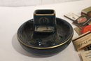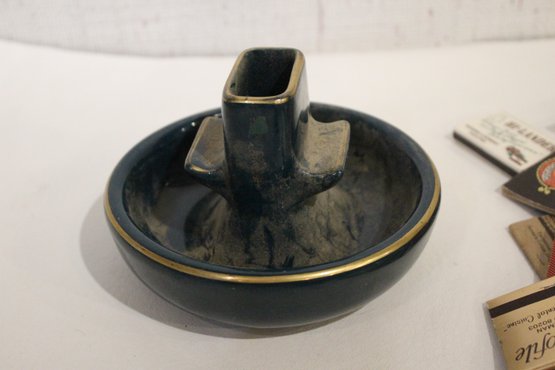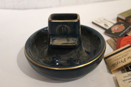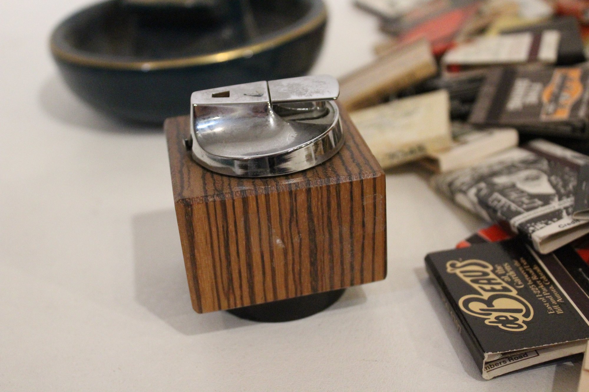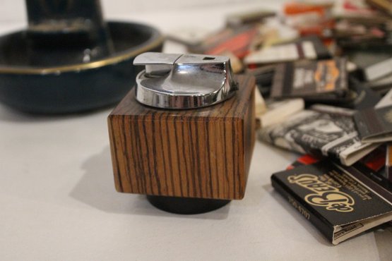 vintage Ronson Varaflame "Ambassador" table lighter with a chromed steel top and a Brazilian rosewood (or similar wood) cube-shaped base 3" x 3", a black and gold ceramic ash tray 6" x 4", and a large pile of vintage matches. These items can be shipped.