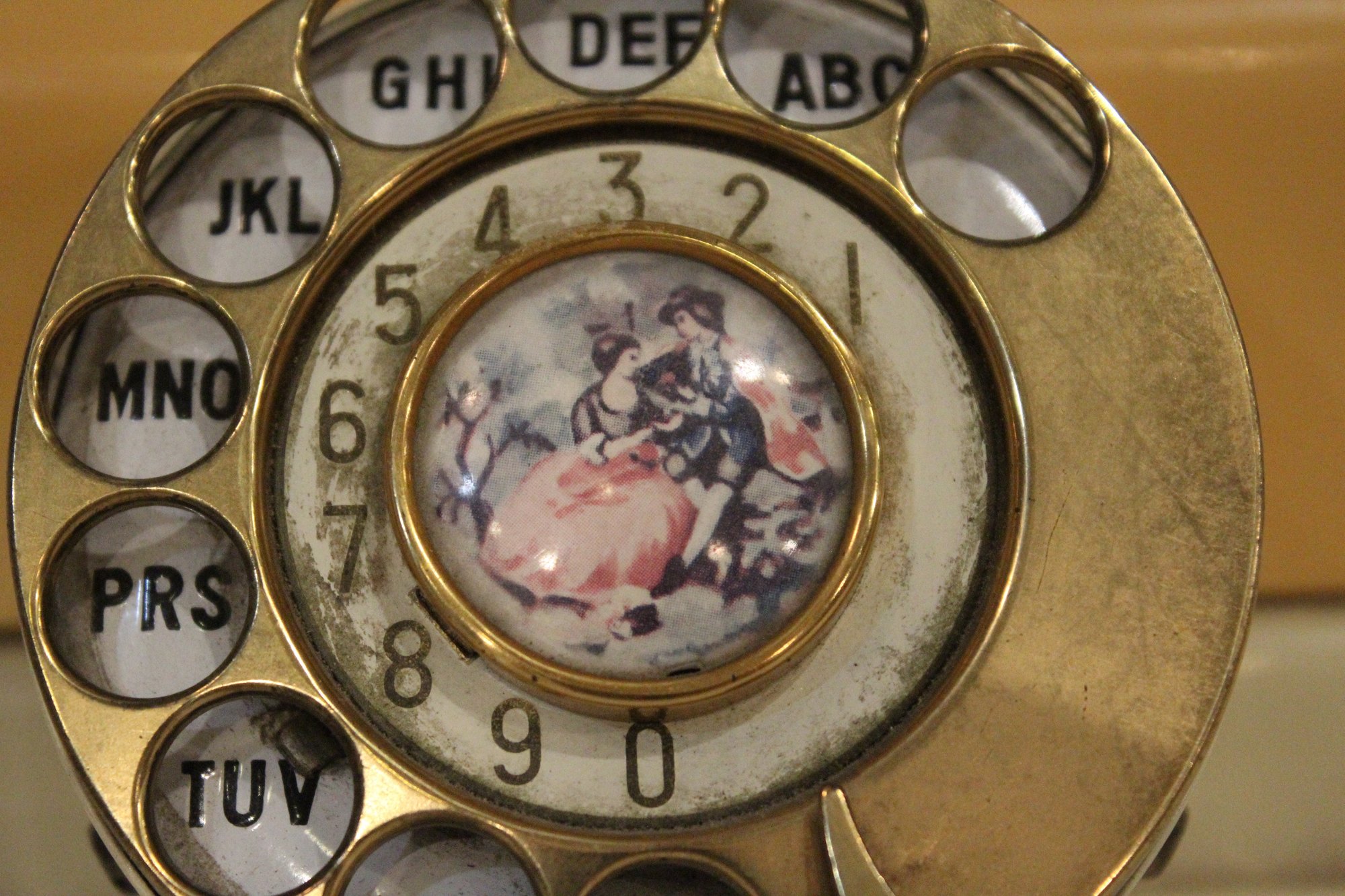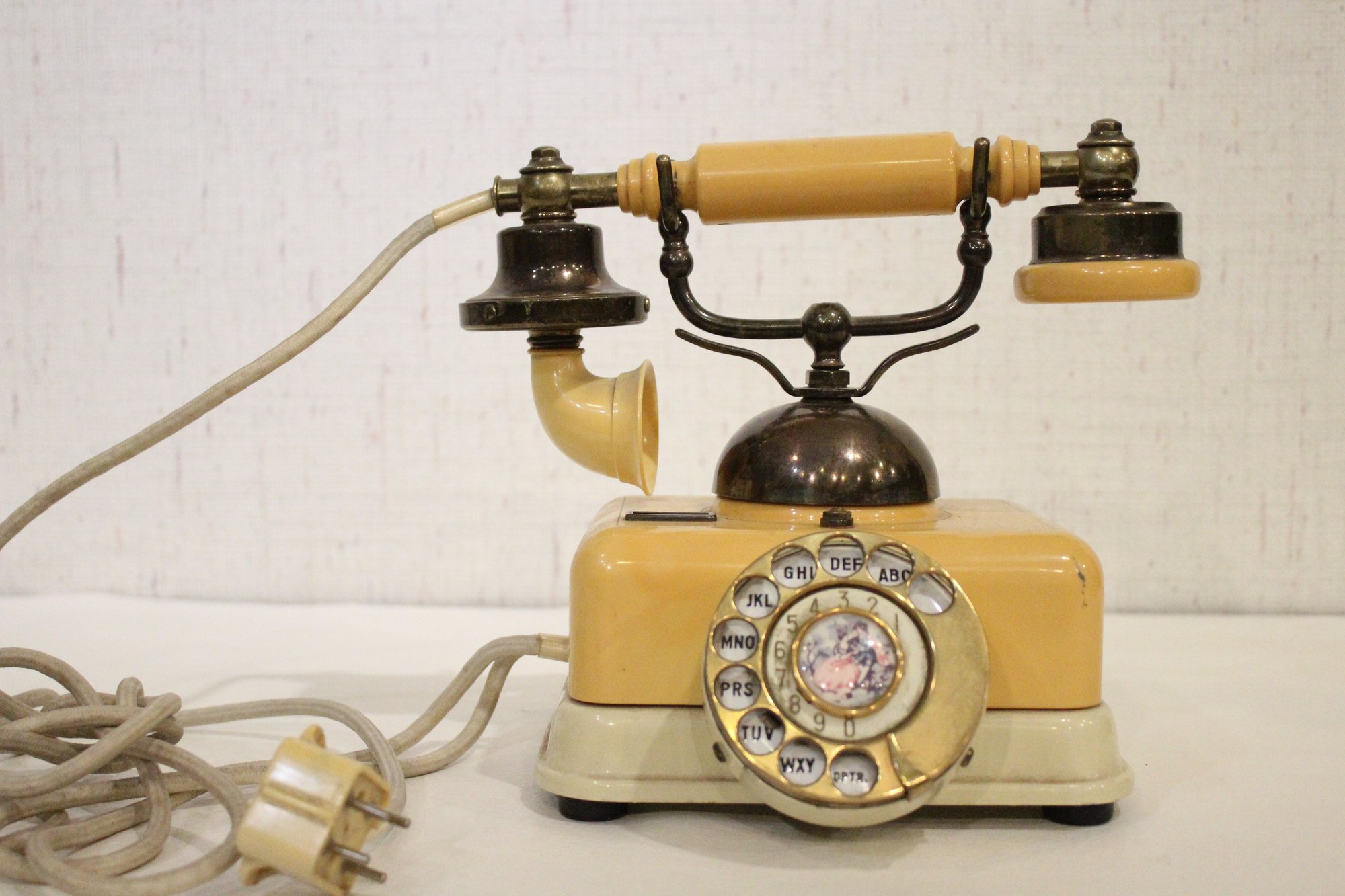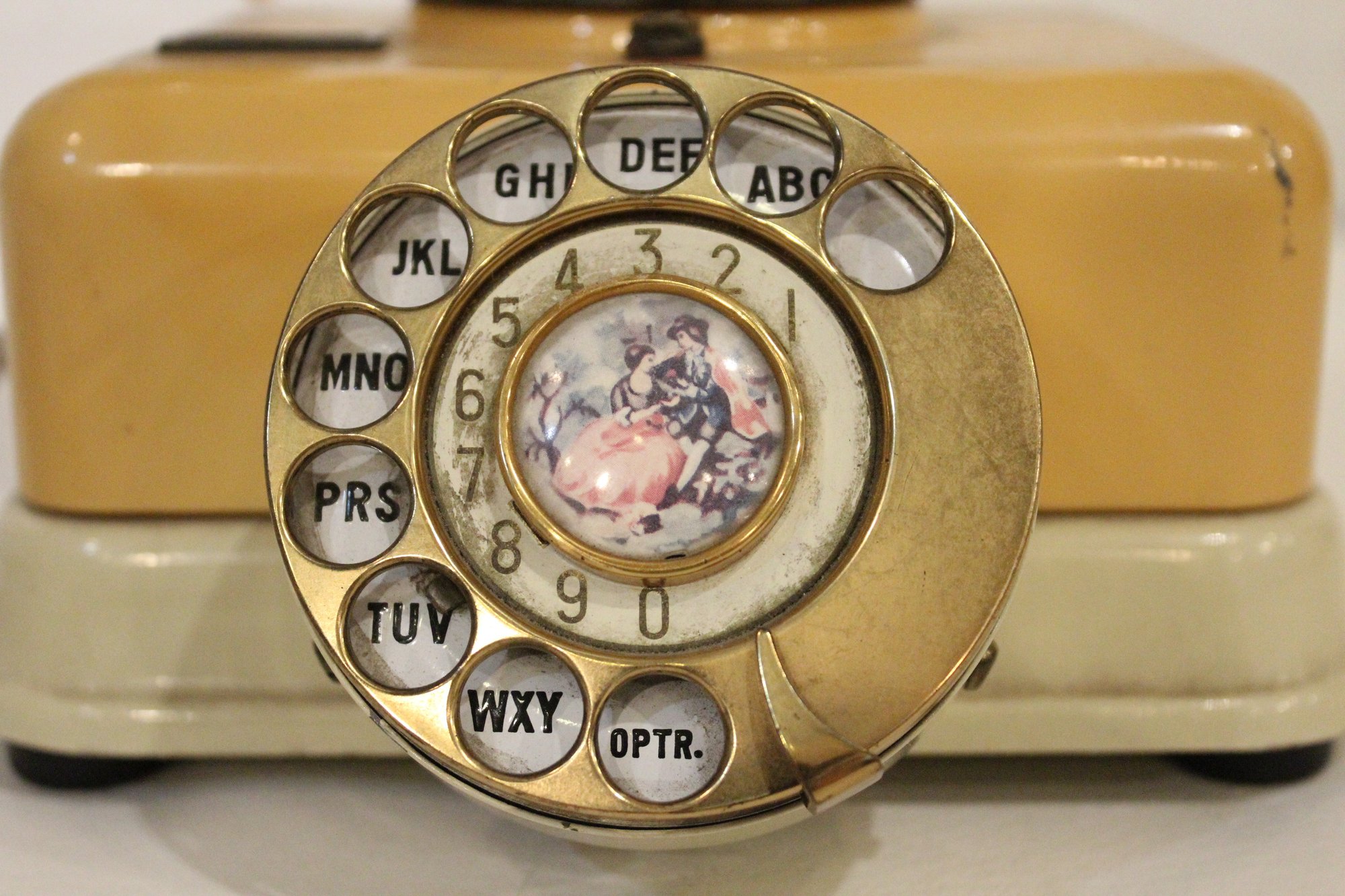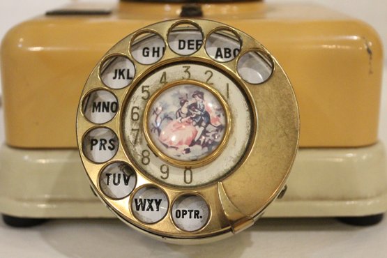 A vintage 1960s rotary telephone with painted image on the dial, made in Japan. This item can be shipped.