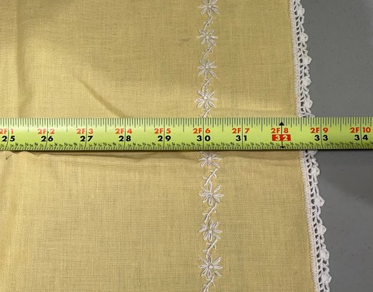 pale yellow linen tablecloth with white embroidery and edging, 35 x 33 and 2 30 inch printed runners
