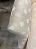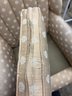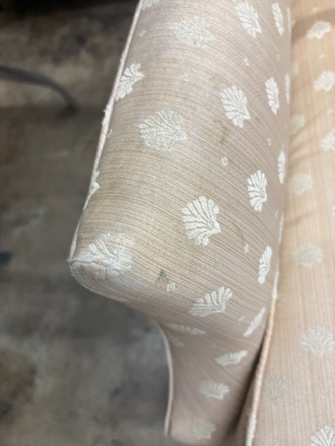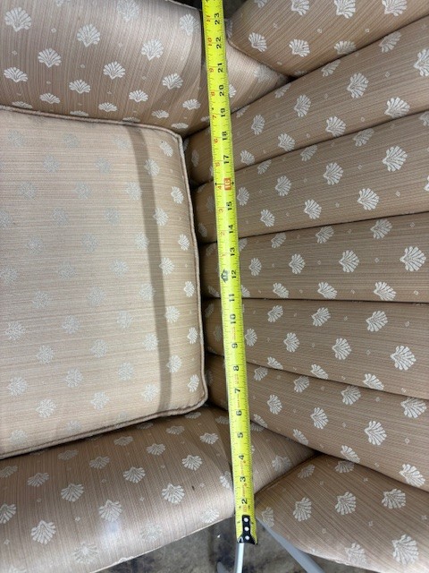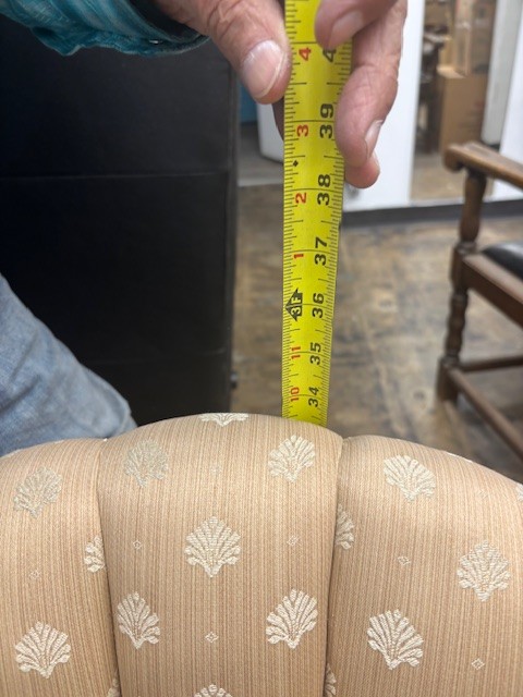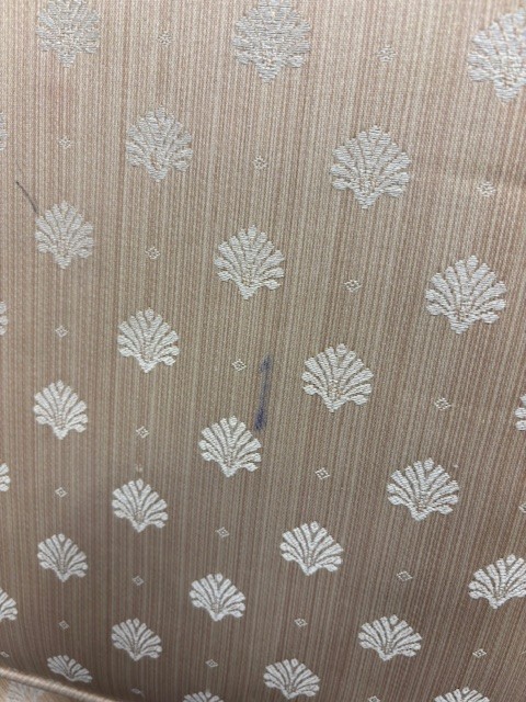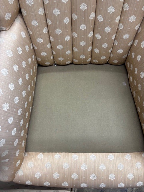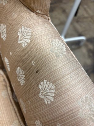 Vintage scalloped channeled back Upholstered Chair with a 20-inch seat and 331/2-inch-high back. Light upholstery with white raised emblems, dark hard wood legs date 1940-1950. Some stains and wear and tear but in good condition. This item will not ship
