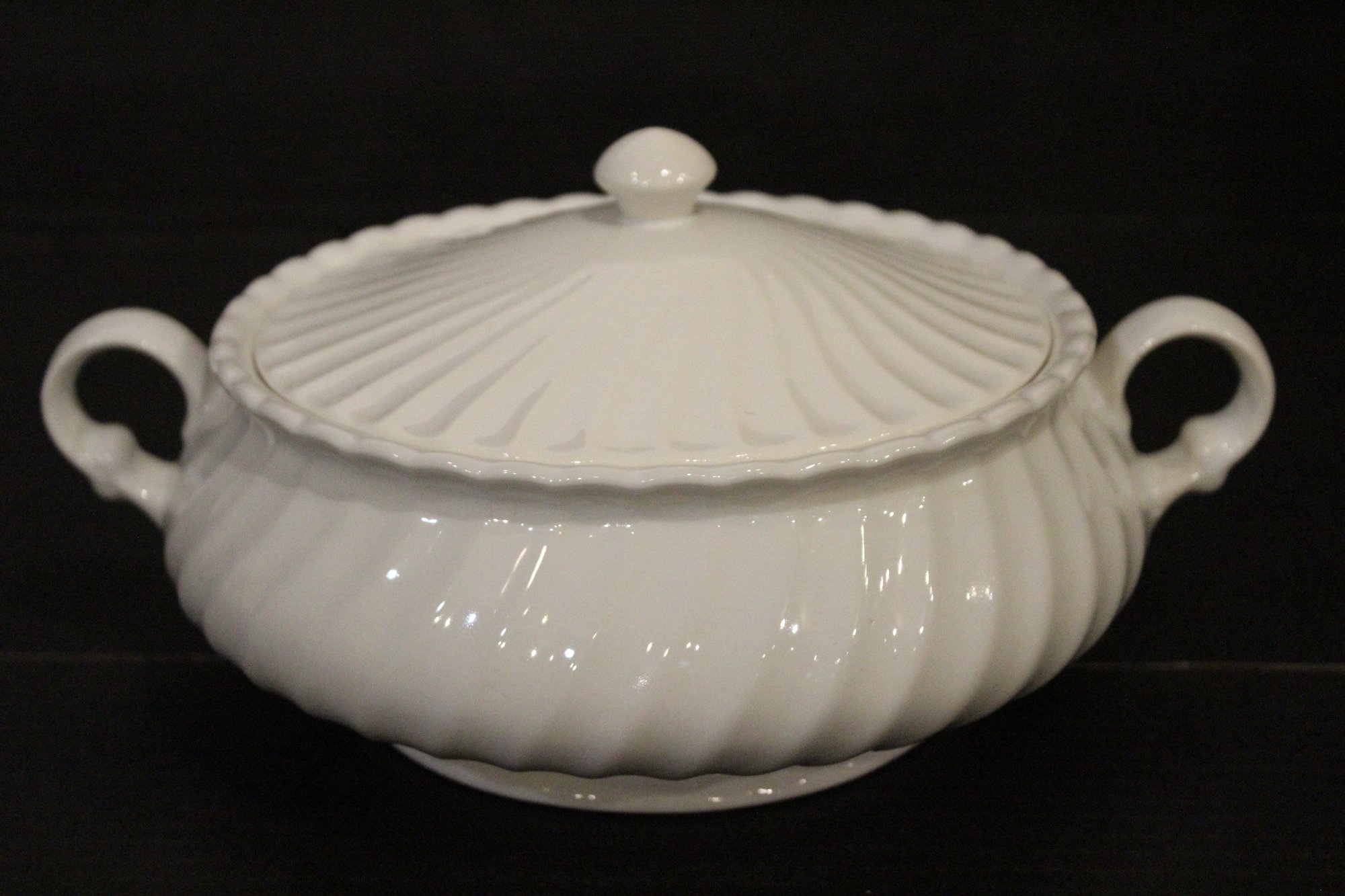 A vintage Sheffield Bone White Swirl Johnson Brothers covered serving bowl. This item can be shipped.