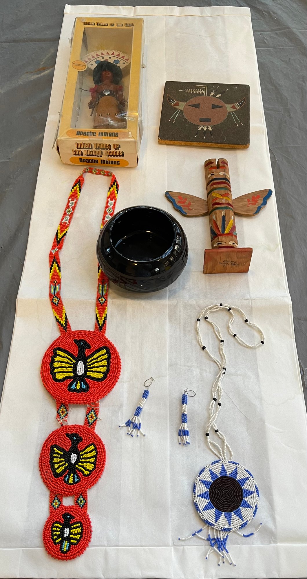 2 beaded necklaces, a pair of beaded earrings, sand painting, pottery bowl , doll and a carved totem pole. The orange beaded necklace has some fraying and the black bowl is cracked .