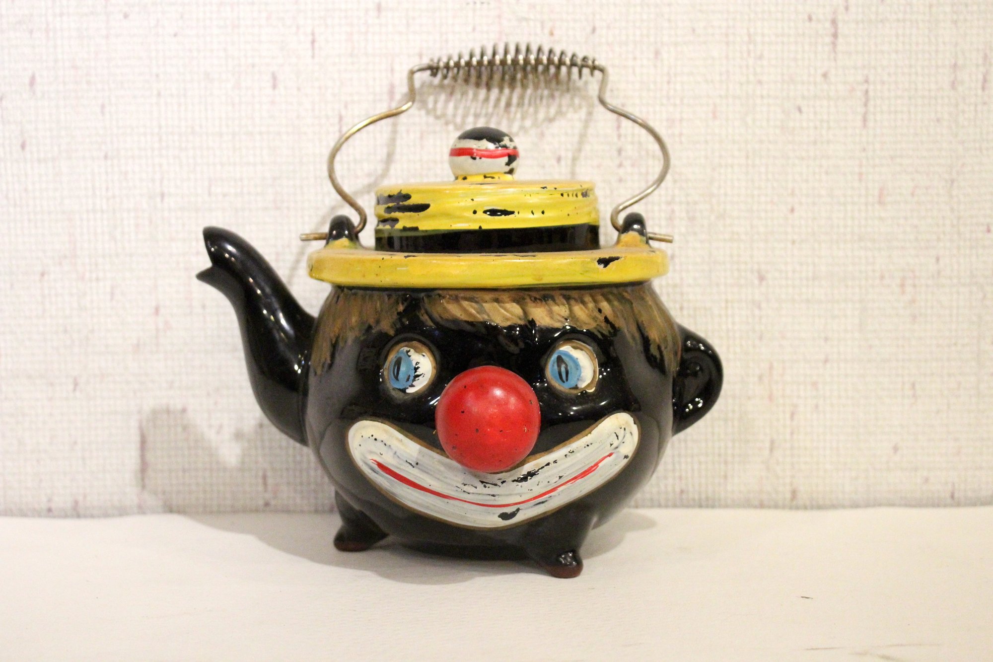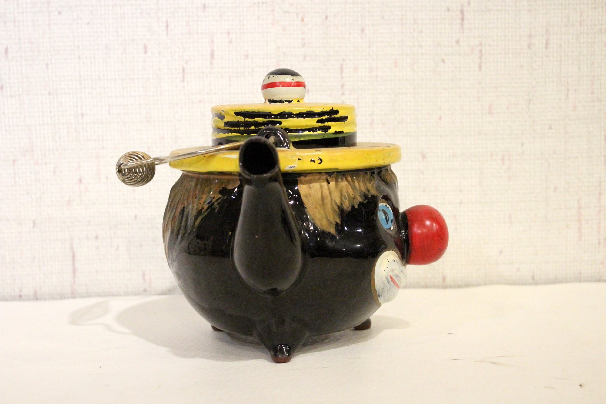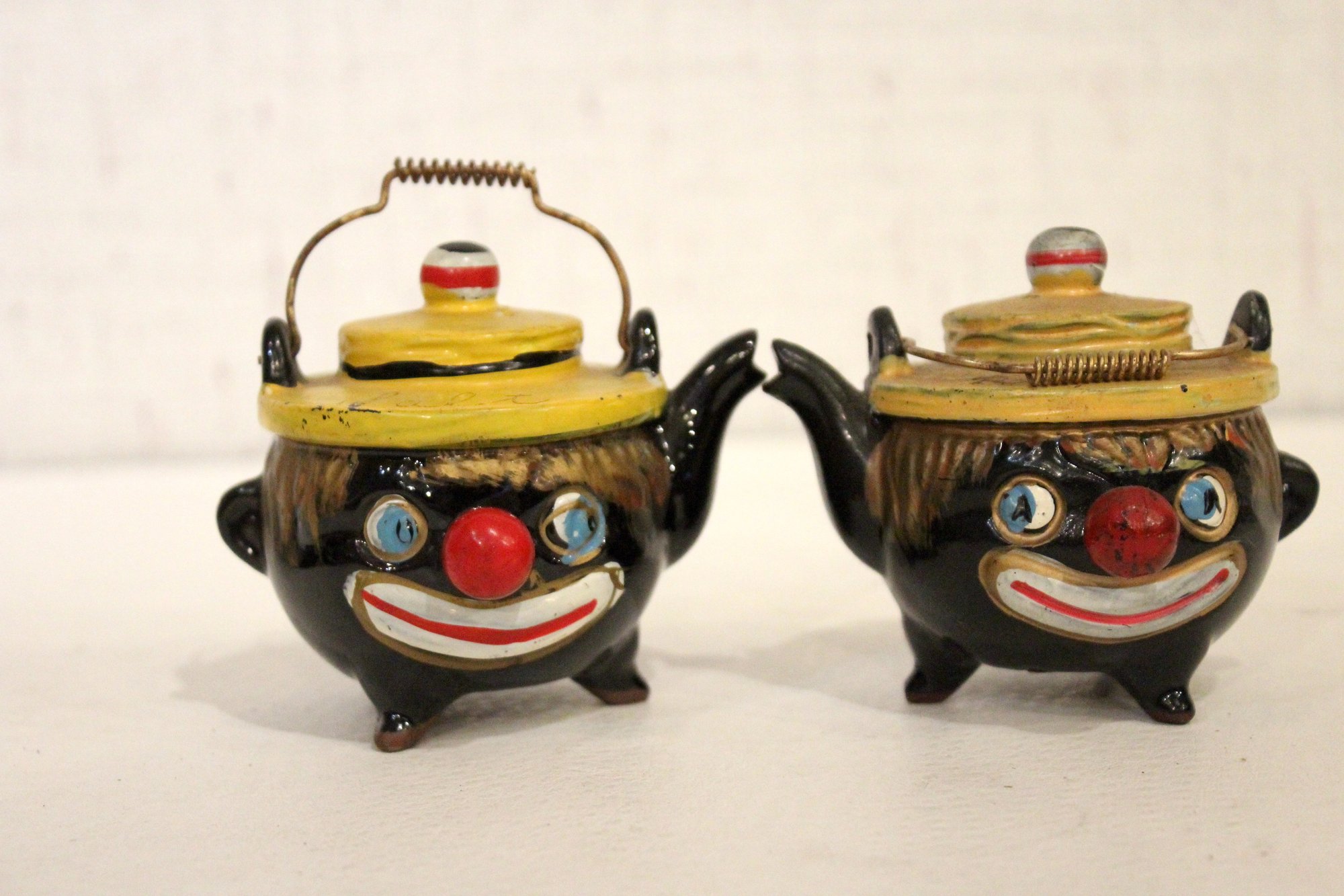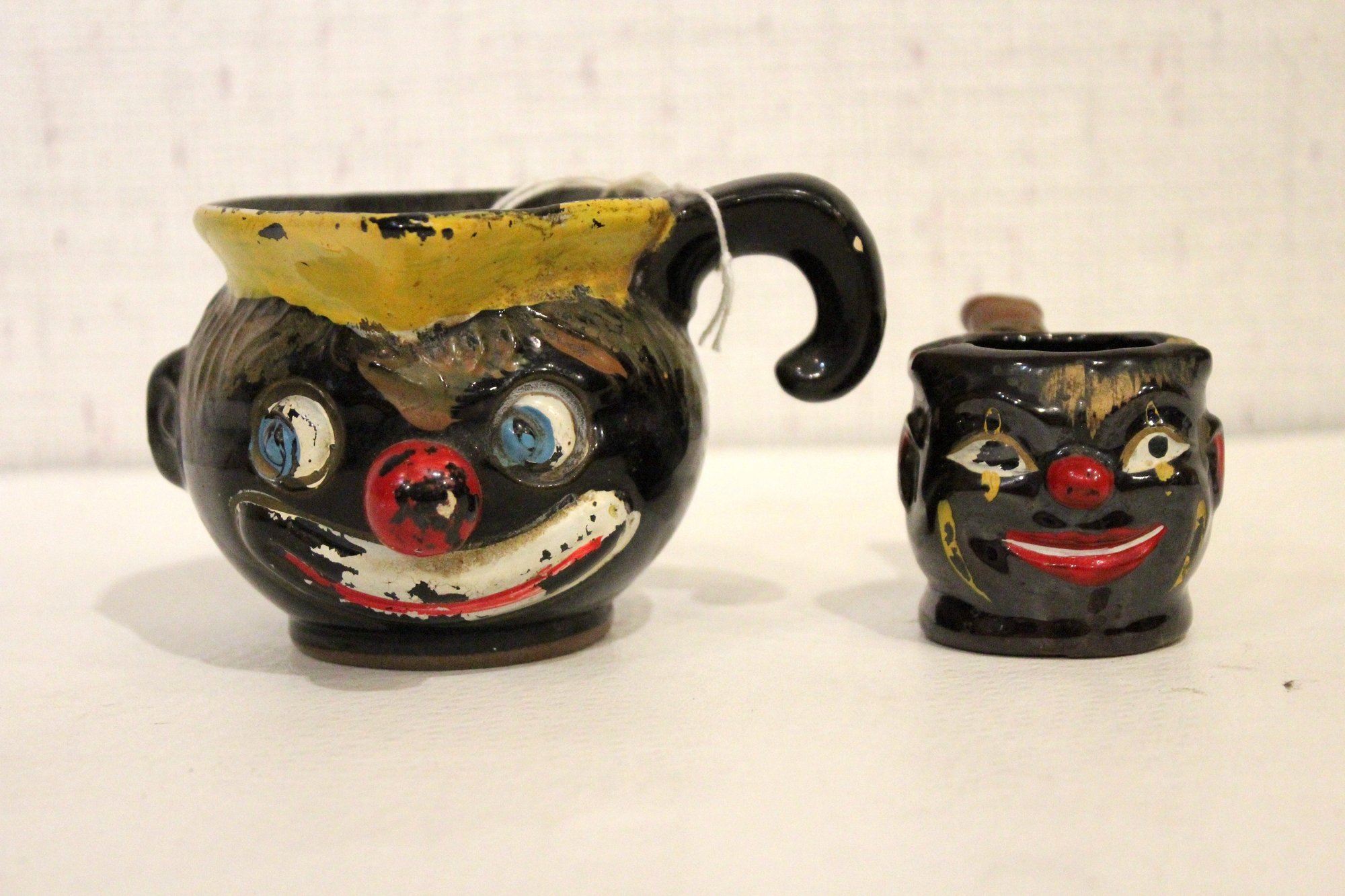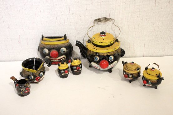 A vintage Black Americana, Thames redware clown face teapot set of 8, made in Japan in the 1950s. The main teapot is 7" tall. These items can be shipped.
