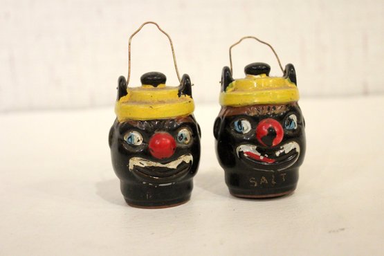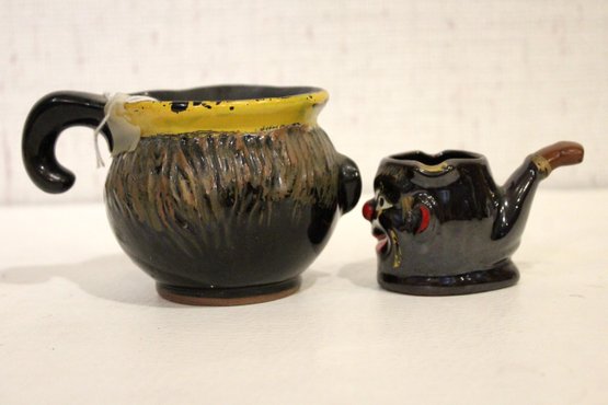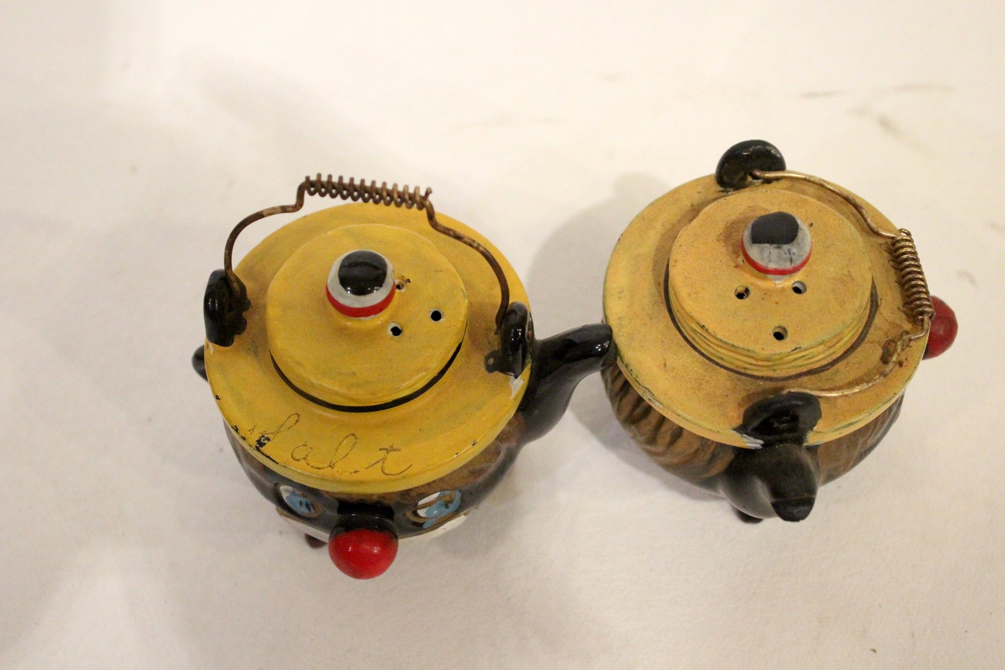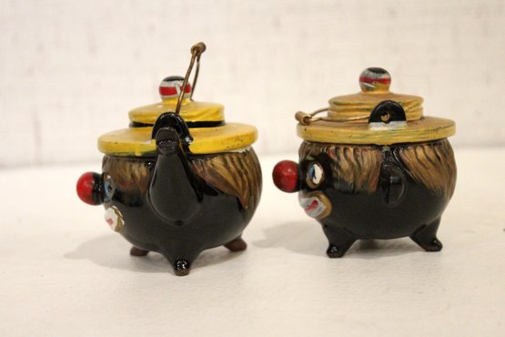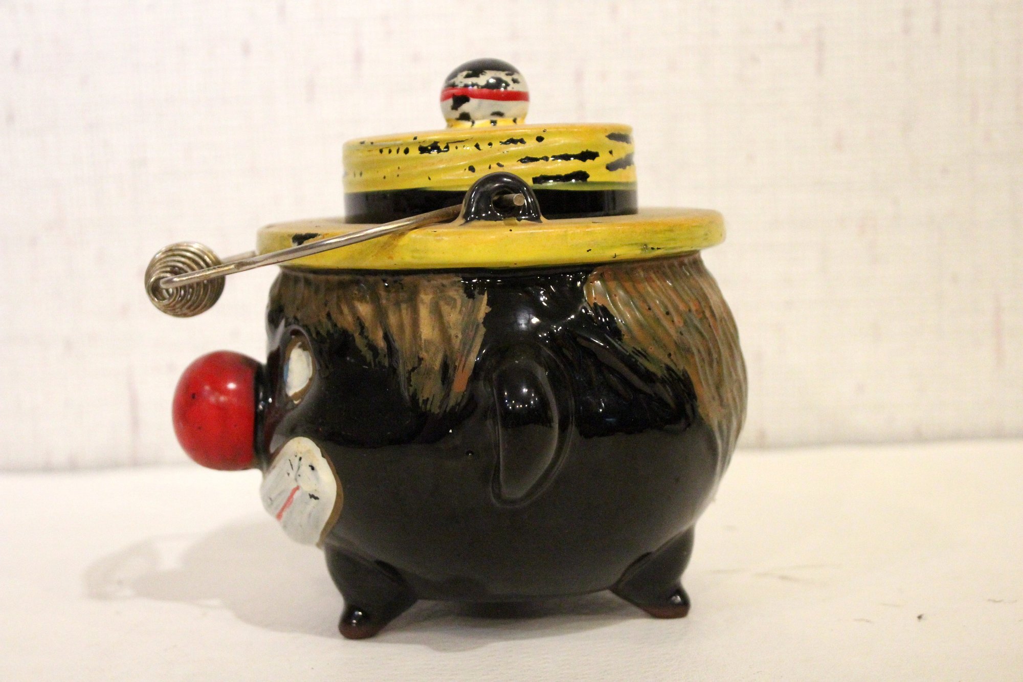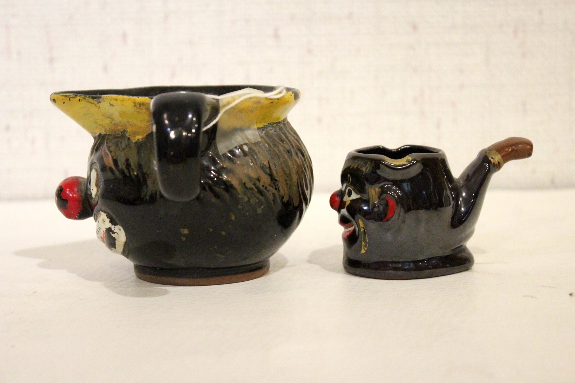 A vintage Black Americana, Thames redware clown face teapot set of 8, made in Japan in the 1950s. The main teapot is 7" tall. These items can be shipped.