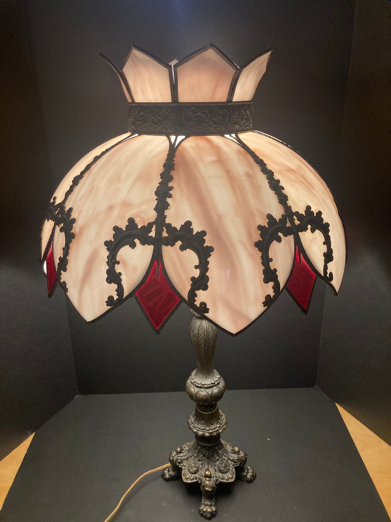 This is a 30" tall lamp with 18" diameter leaded stained glass shade. Pink marbled glass with red points. Can take a 3 way bulb, but. not necessary. Purchased at Woodley's Fine Furniture in 1993.
