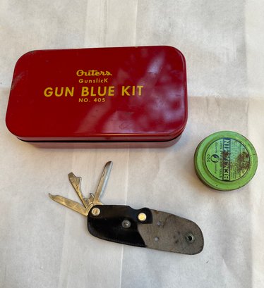 2 vintage storage tins, and a folding pocket knife in a leather case.