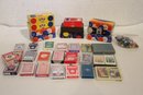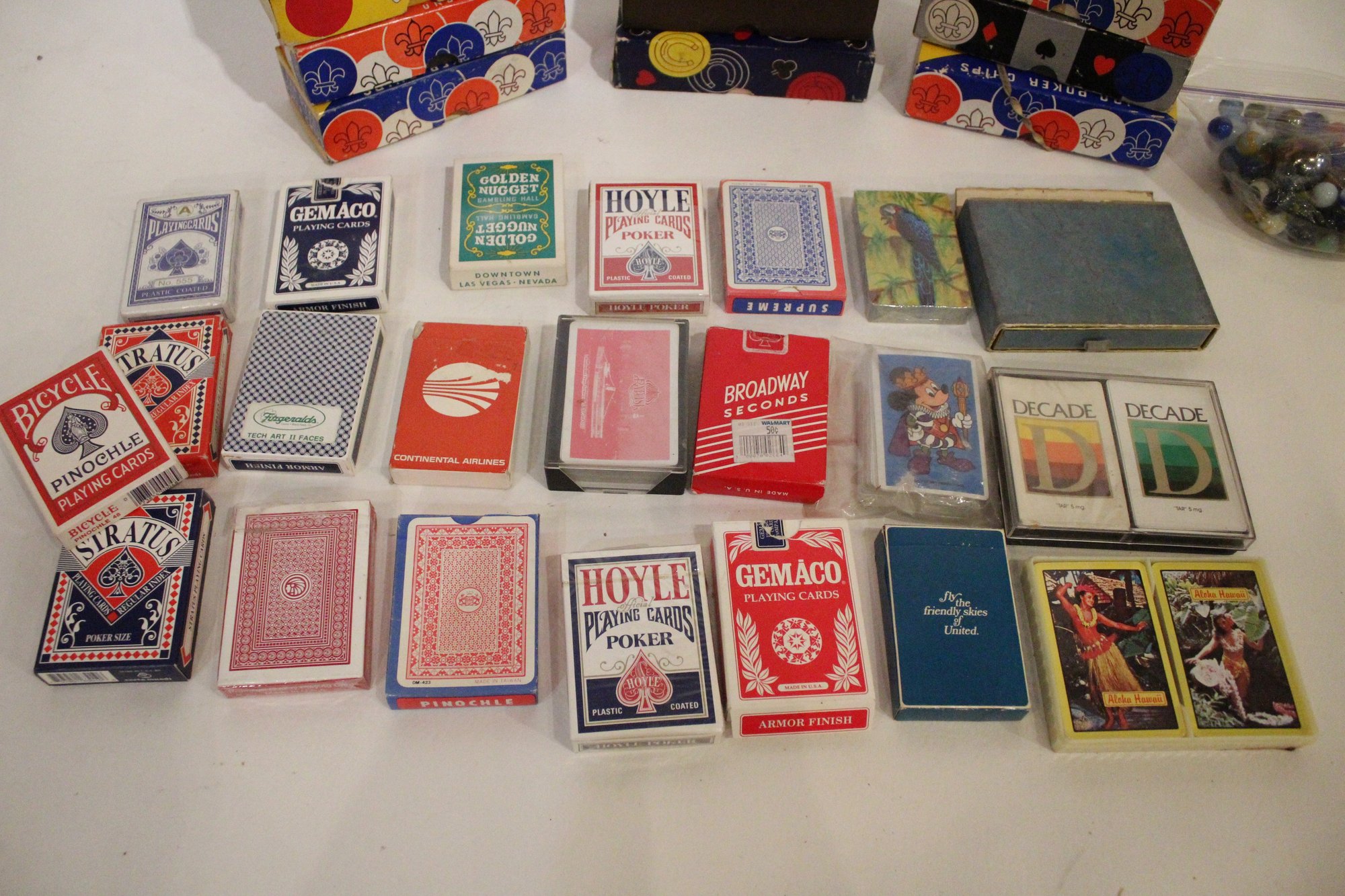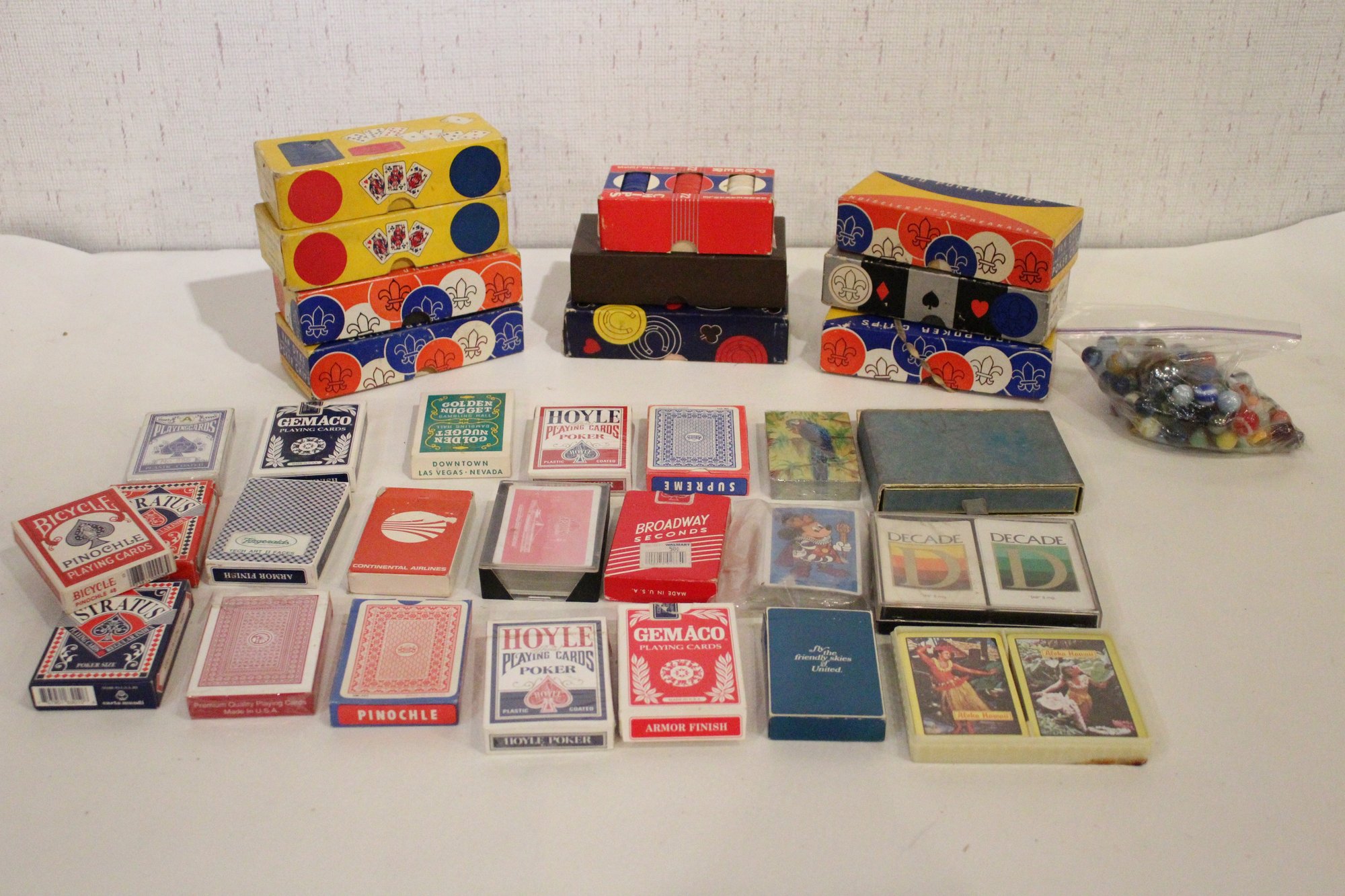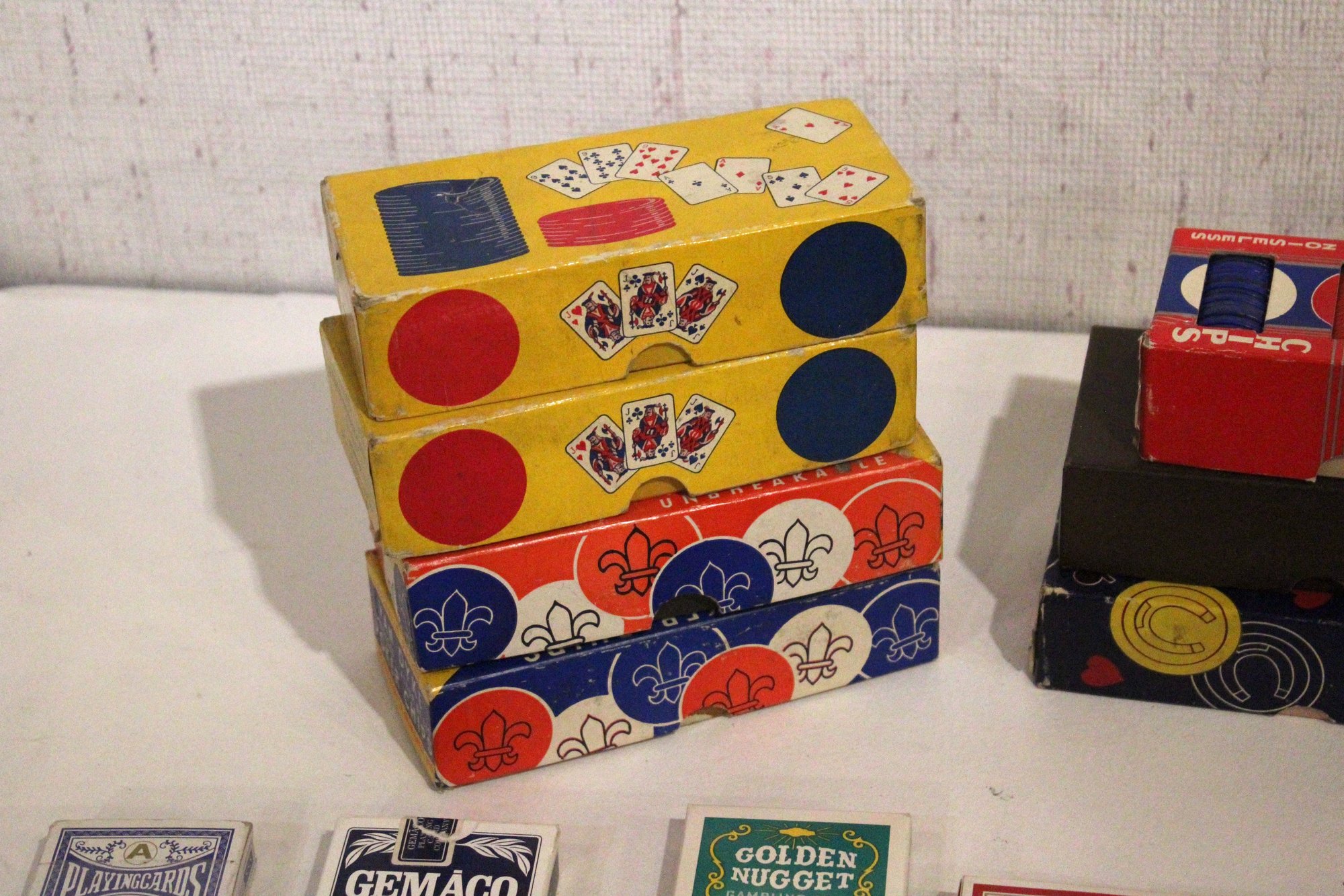 Vintage playing cards and poker chips, including several decks of Bicycle and Hoyle brand cards and a set of Van Dyke "Noiseless" poker chips and vintage Van Dyke embossed fleur-de-lis paper poker chips. These items can be shipped.