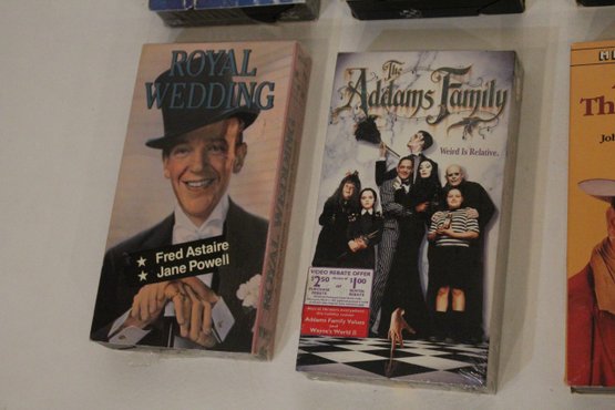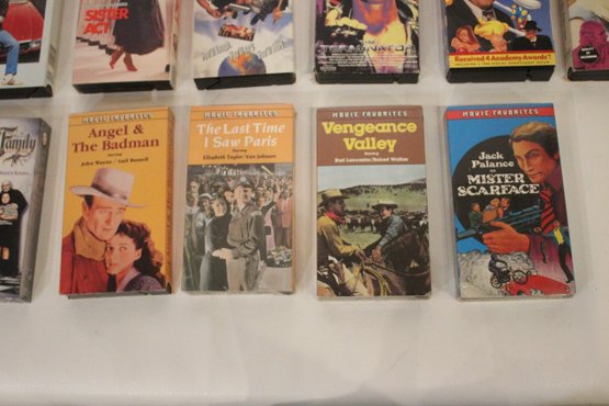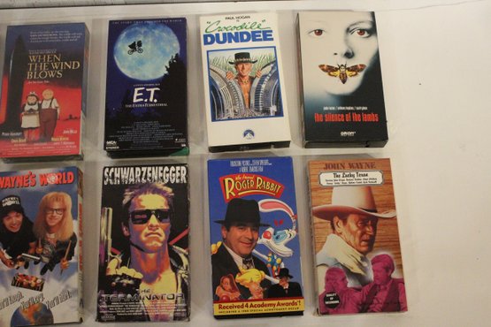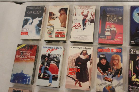 A collection of VHS tapes, from the 1970s through the 2000s. Titles include; Ghost, E.T., Beverly Hills Cop, Wayne's World, Sister Act, Addams Family, Terminator, Silence of the Lambs, and John Wayne. These items can be shipped.