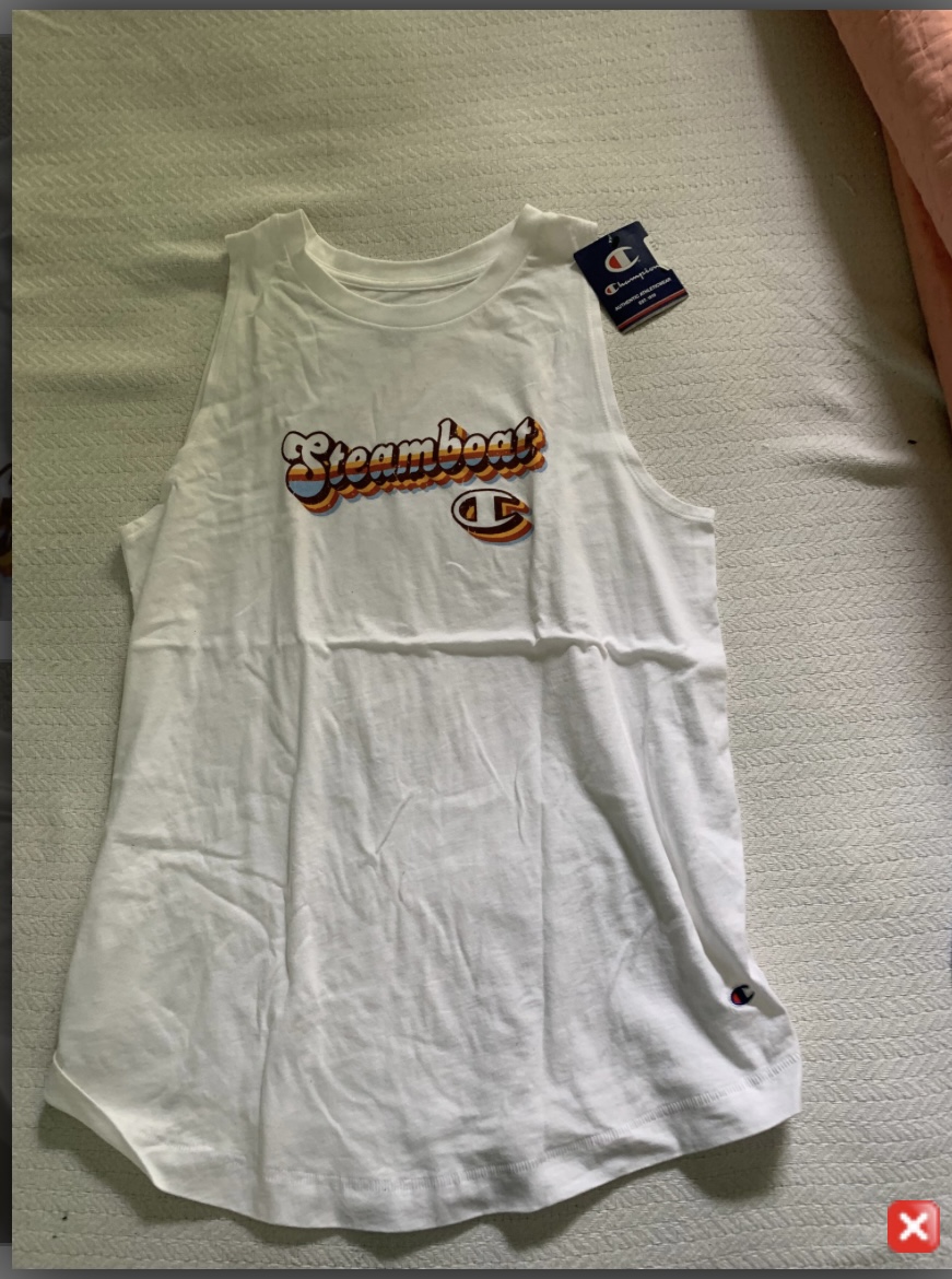 Women’s white sleeveless cotton T-shirt with steamboat emblem on front. Size medium. Never been worn – tags still on. No rips, stains or tears.