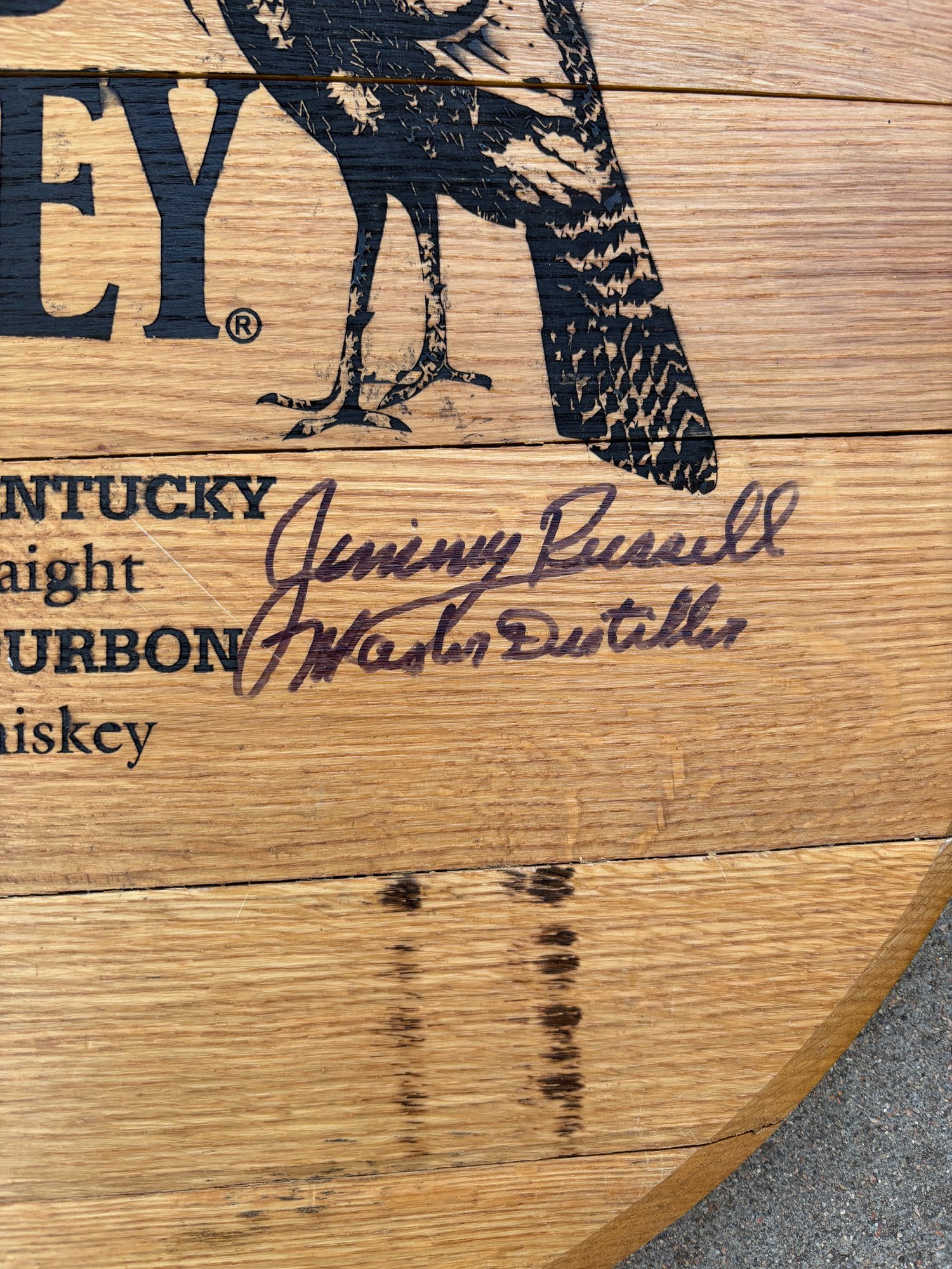 This highly collectible wood barrel head is signed by the 91 year old master of Kentucky bourbon.