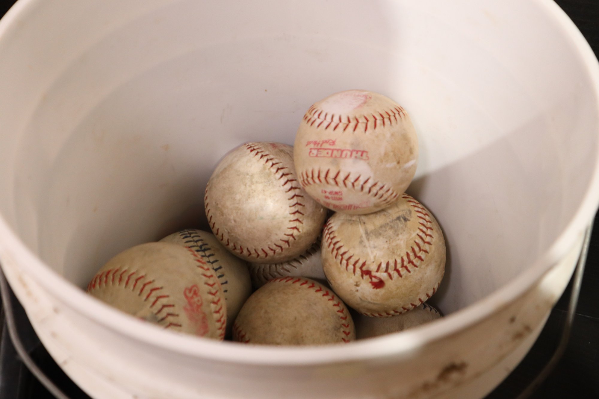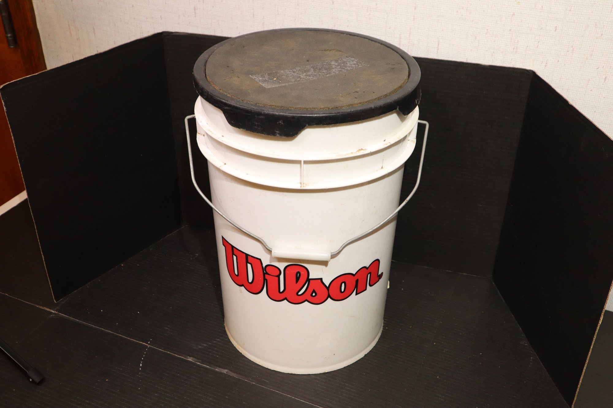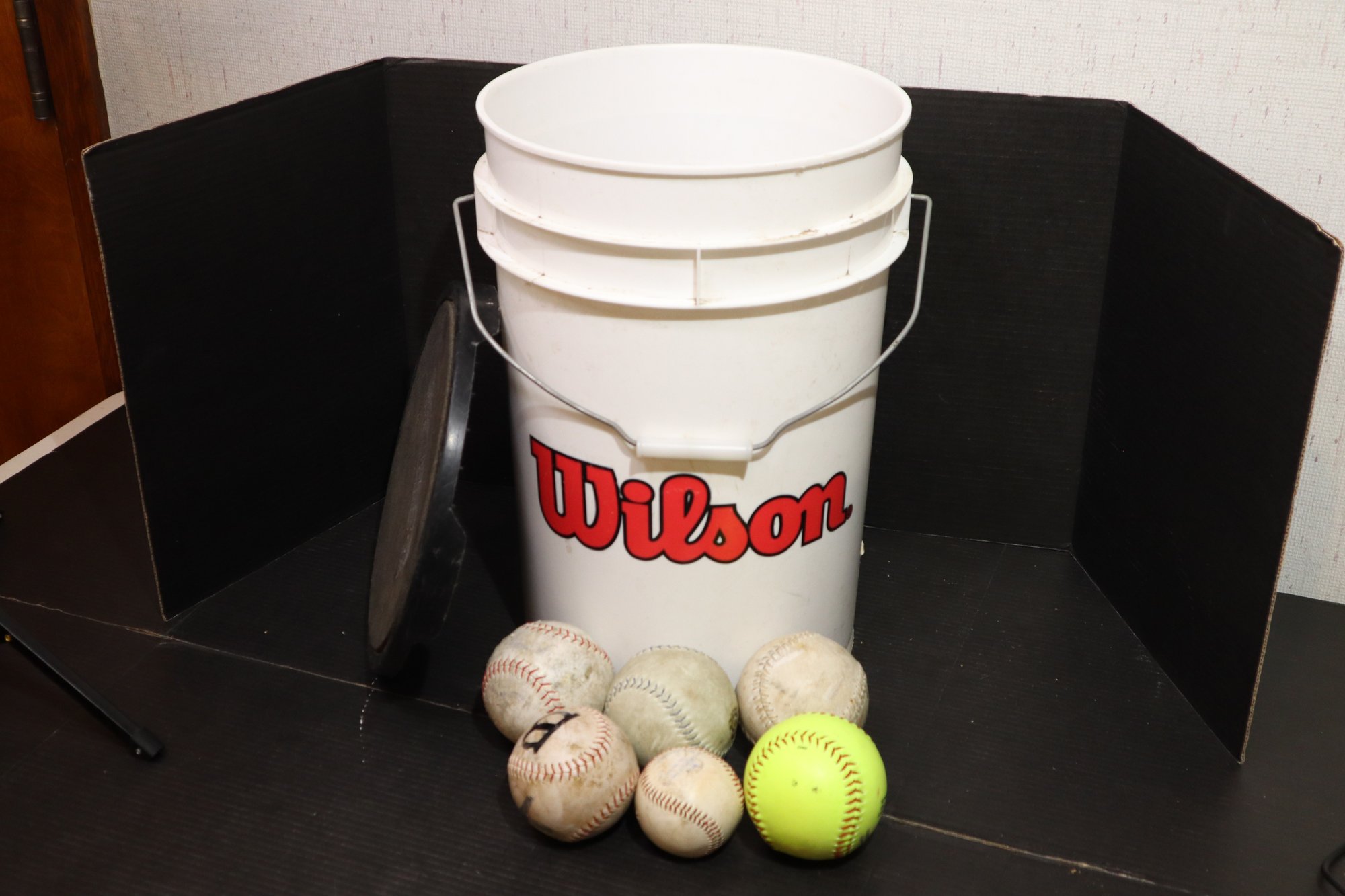 A five gallon Wilson Ball Bucket filled with softballs and baseballs. Everything is in decent condition, though the balls show signs of age and wear. They are still playable.