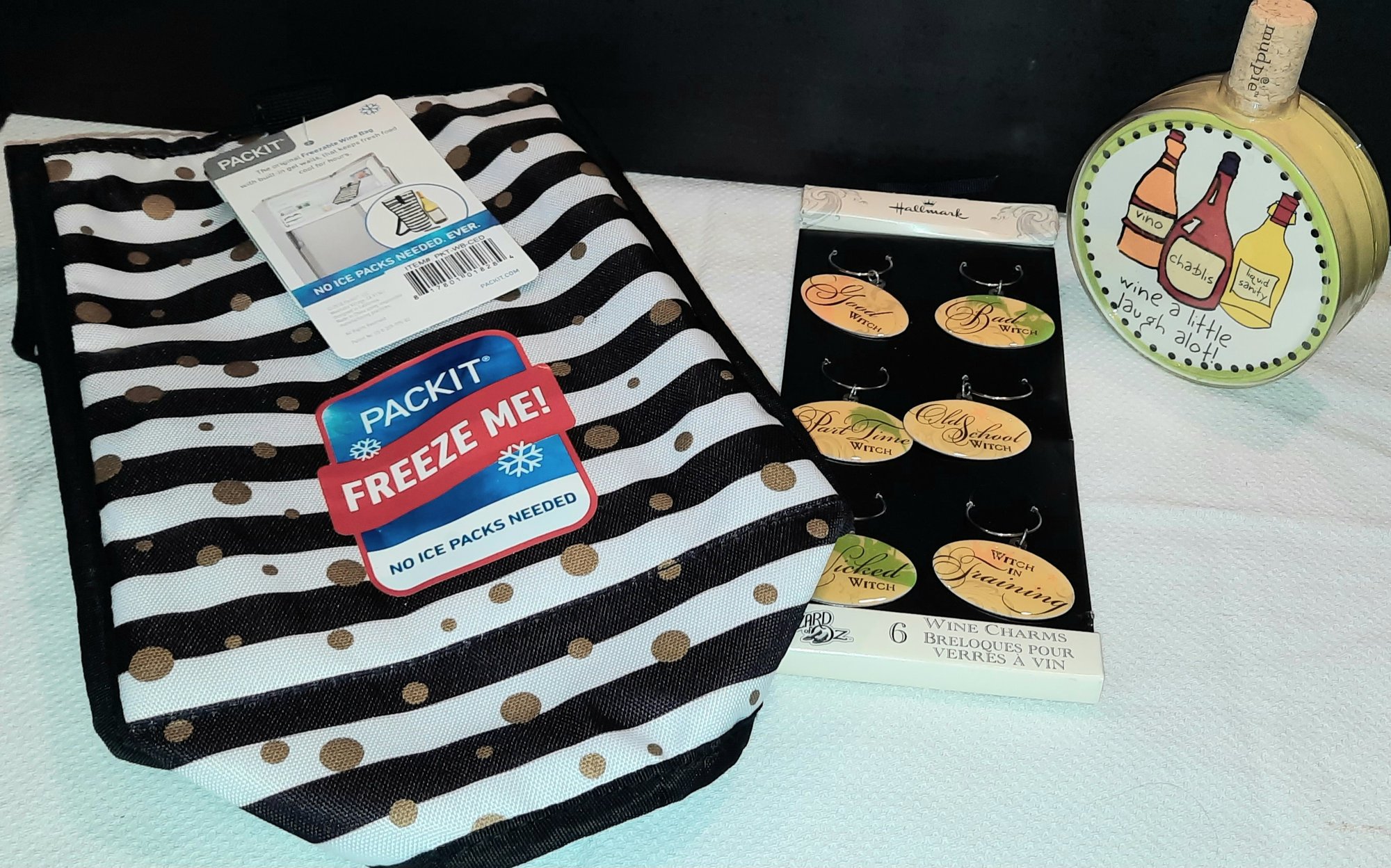 Keep your wine cool with this bundle. A new freezable wine bag and some coasters. It also includes six wine charms for the ladies.