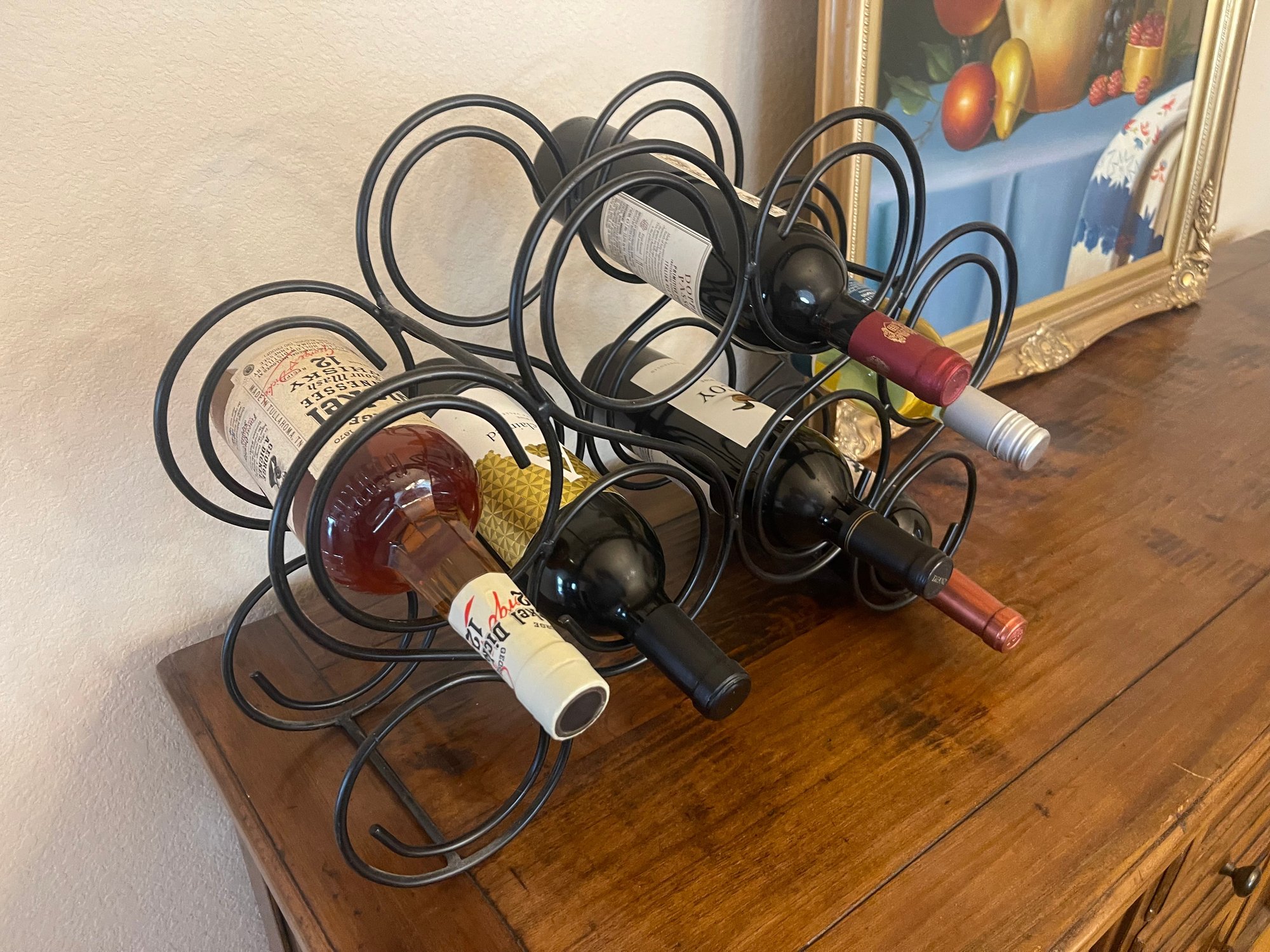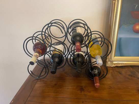 Wine not included ! 8 bottles can be held in this decorative metal rack. 20 wide, 14.5 high, 6 deep. This can be shipped
