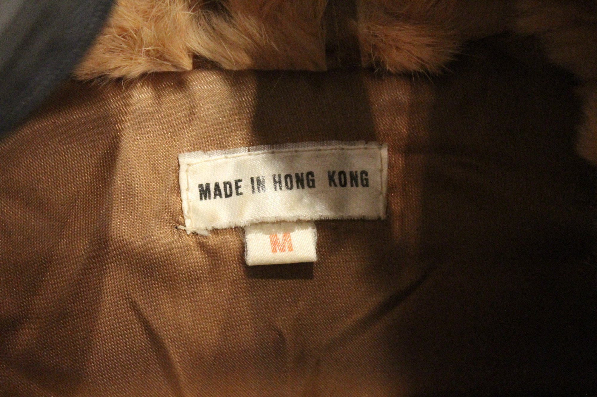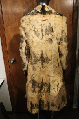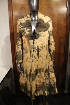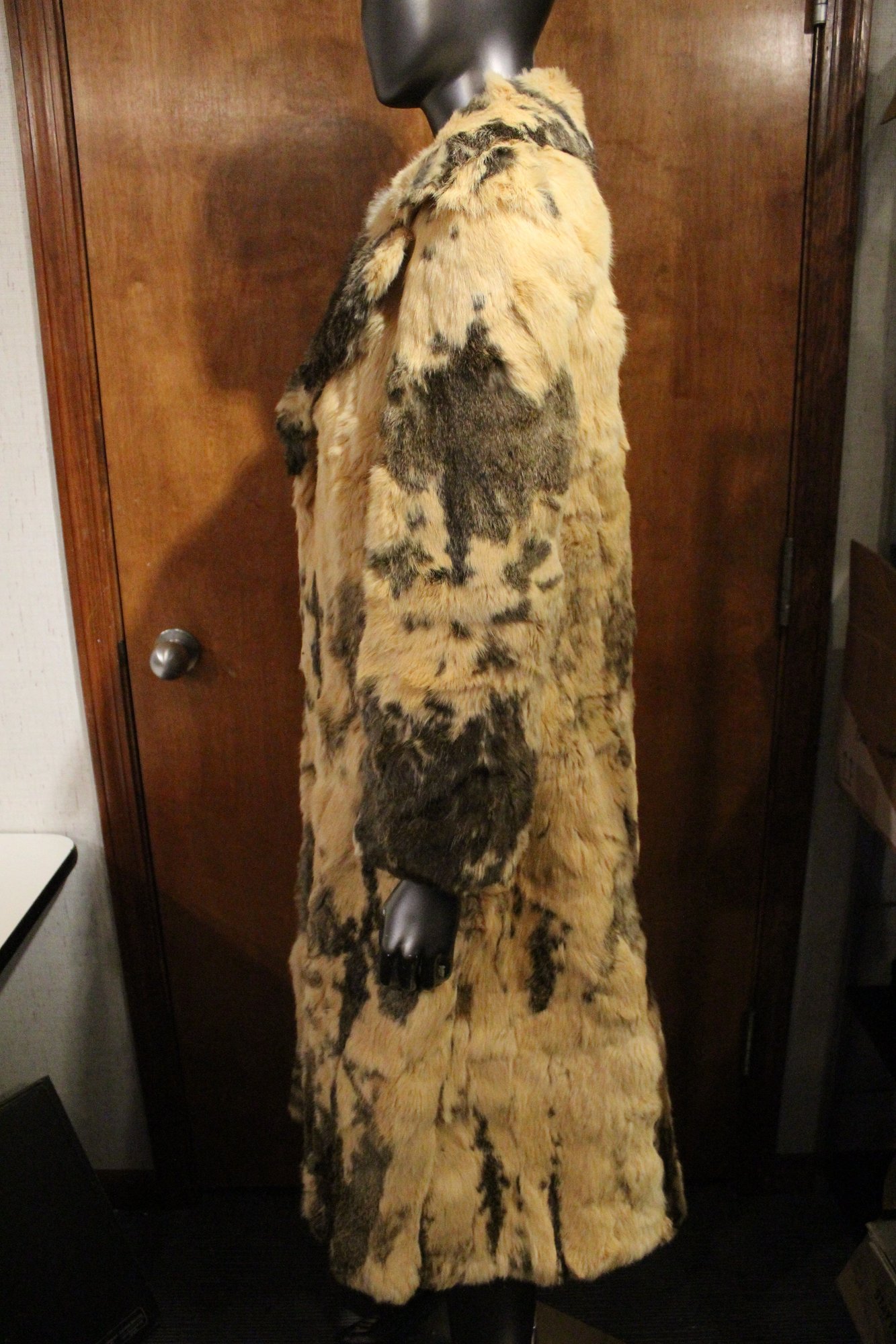A vintage full-length rabbit fur coat in tan and brown with a large collar Womens size S, excellent condition, made in Hong Kong. This item can be shipped.