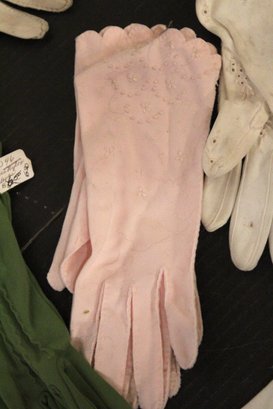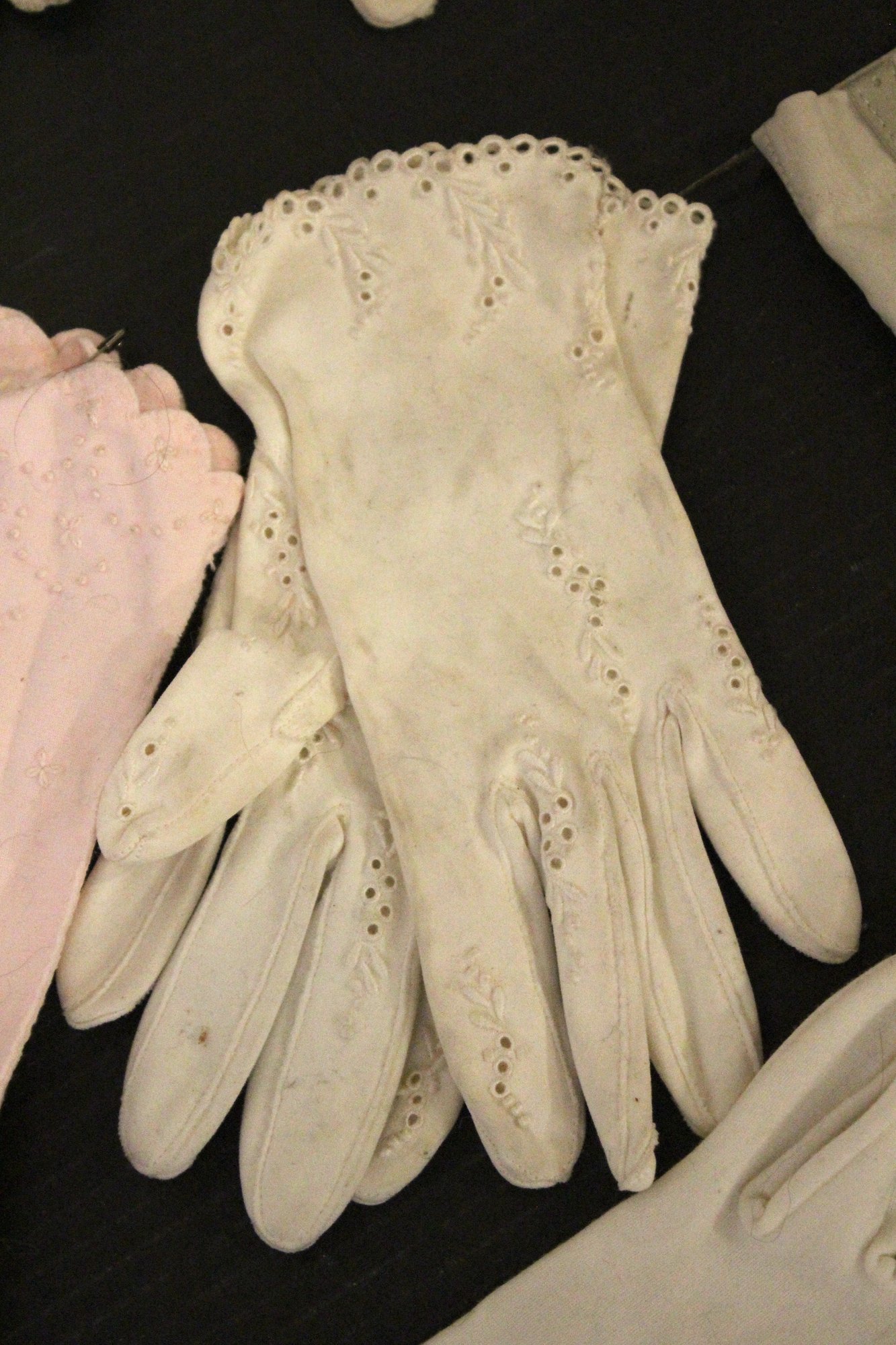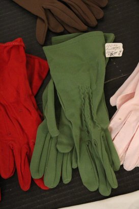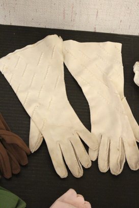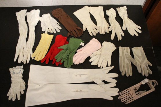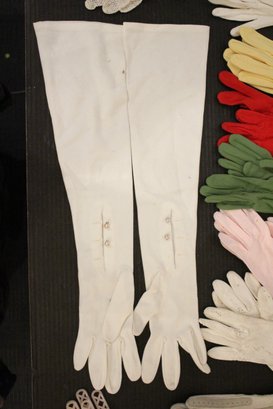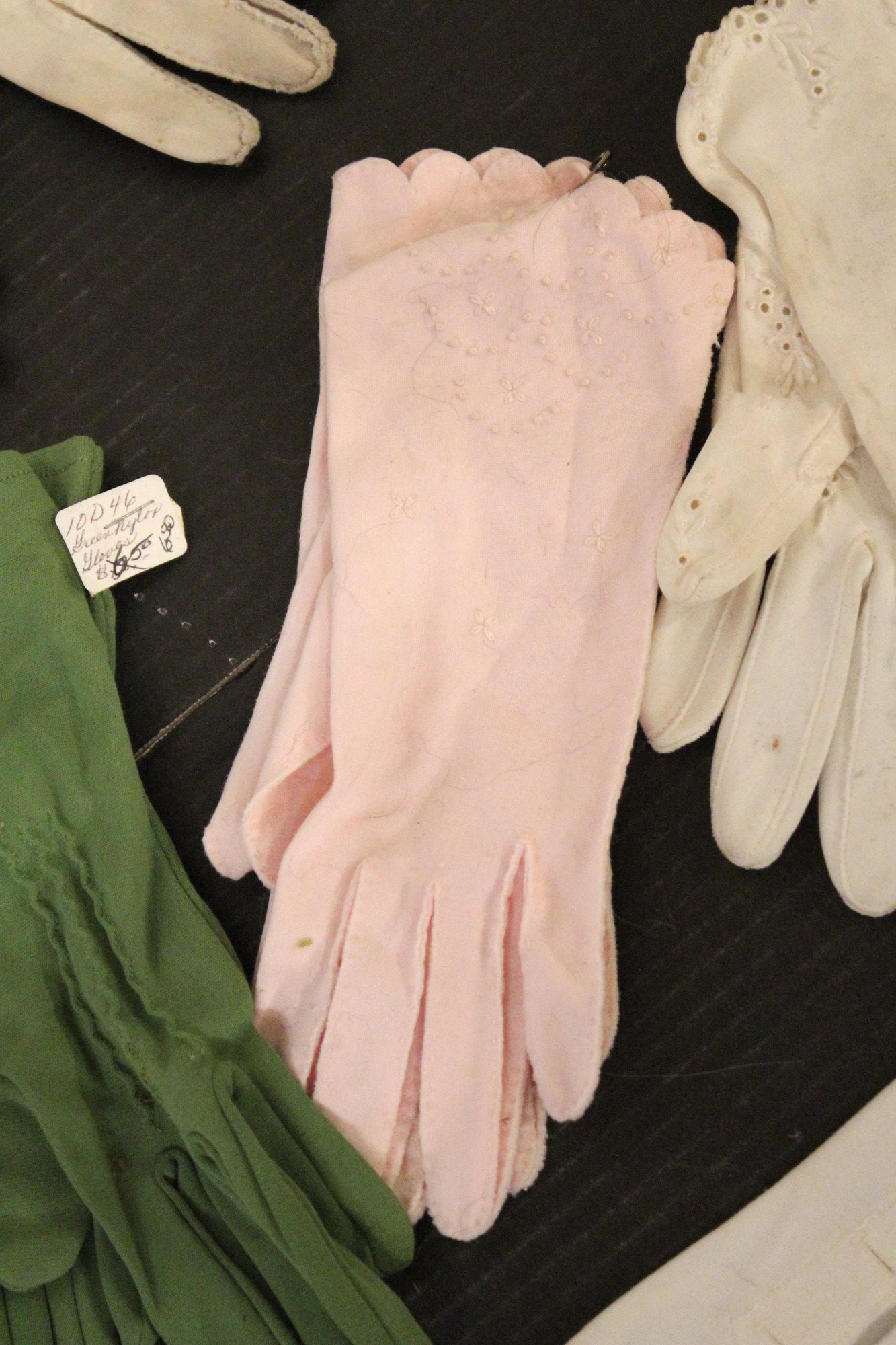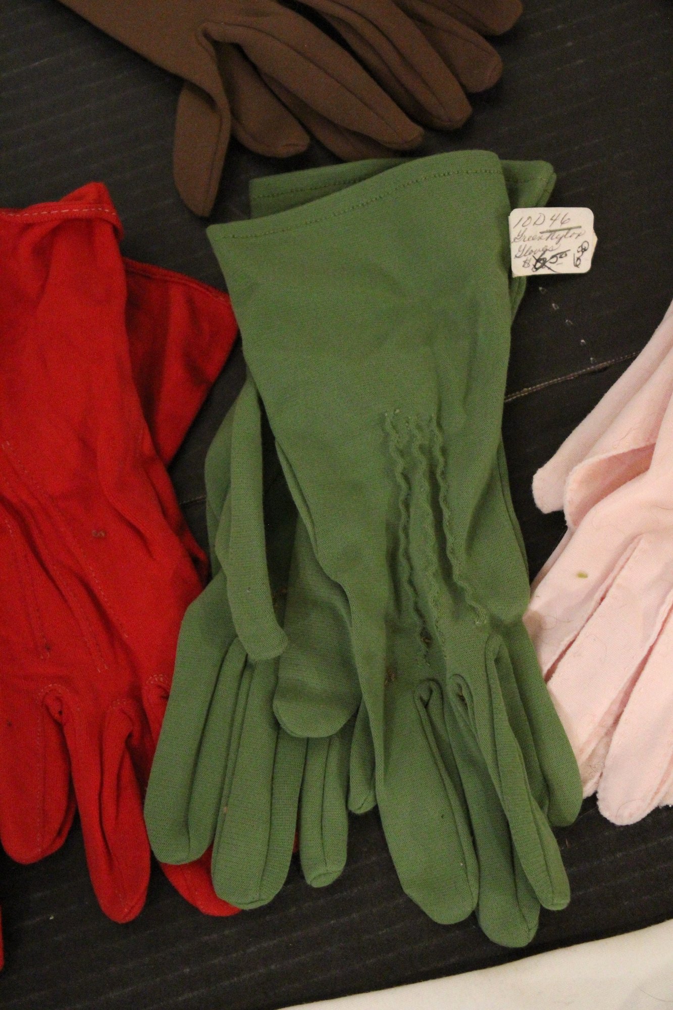 a collection of 20 pairs of vintage women's gloves from the 1940s to 1960s, featuring various styles, colors, and materials like leather, nylon, and lace, size 6.5 to 7.