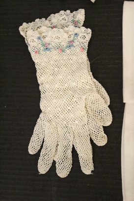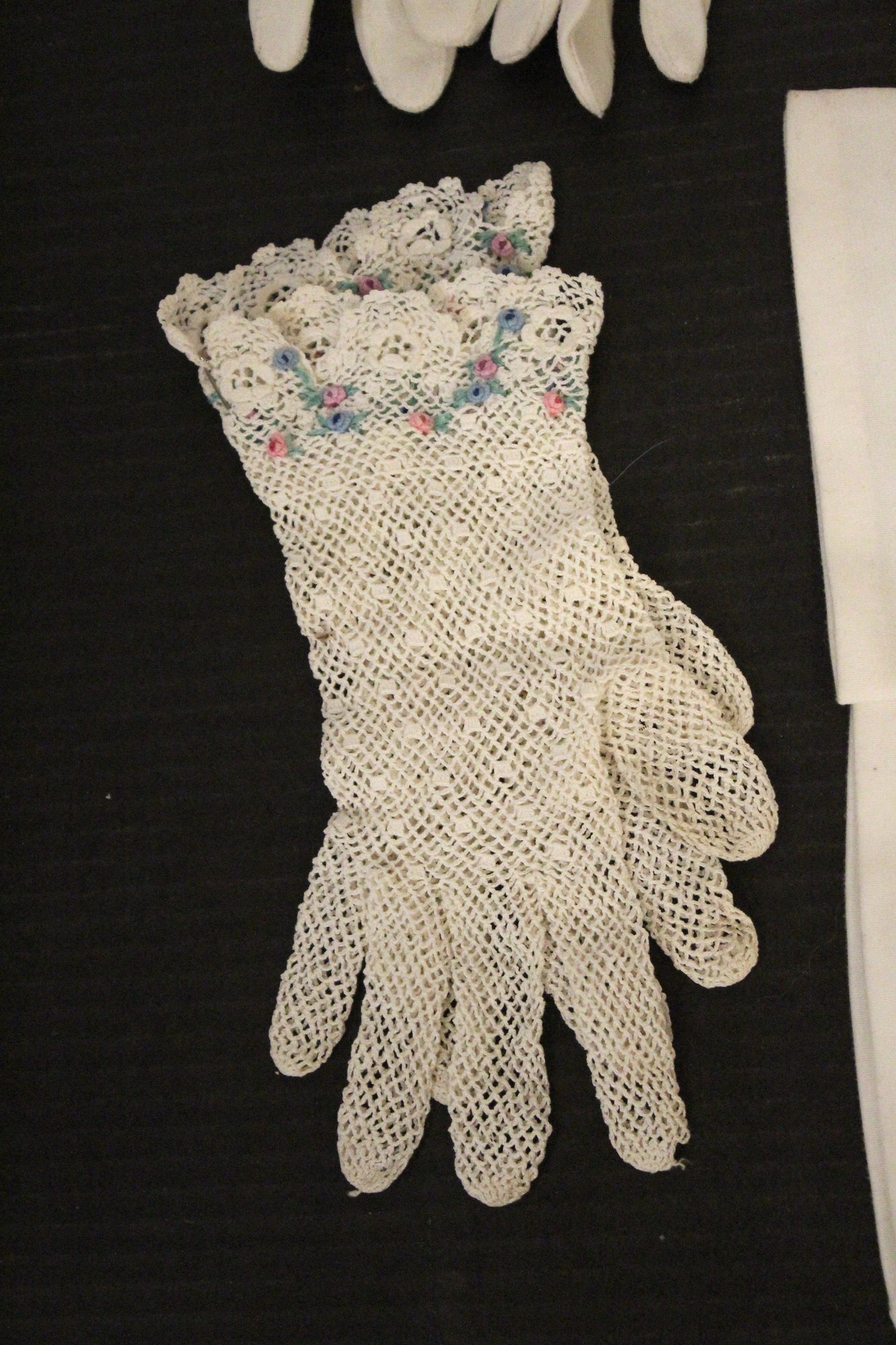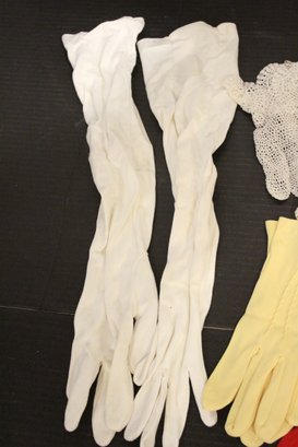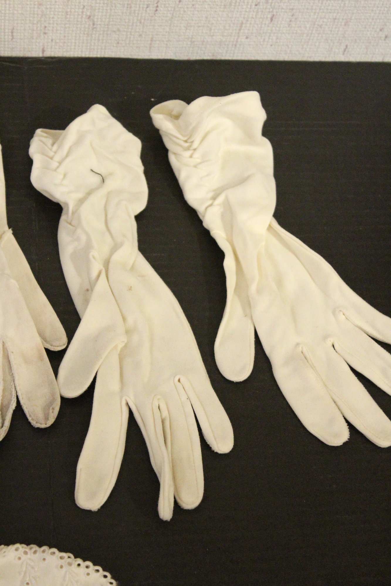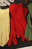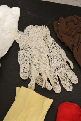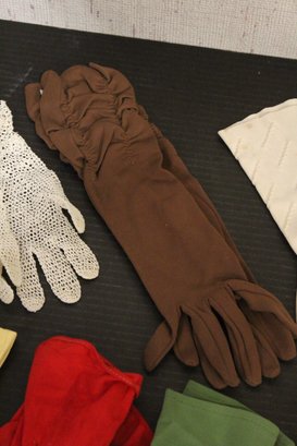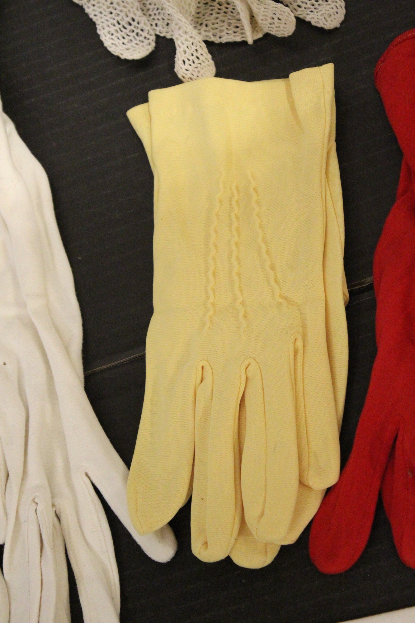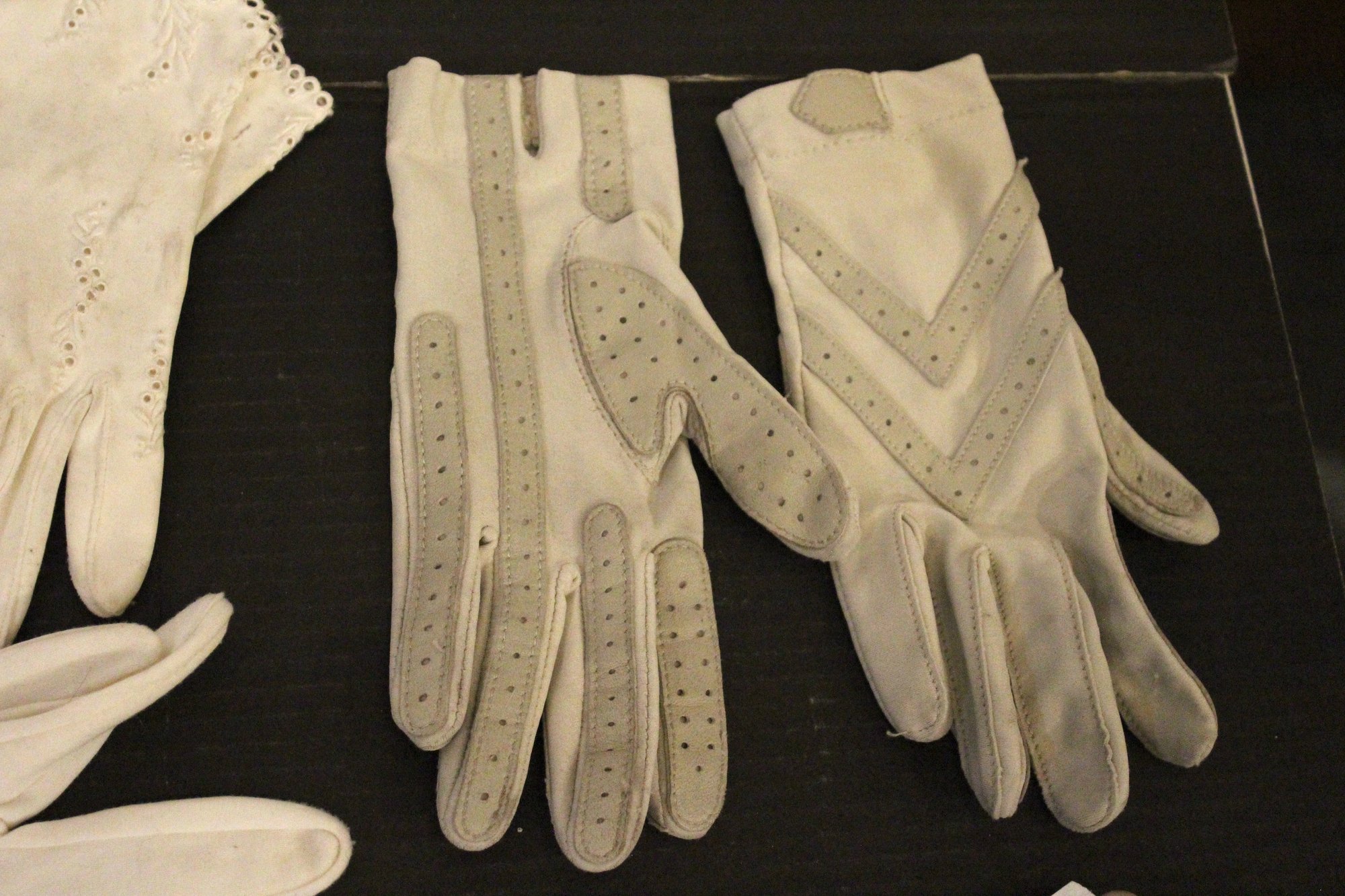 a collection of 20 pairs of vintage women's gloves from the 1940s to 1960s, featuring various styles, colors, and materials like leather, nylon, and lace, size 6.5 to 7.