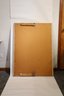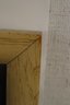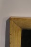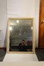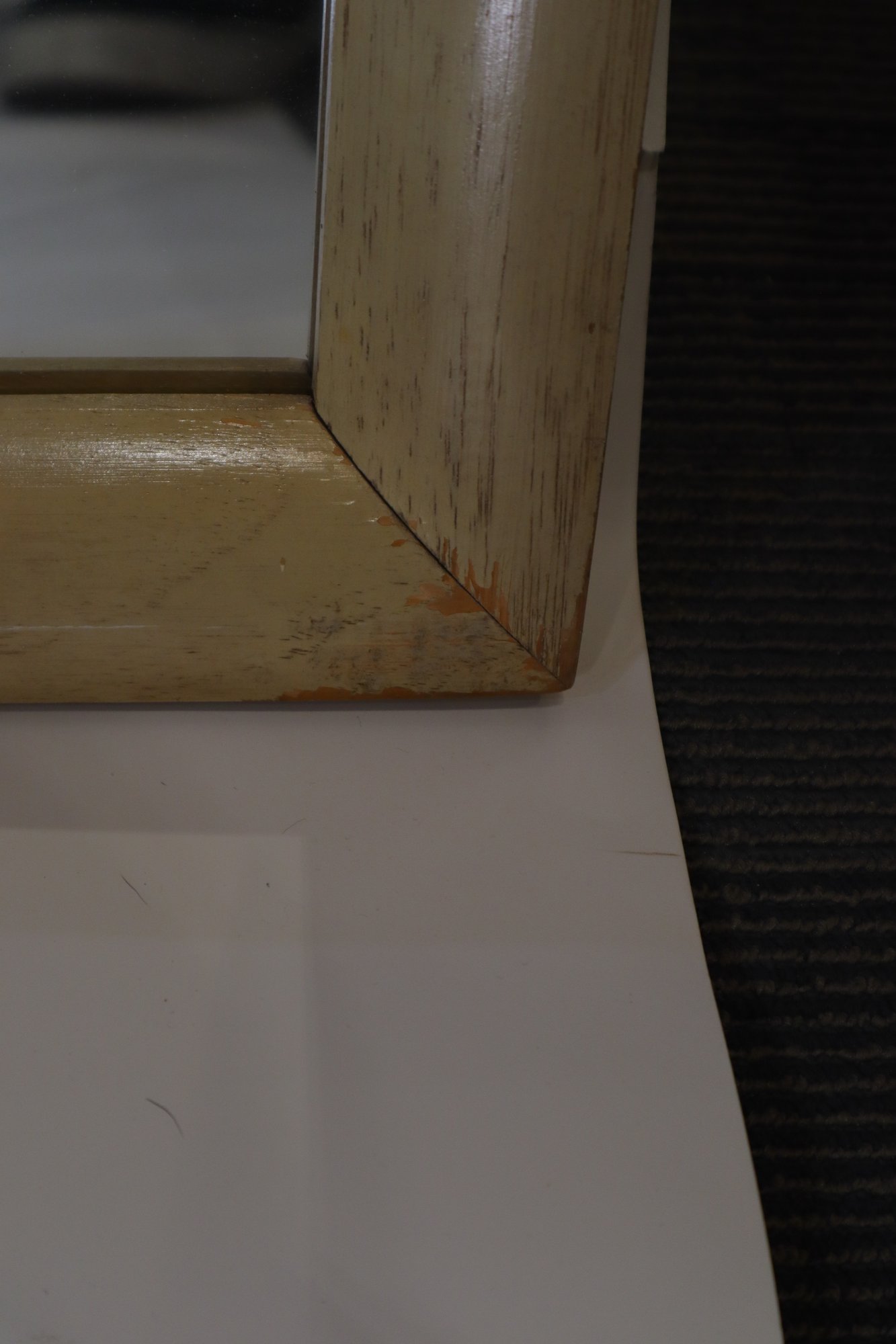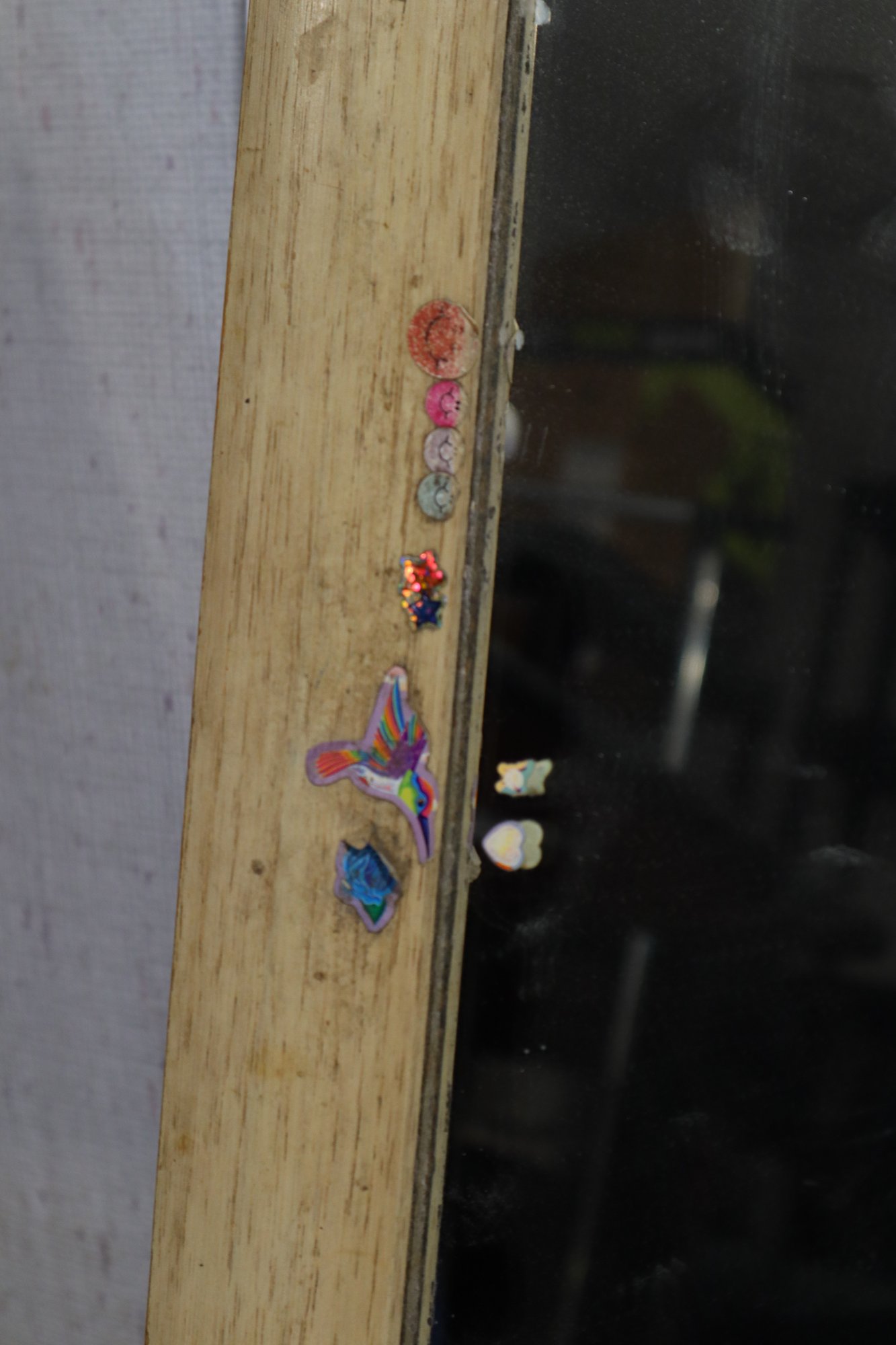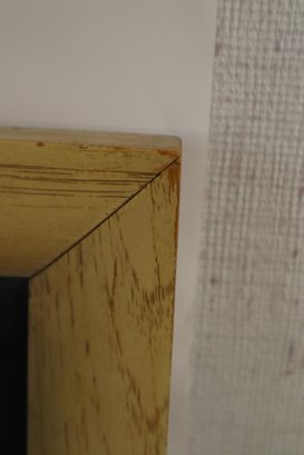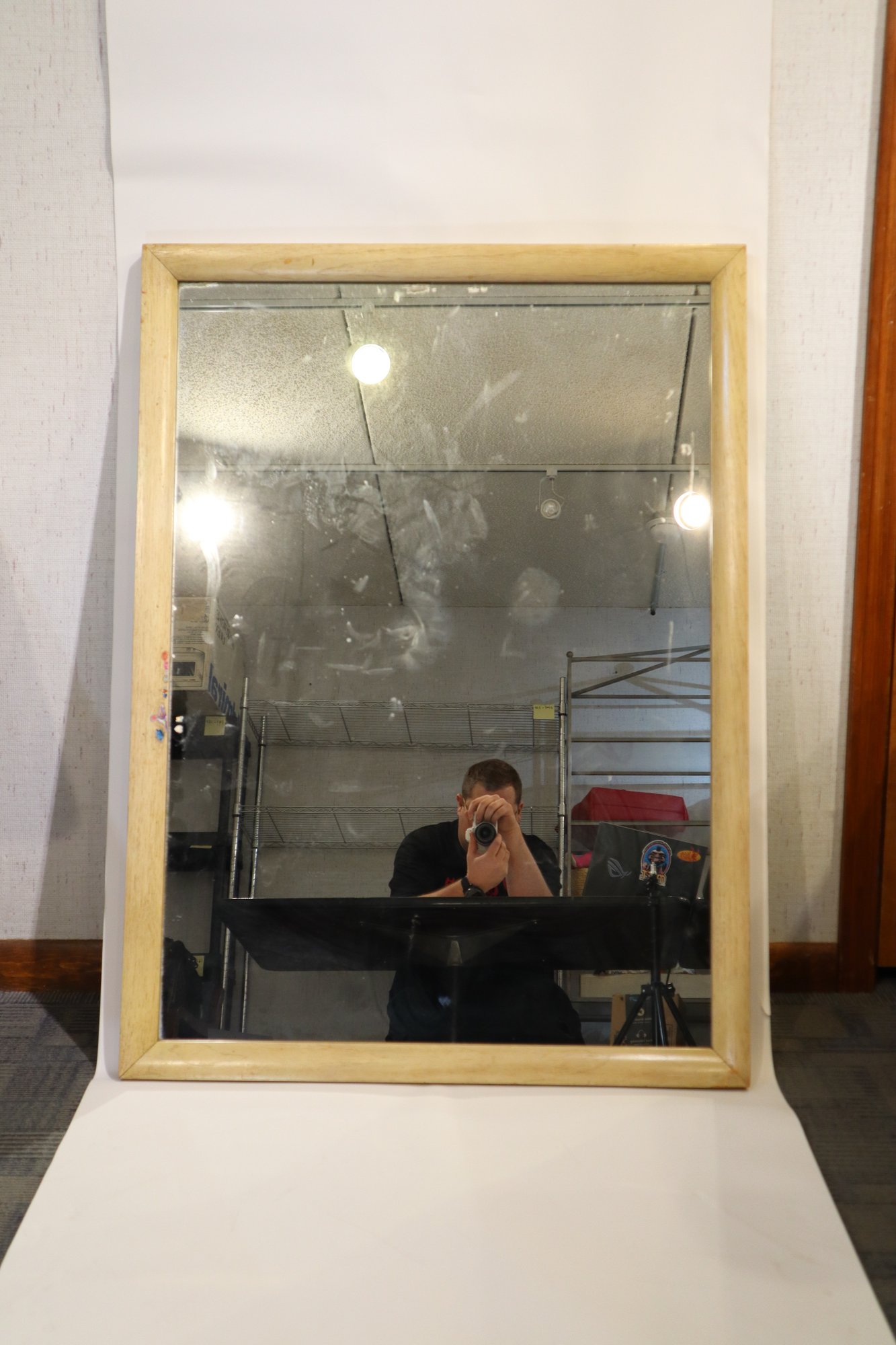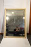 Wood framed mirror, possibly from a vanity or dresser. Slight wear and tear at the corners and prominent edges, and a few stickers on the frame and mirror.