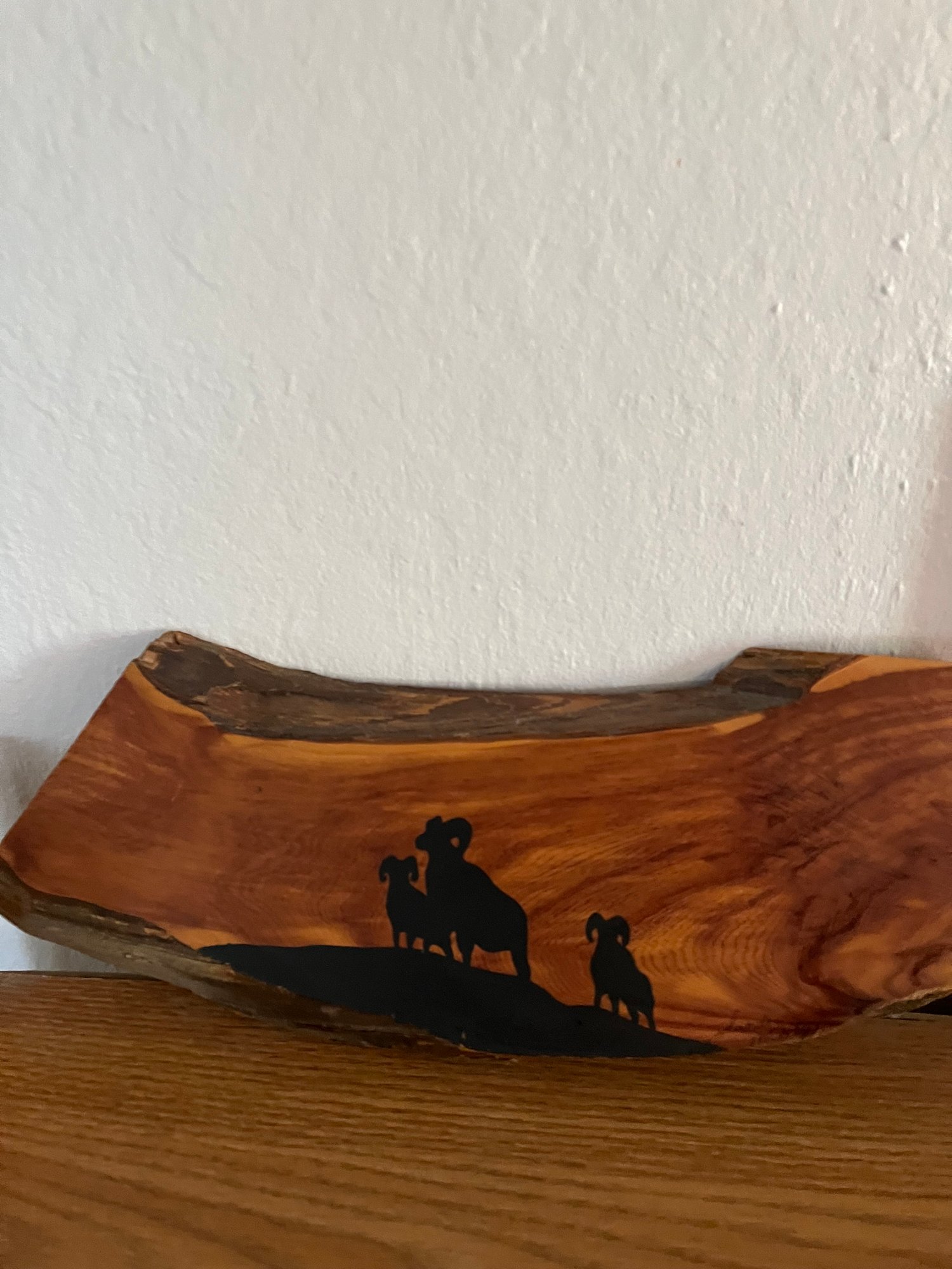 Vintage Rocky Mountain sheep on hangable wood plank by Sandra McIntyre.