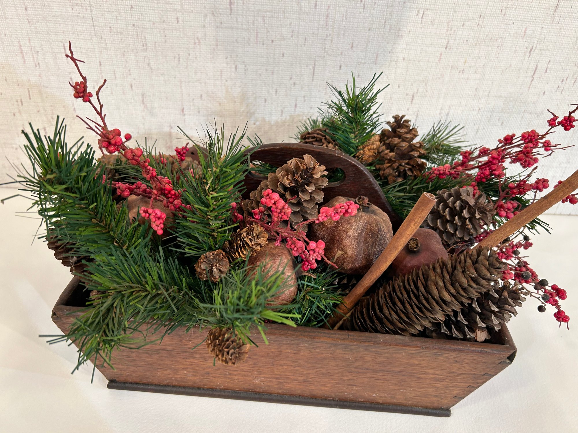 14 x 10 wooden basket, 5.5 inches tall. Filled with festive pine cone potpourri