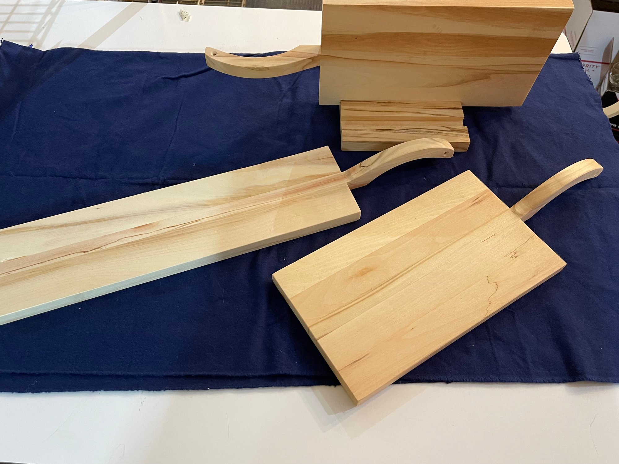 Unfinished wooden serving boards and stands. 5 long and narrow boards, 3 square boards, all with handles. 14 stands, including one that holds a knife. Perfect for painting or staining. These are great for serving but the wood is too soft to use them for cutting boards.