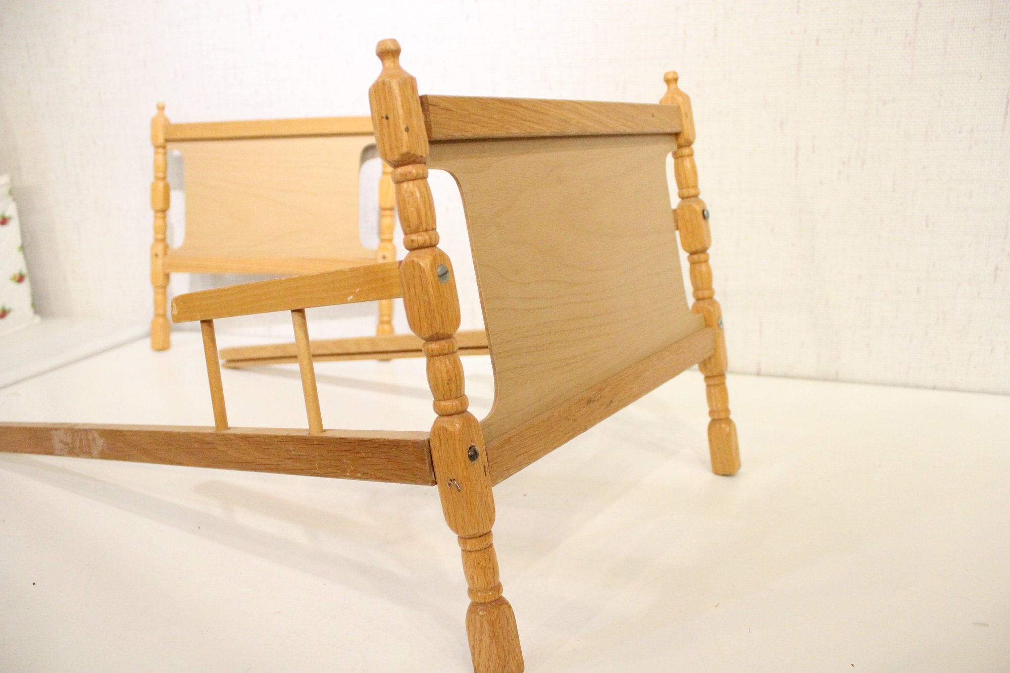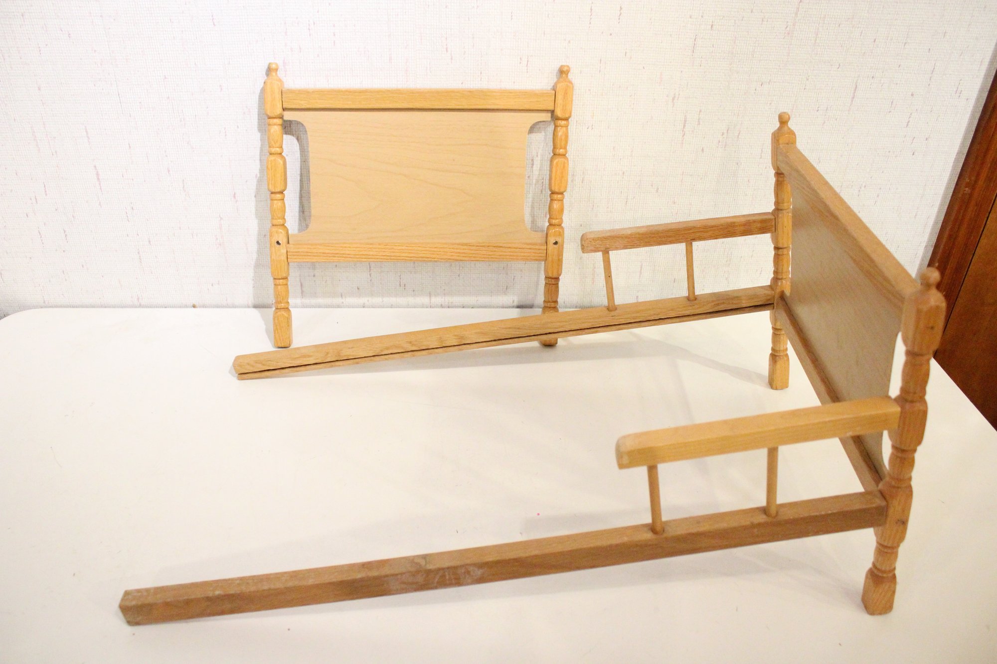 A hand made wooden doll bed frame, needs assembling but all pieces are there and in good condition. Head and foot boards, 13.5" x 14", bed length, 25" long. This item can be shipped.