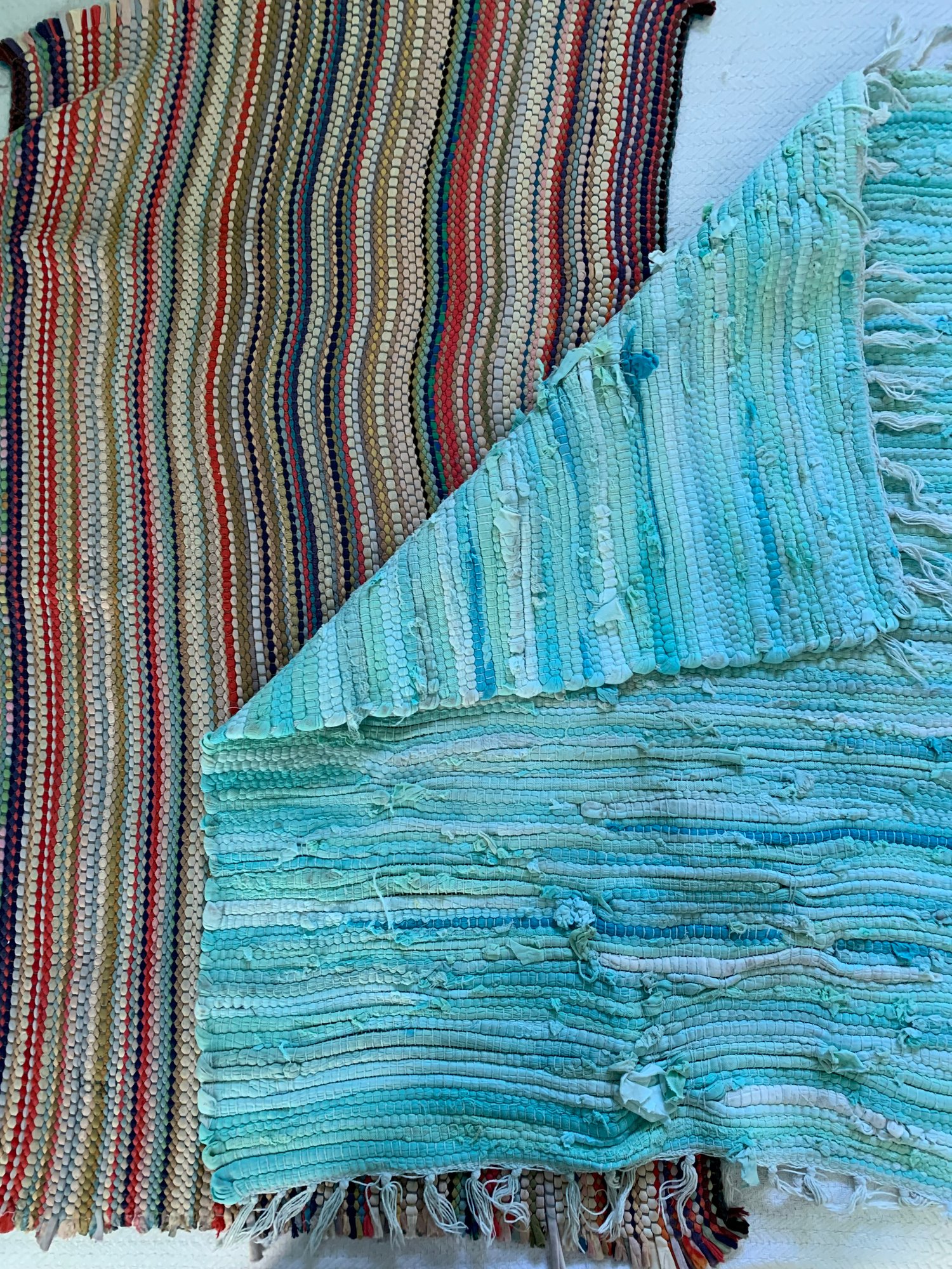 Too Woven rag throw rugs. One multi colored rug with red blue tan and black synthetic fabrics. Loose weave in one place, some discoloration on underside. 42 inches long by 23 inches wide. One green/teal and white cotton rug. Multiple areas with loose weave. Could be easily repaired 32 inches by 26 inches.