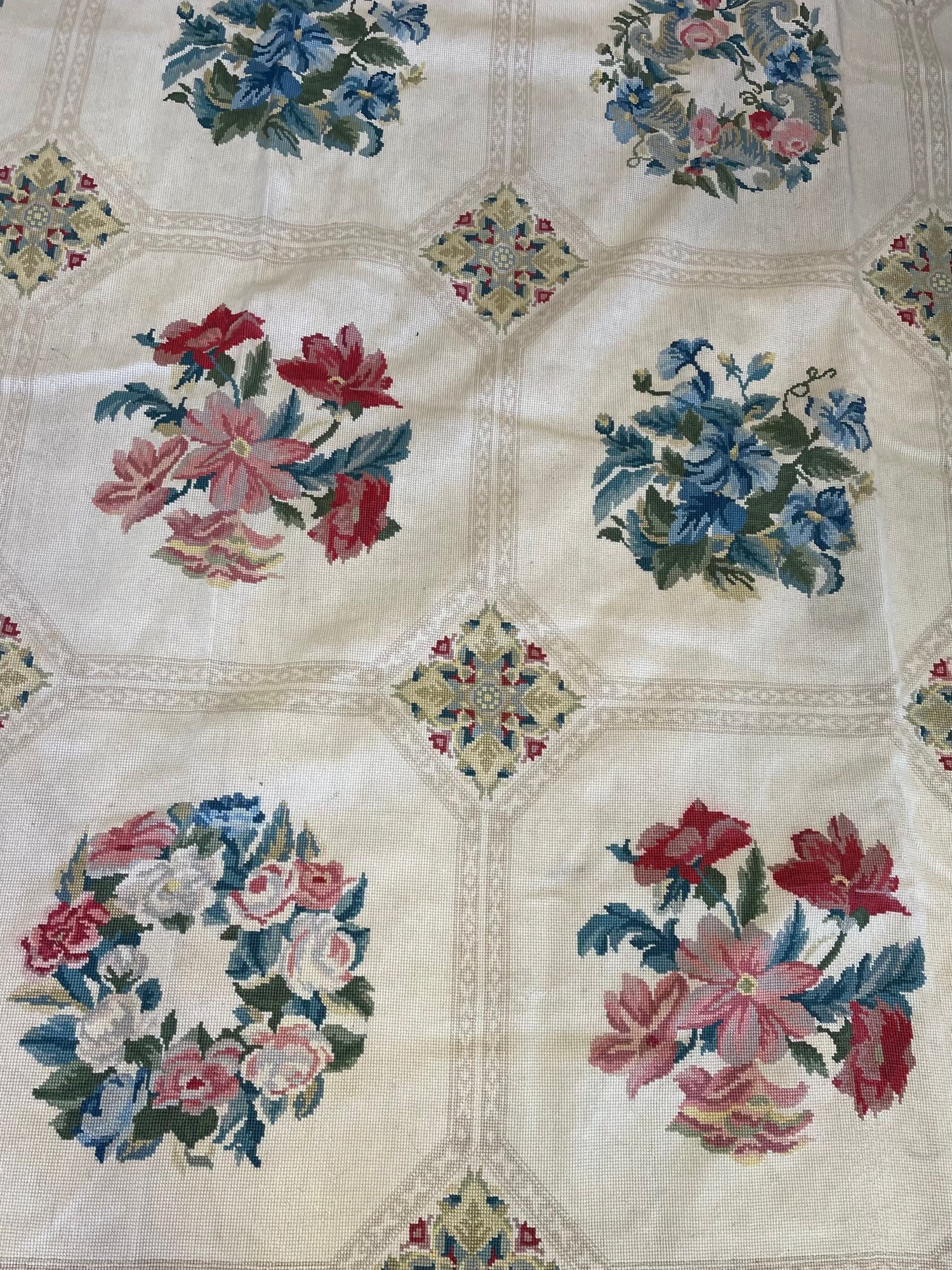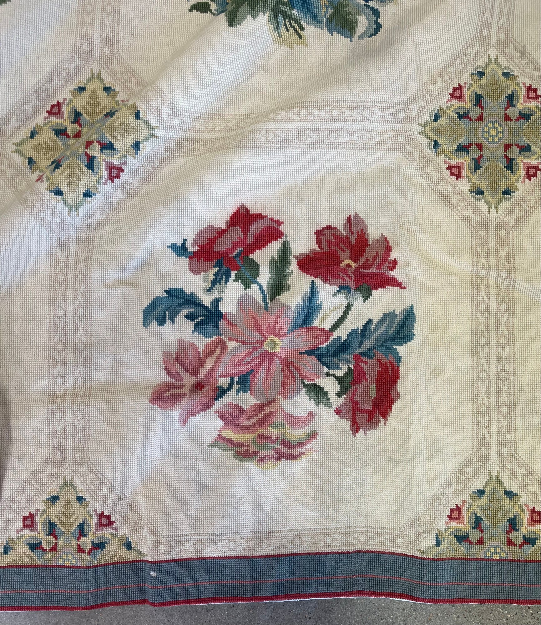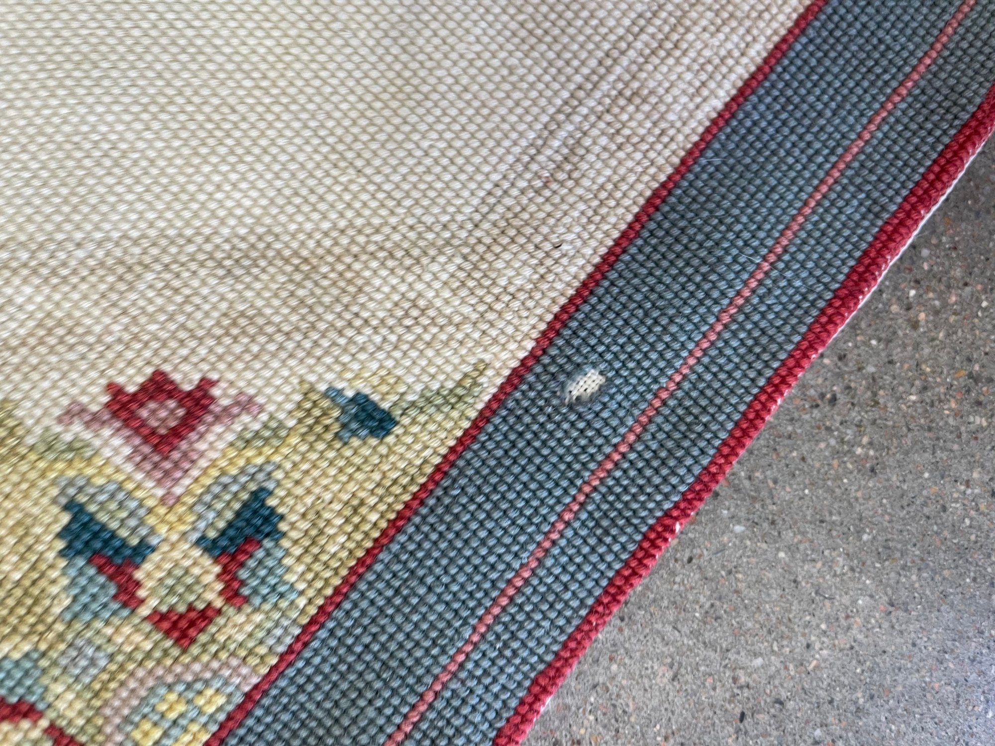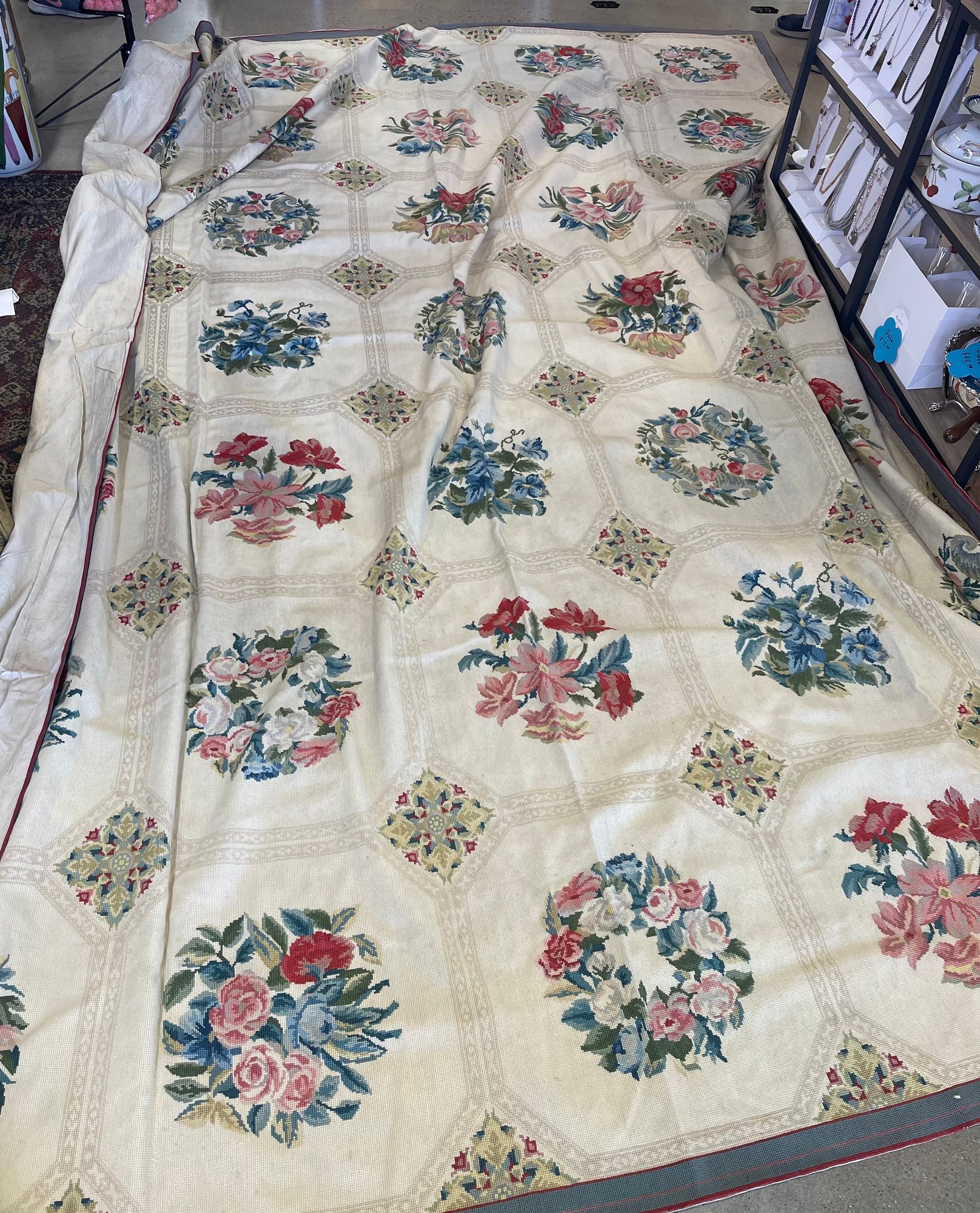 Woven tapestry, with muslin backing. We didn't have space to lay it fully flat! It has been cleaned, though the backing does show some soiling. No odor, and in good condition but on 1/4 inch flaw found in the border - see photo. This could be used as a rug or as a heavy bedspread. It can be shipped, we use Pirate Ship for best rates, but it will not be inexpensive as it weighs over 20 pounds.