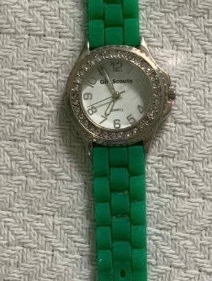Unused Girl Scout watch with green wristband made of rubber material with silver buckle. Approximately 8 1/2 inches long.