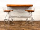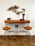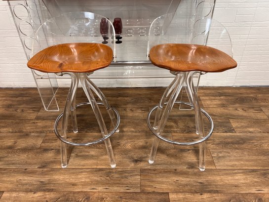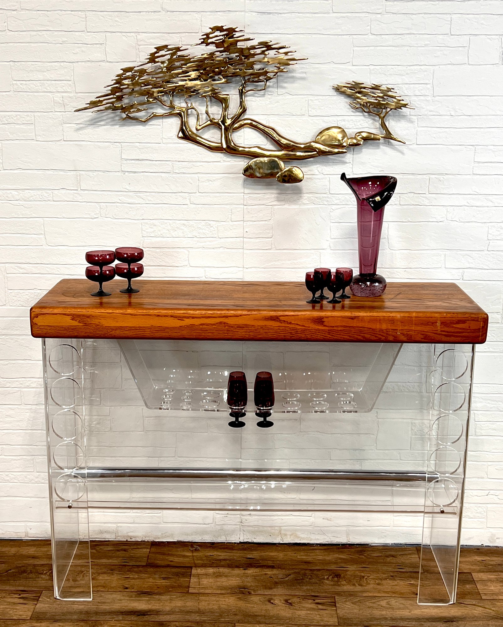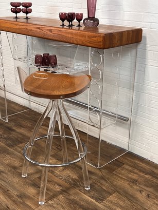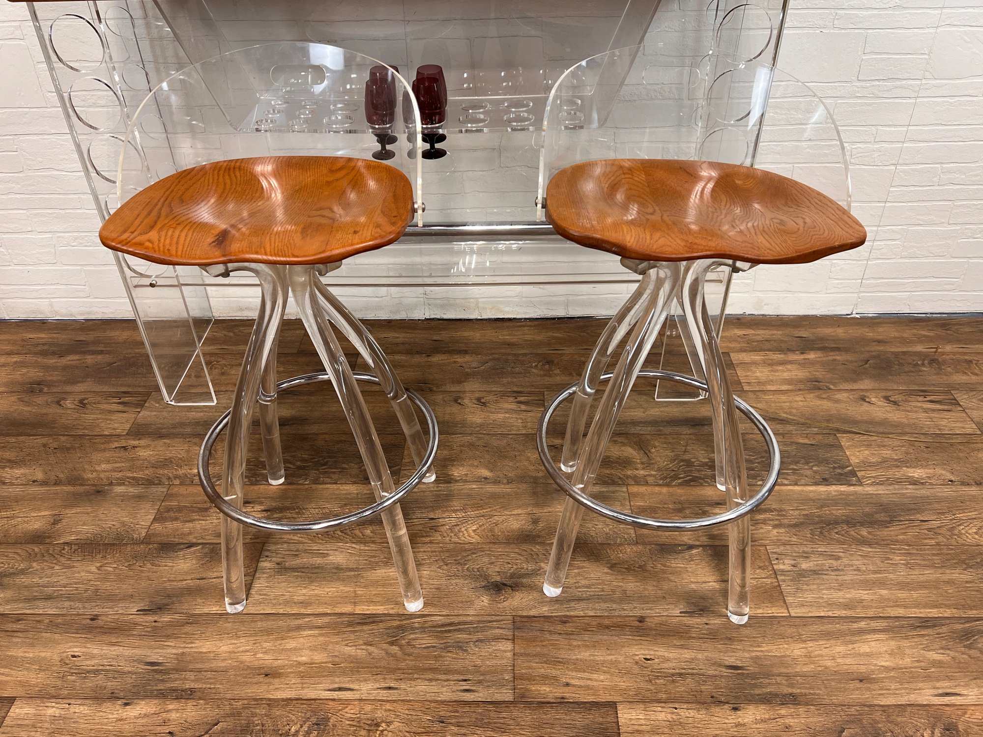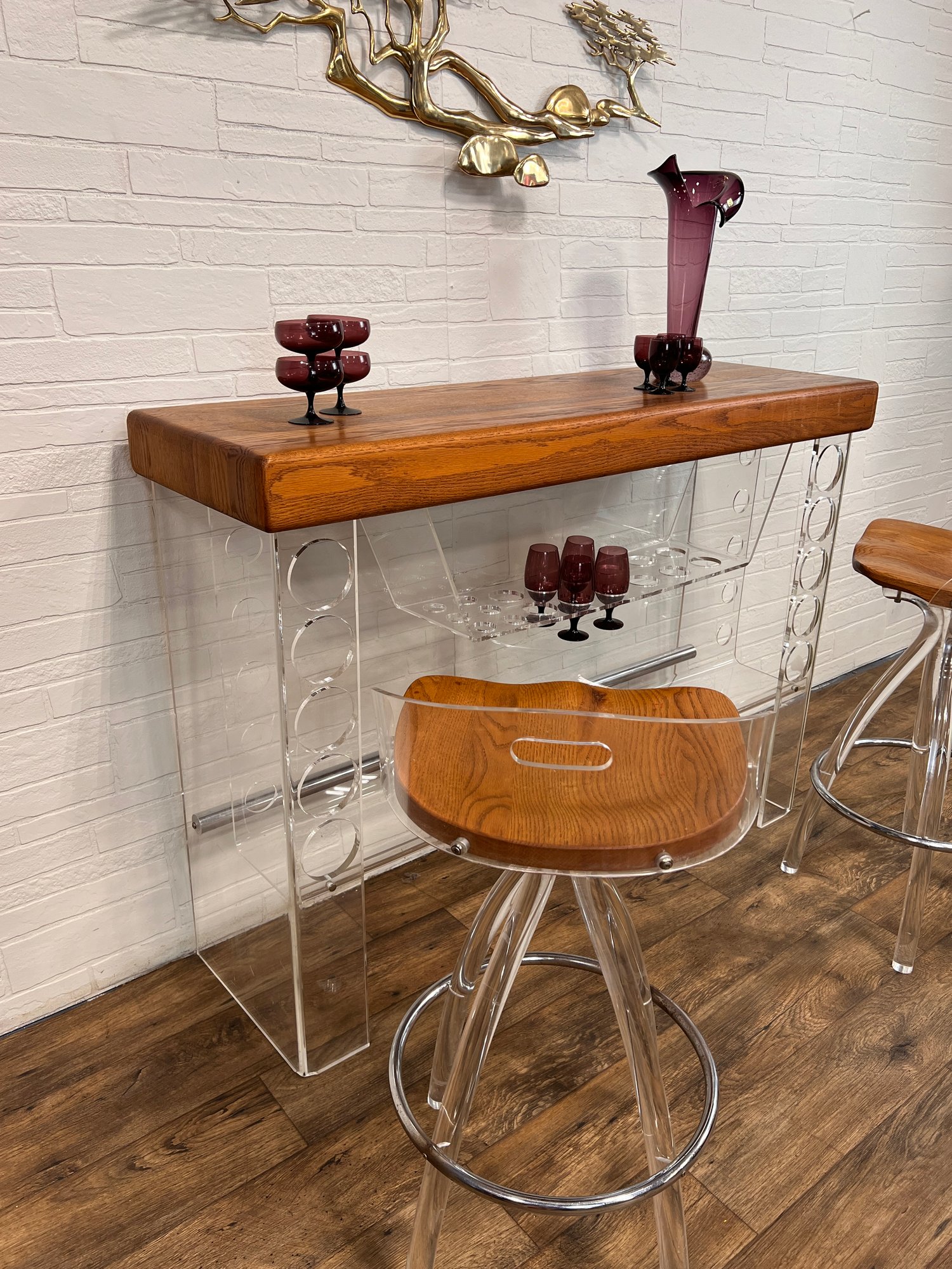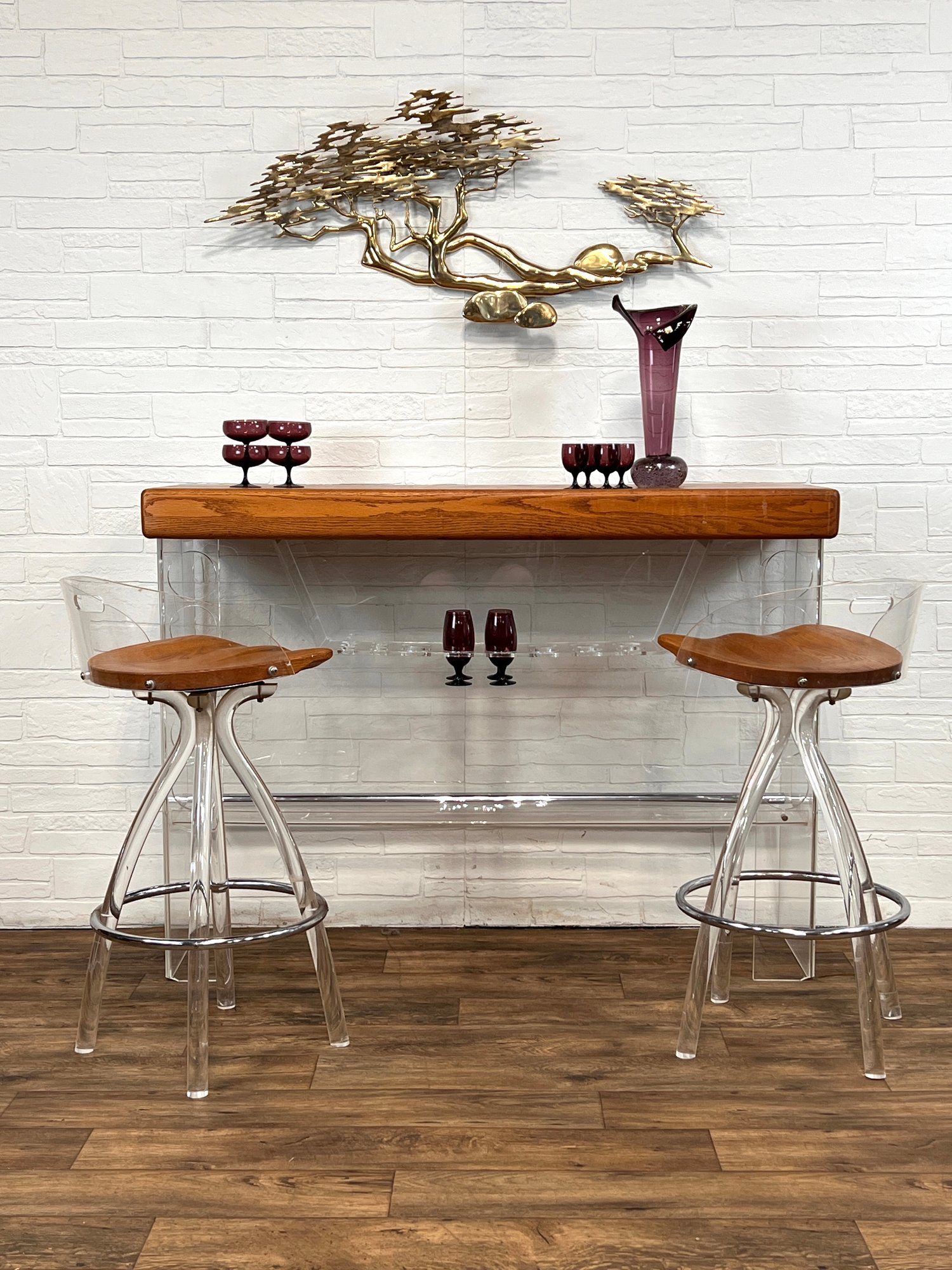Very unique and hard to find original lucite bar with a pair of saddle seat stools, made by hill mfg. co in the 1970s, the lucite does have scratches to the surface, we have not attempted to buff out. The top of the bar does have watermarks. Even with the imperfections, this set is fantastic!