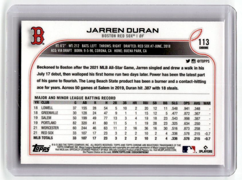2022 Topps Chrome Jarren Duran Pink Refractor Rookie