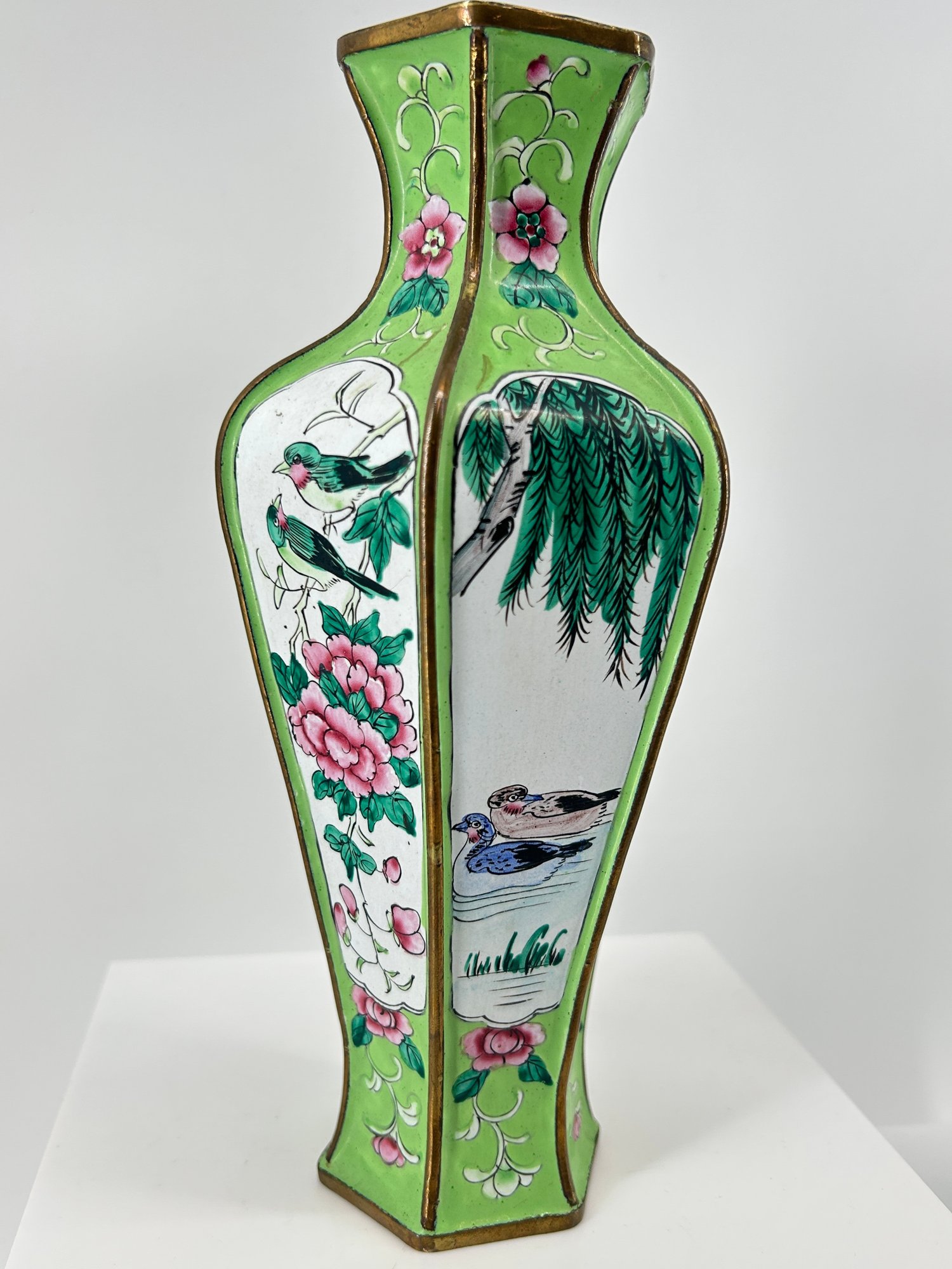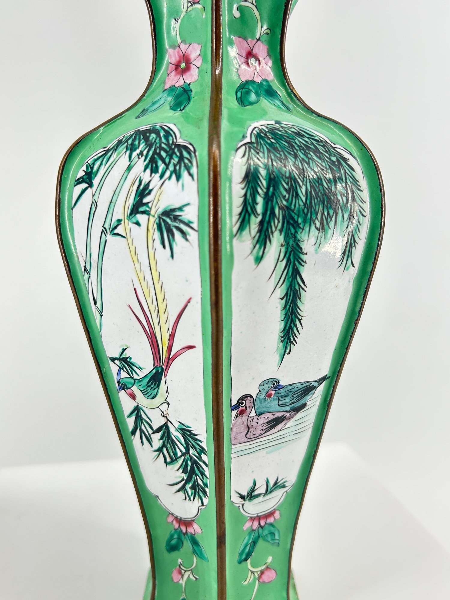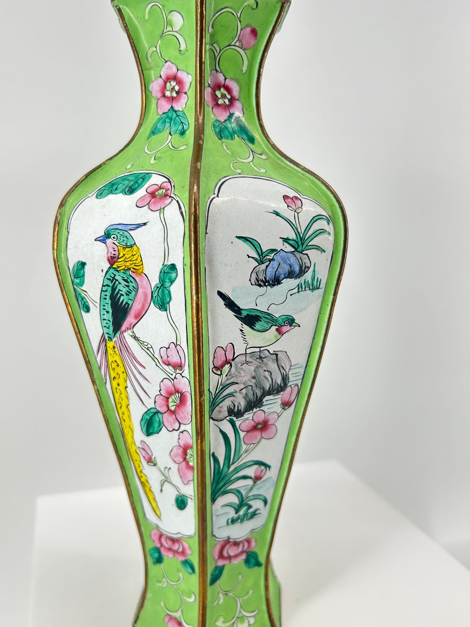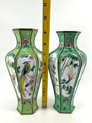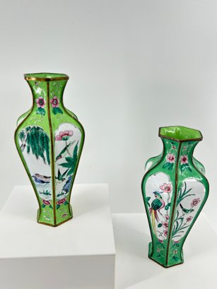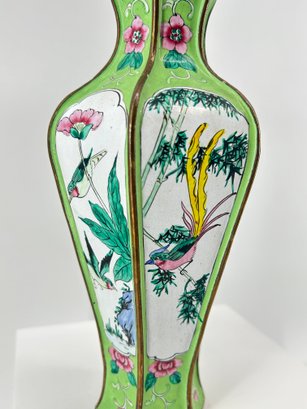 Pair Of Antique Chinese Canton Enamel Hexagonal Vases