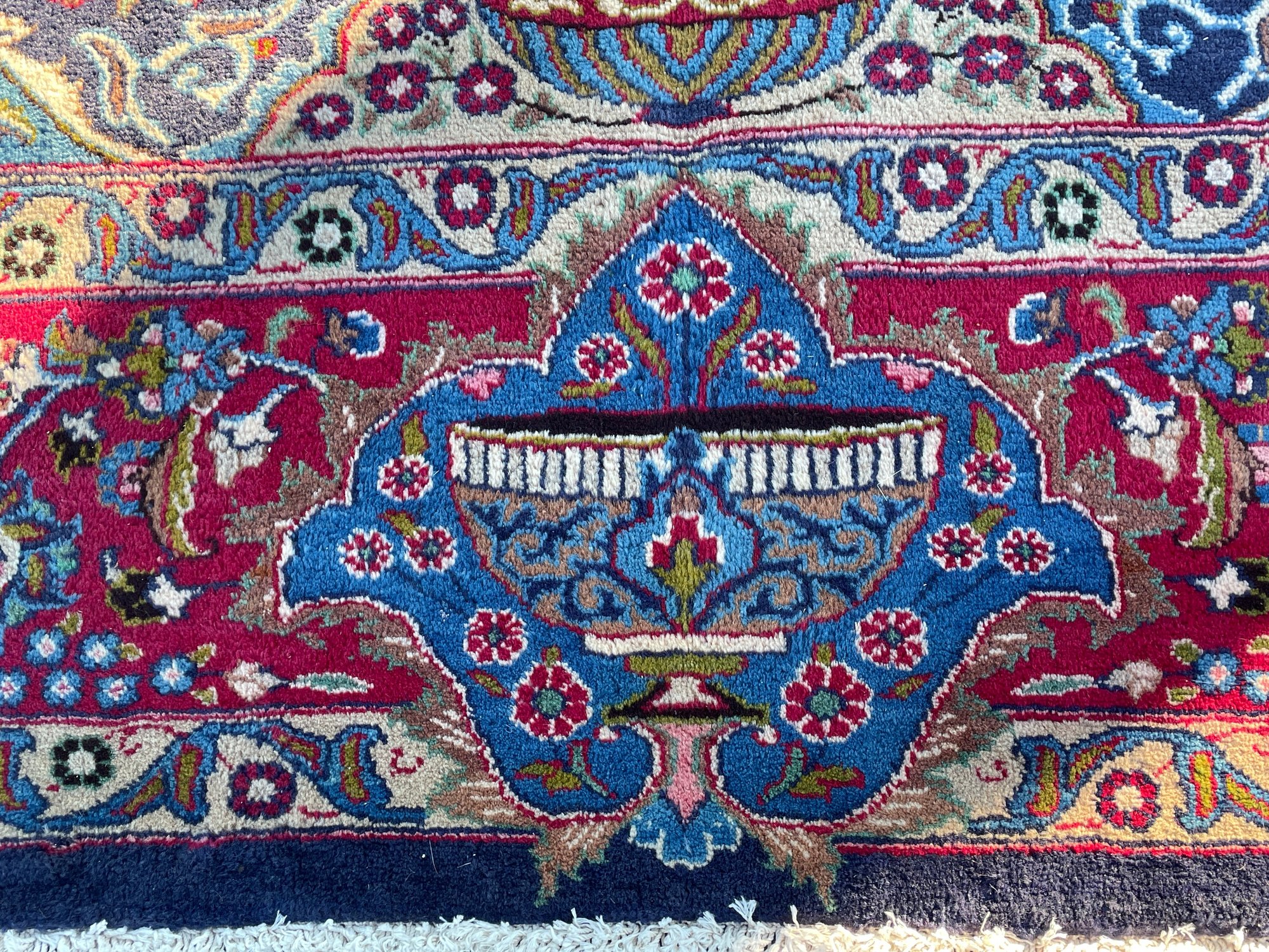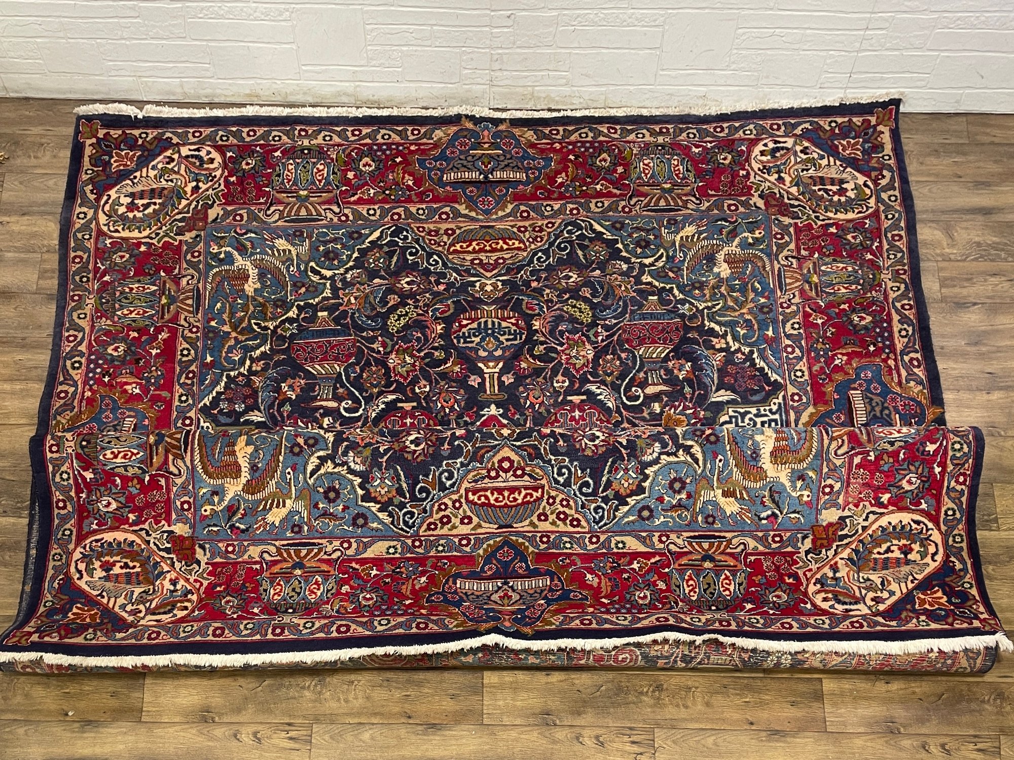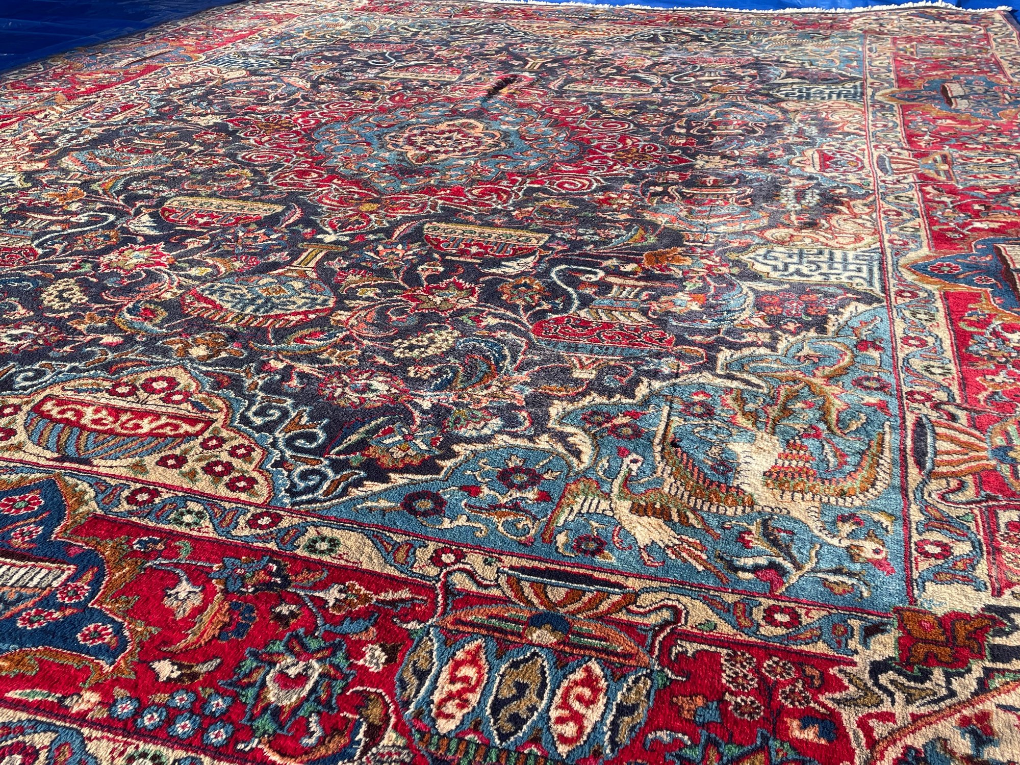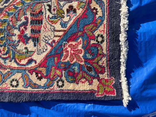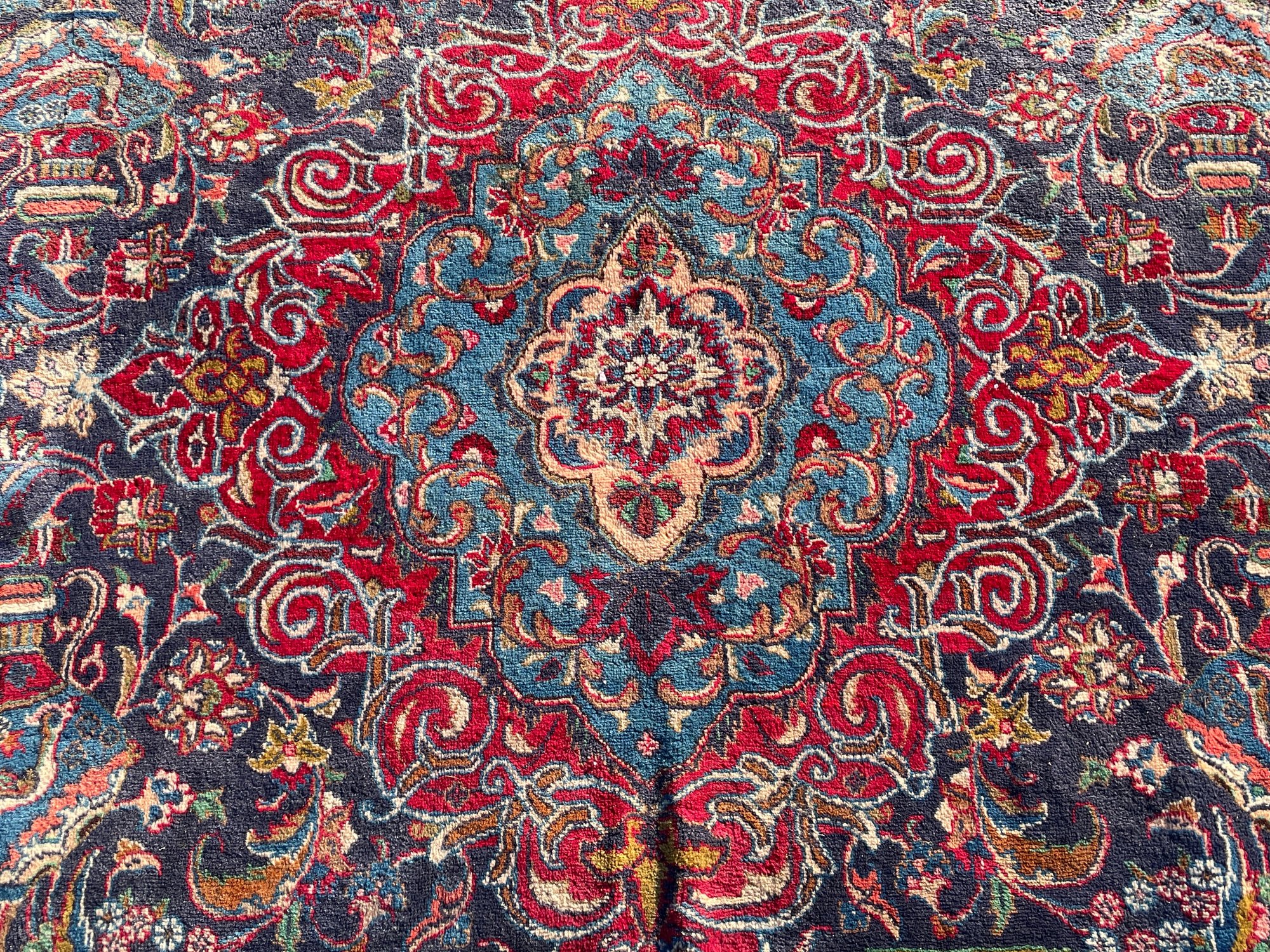 • Design: Traditional central medallion with floral arabesques, vases, and bird motifs in rich red, navy, and turquoise