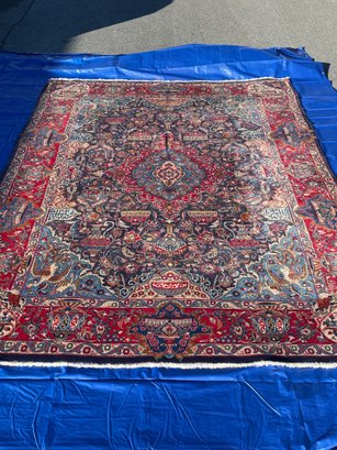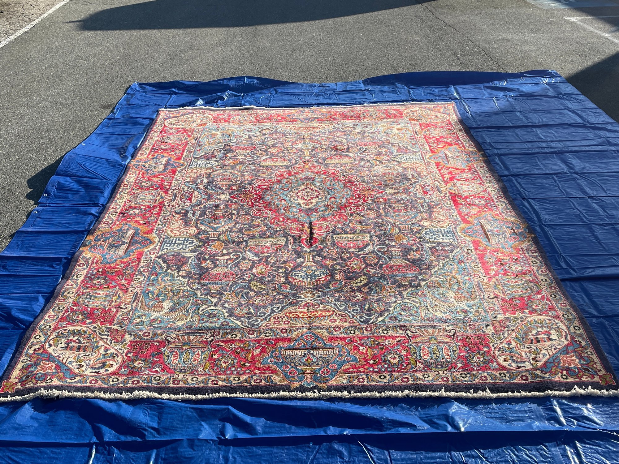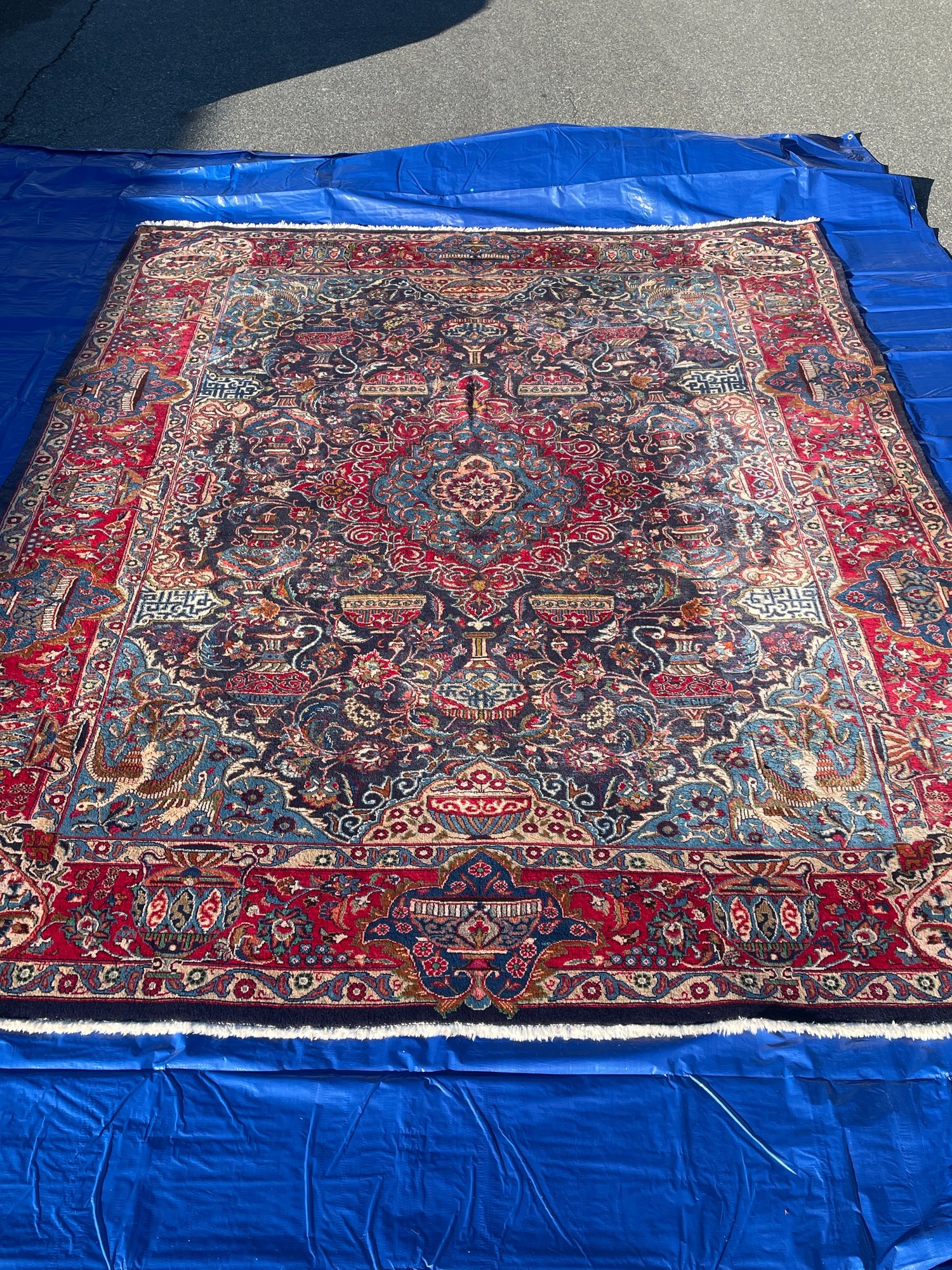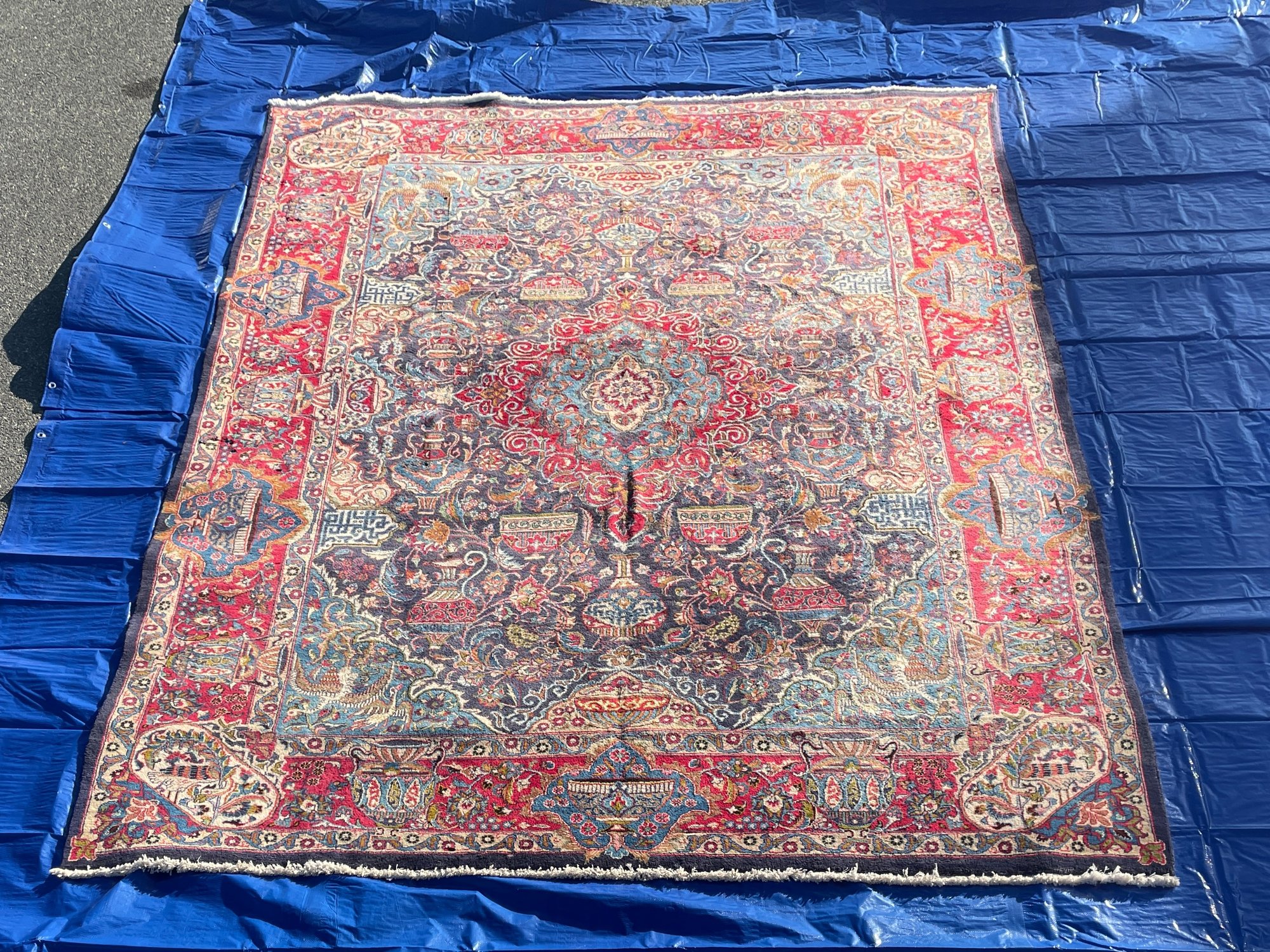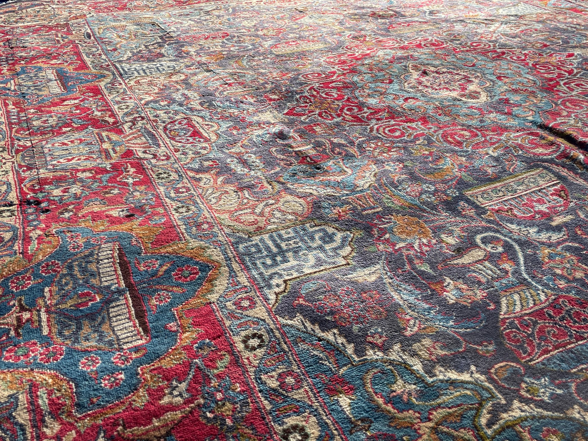 • Design: Traditional central medallion with floral arabesques, vases, and bird motifs in rich red, navy, and turquoise