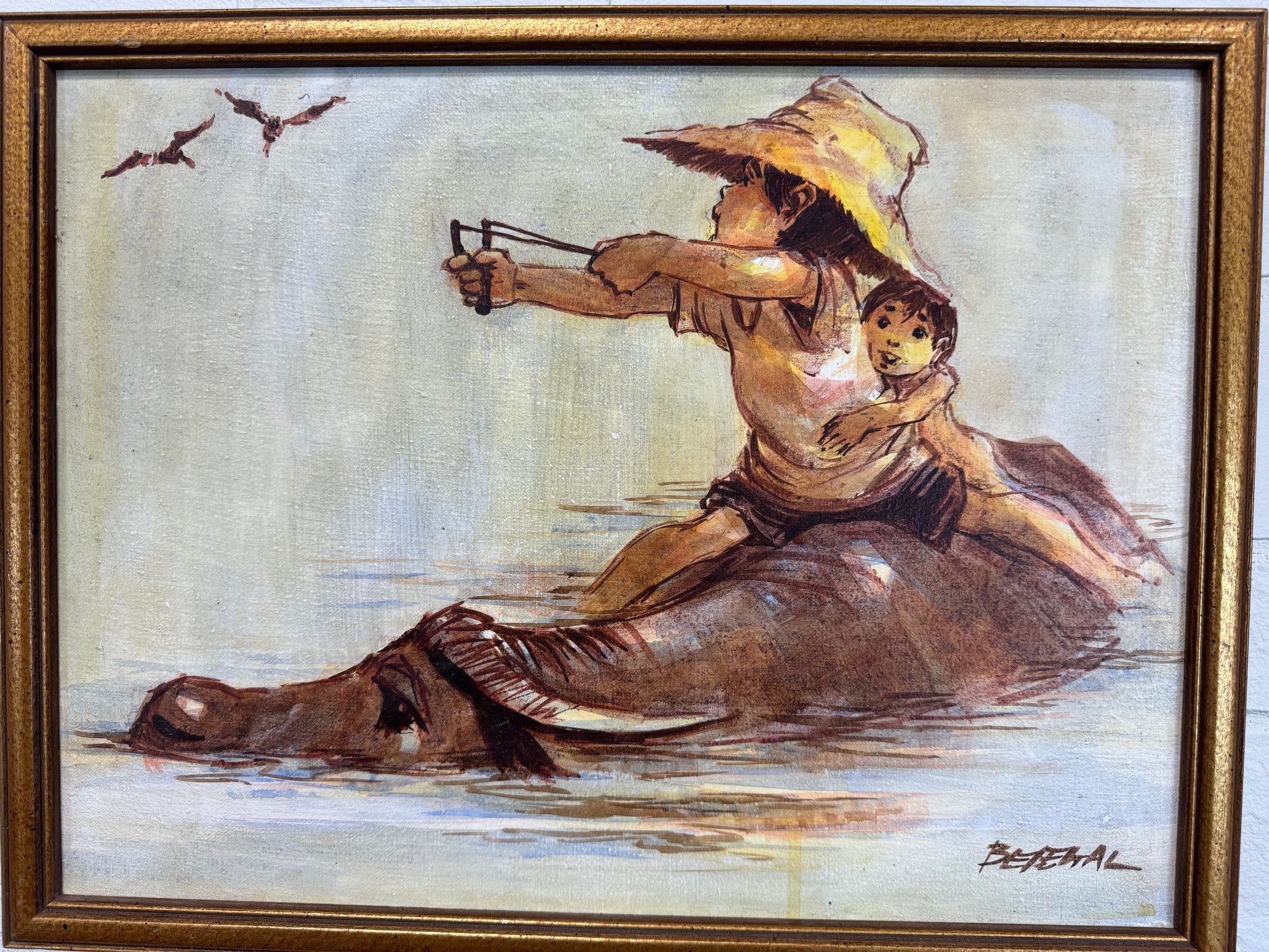Signed Painting On Canvas Bengal Child With Water Buffalo
