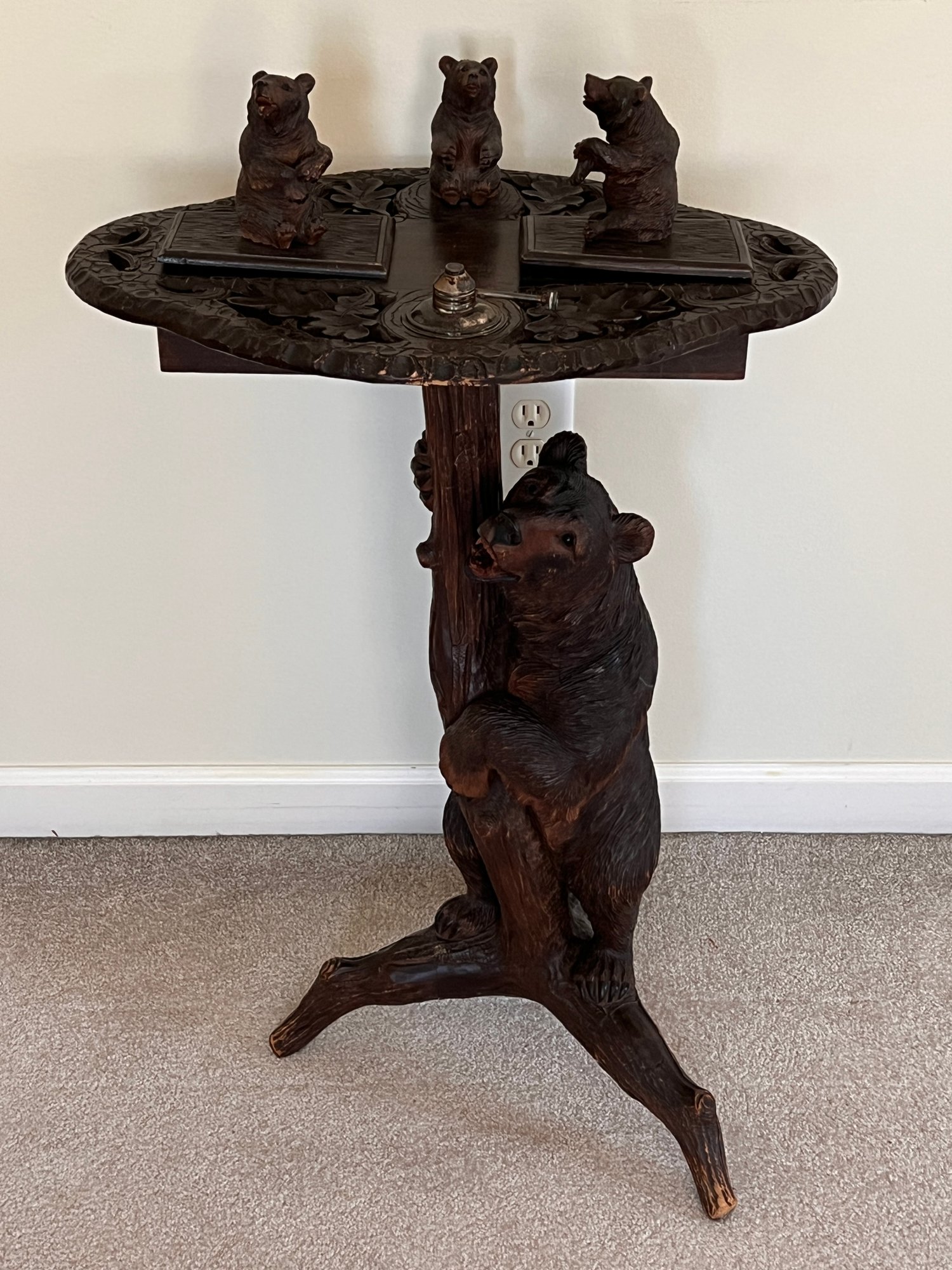 Signs of wear as expected with age, music box atop is not in working condition, there are some lines on the tri -leg base indicative of previous repair. Measurements pictured, please review all photos prior to bidding, there are over 20 photos in this lot for review!
